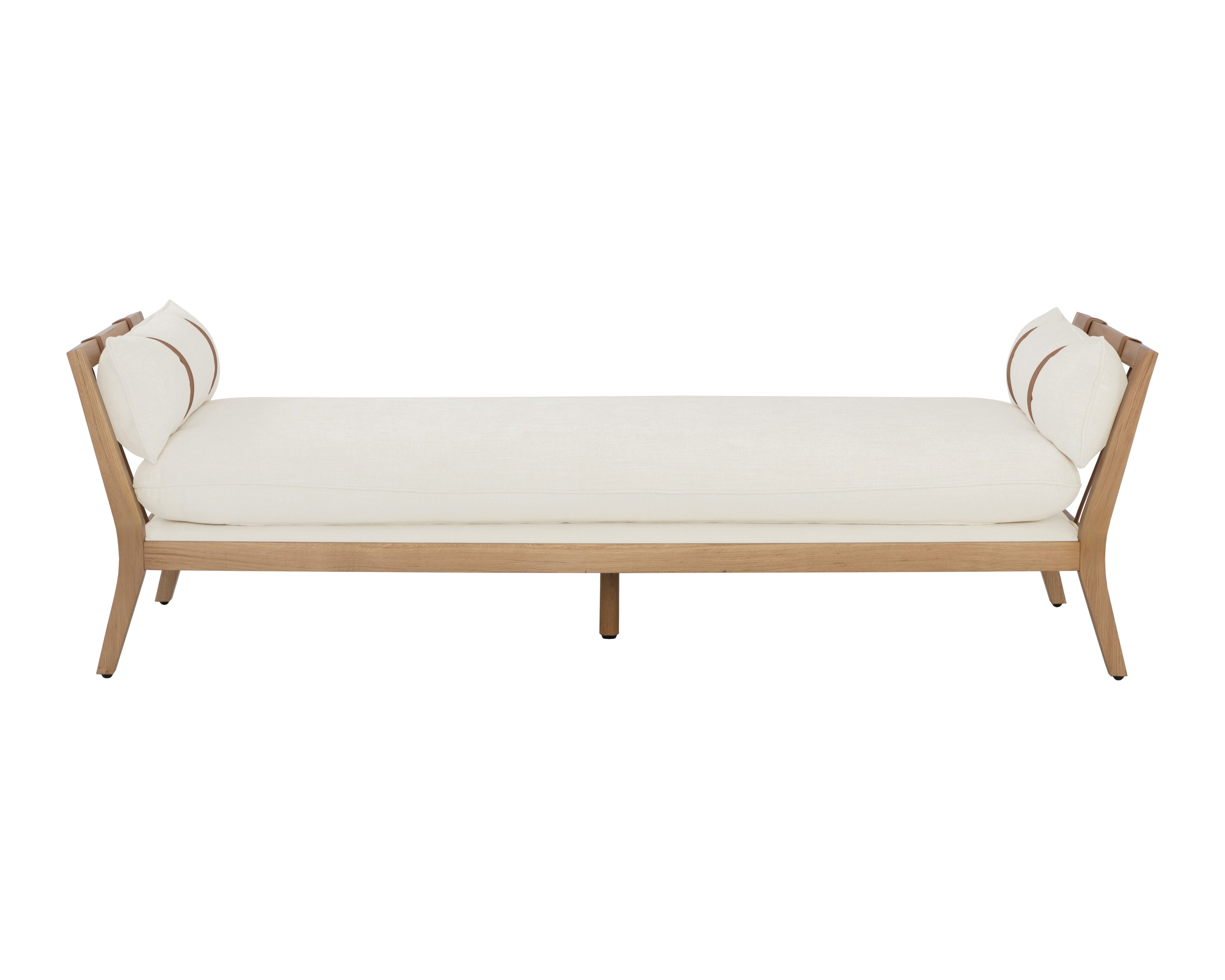Bring space-saving comfort to any living space with the chic Adelina Daybed. Features a slim frame with curved legs built from solid rustic oak wood. Expansive seating is upholstered in heather ivory tweed performance fabric with leather strap detailing on either side. Performance fabric is moisture repellent, durable and easy to clean. As wood is an organic, porous material, these pieces will contain natural variation of texture and may also exhibit fine indentations and cracks. Wood pieces will also display a disparity of colour and grain, and visible knots and burls that add to the character of each piece. Handle with Care: This design has been crafted with 100% leather. Leather is a natural material; as such, colour variations, markings, wrinkles, grooves and light scratches are acceptable and appreciated characteristics. No two pieces are alike. Visit our Product Care page for more information on how to ensure the lasting beauty of this piece.