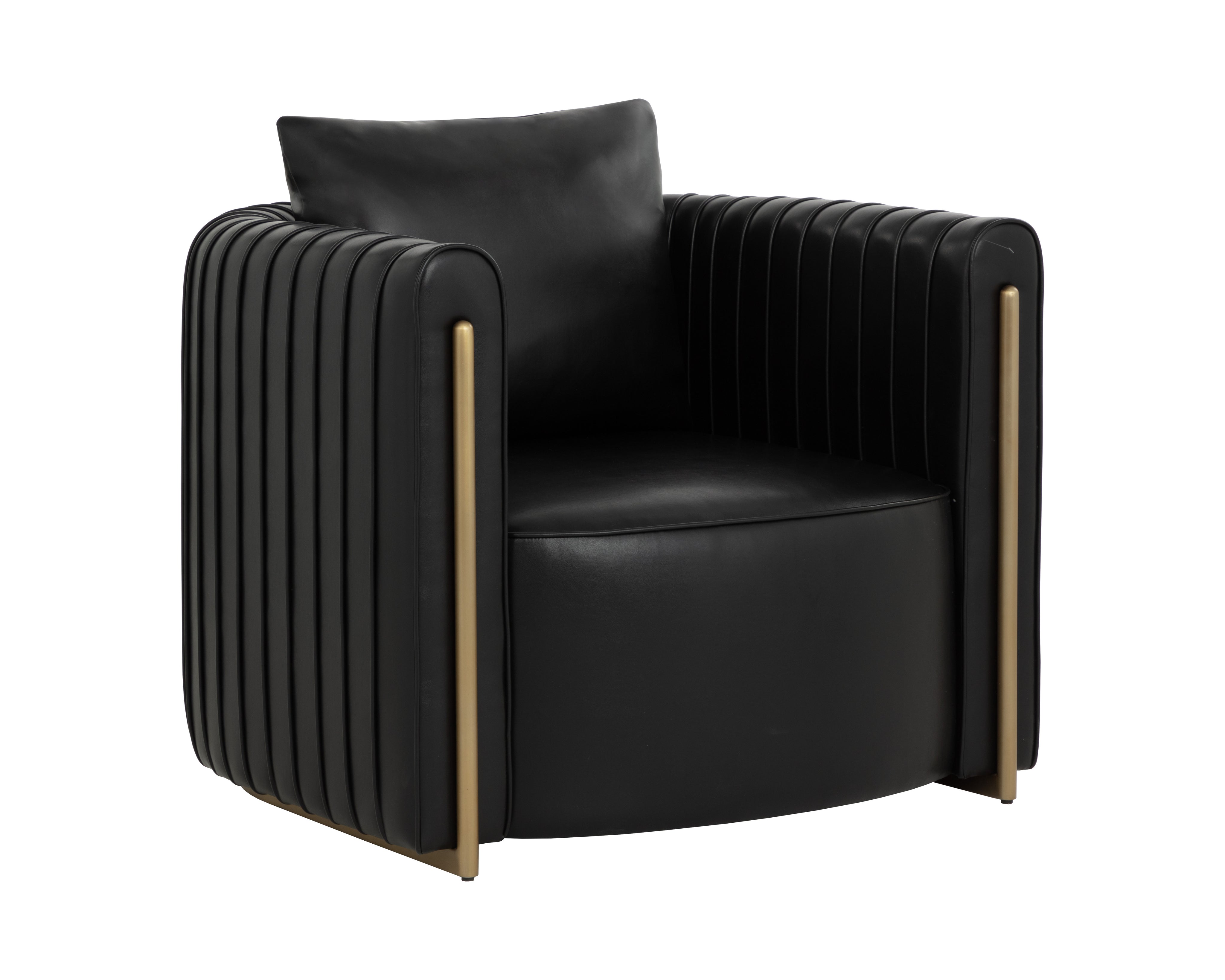 The Alix Lounge Chair is elevated comfort with a touch of glamour. A luxuriously rounded frame is upholstered in cantina black faux leather. Channeled piping and gold stainless steel detailing on the front and back add visual allure from every angle.