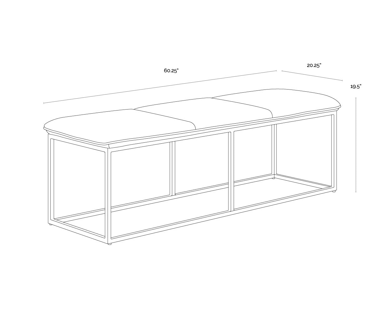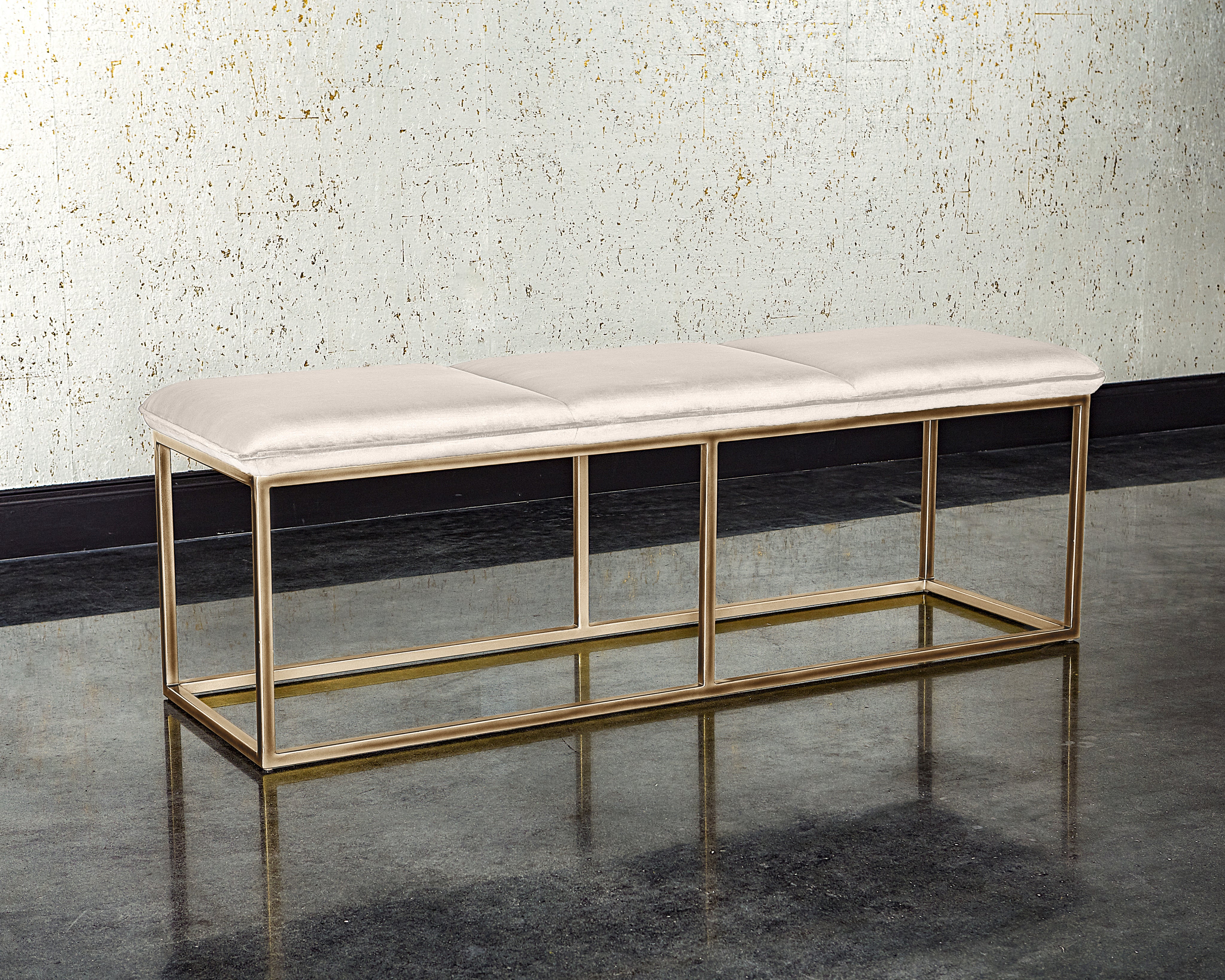 This bench combines transitional style with luxurious elements. Features an exposed rustic bronze steel frame and a piccolo prosecco performance fabric seat. Performance fabric is moisture repellent, durable and easy to clean.
