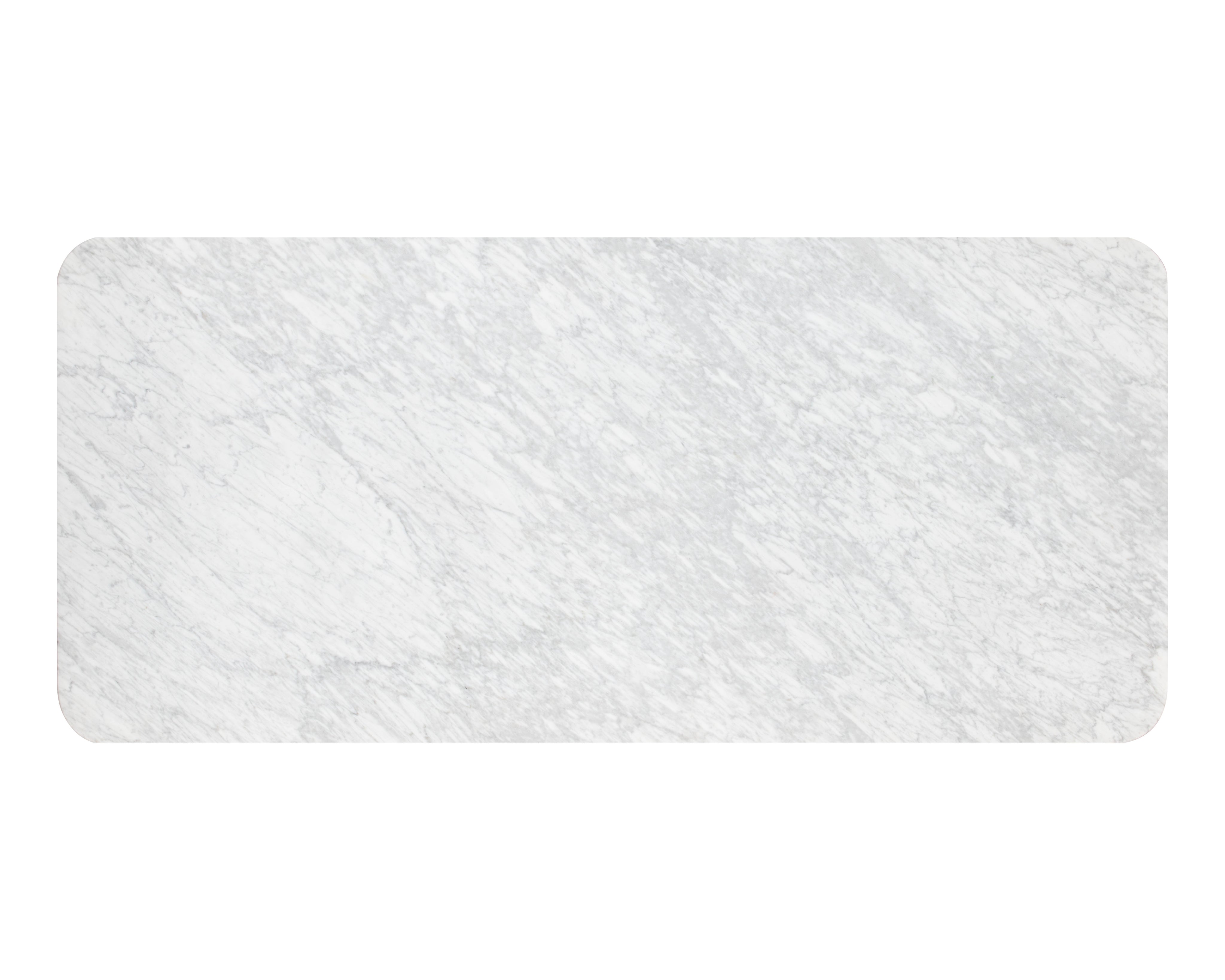 This intriguing dining table will bring art deco styling to dining spaces. Crafted with a beautiful white marble top featuring rounded edges and a contemporary antique brass t-frame base. Seats up to six. As marble is a natural material, unique veining, pitting, fissures, micro-cracks and colour variations are all characteristics that add to the uniqueness and beauty of each piece.