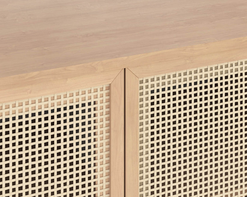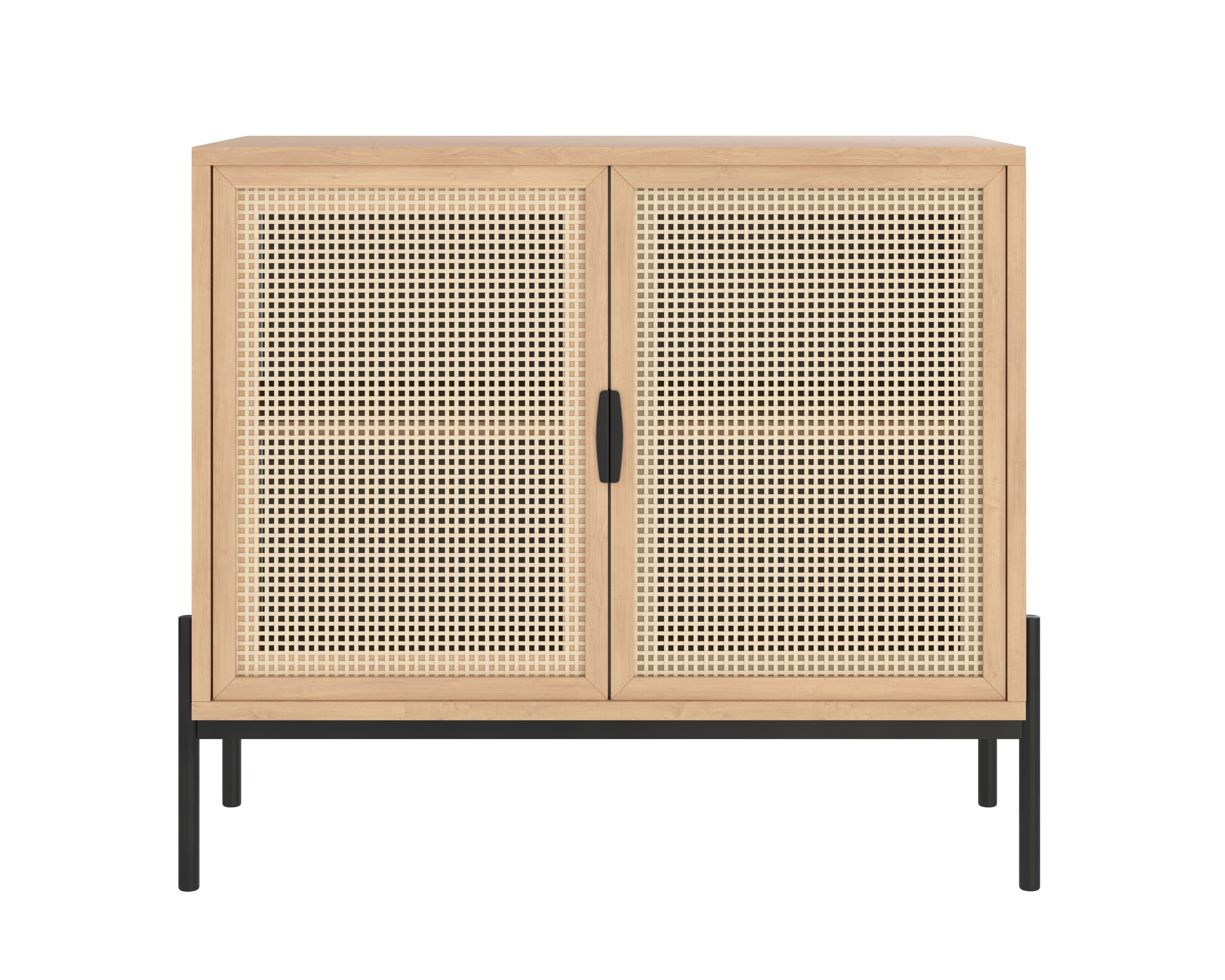Create a space influenced by global travels with this stylish sideboard crafted in Indonesia. Features two natural rattan cabinets contrasted with a rustic oak wood frame. Black iron feet and matte black iron handles complete the design.