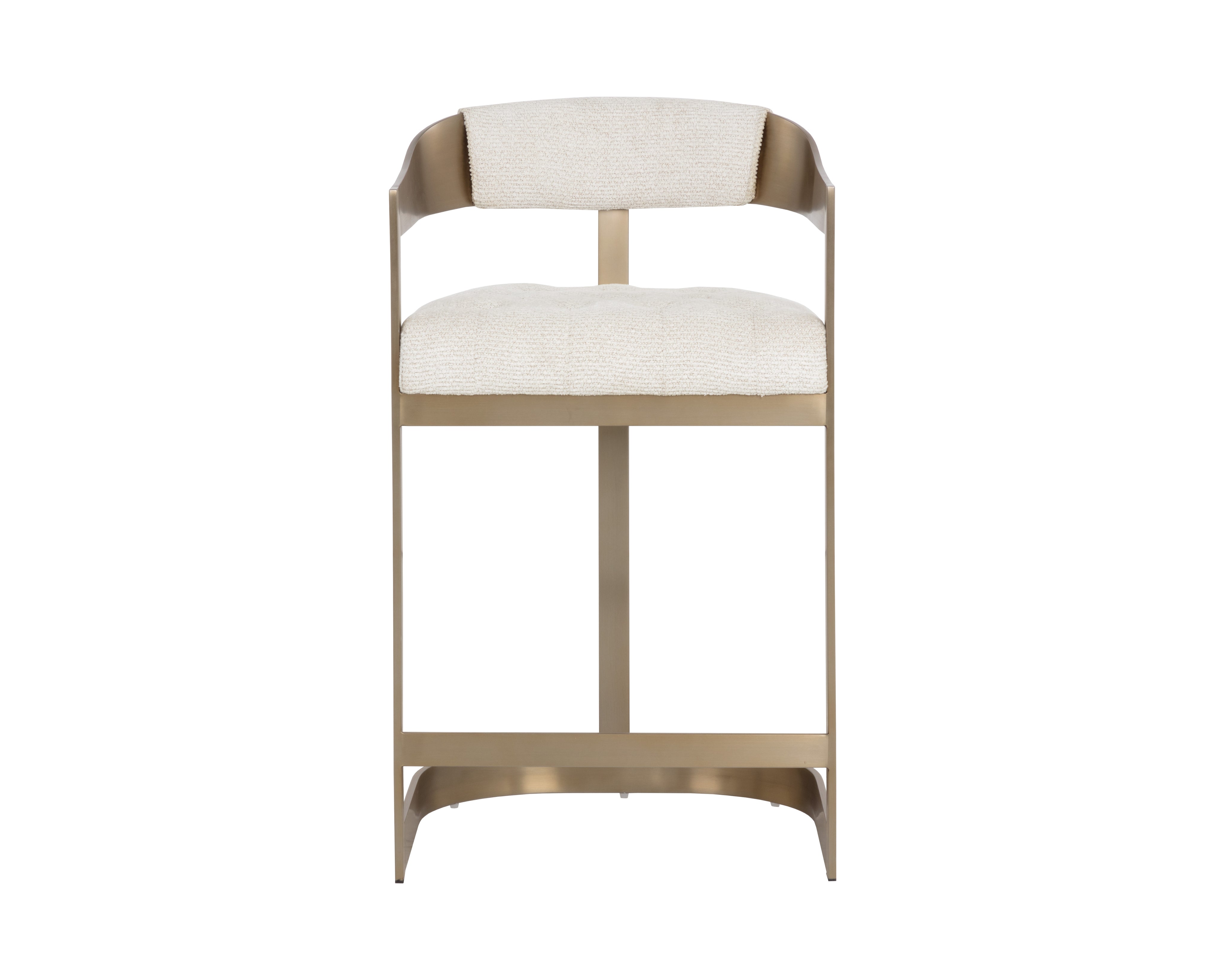 This ultra contemporary counter stool features a T-shaped back, tapered arms and an antique brass crown base. Stocked in black bonded leather. Perfectly suited for various dining, kitchen and bar spaces of commercial and residential settings.
