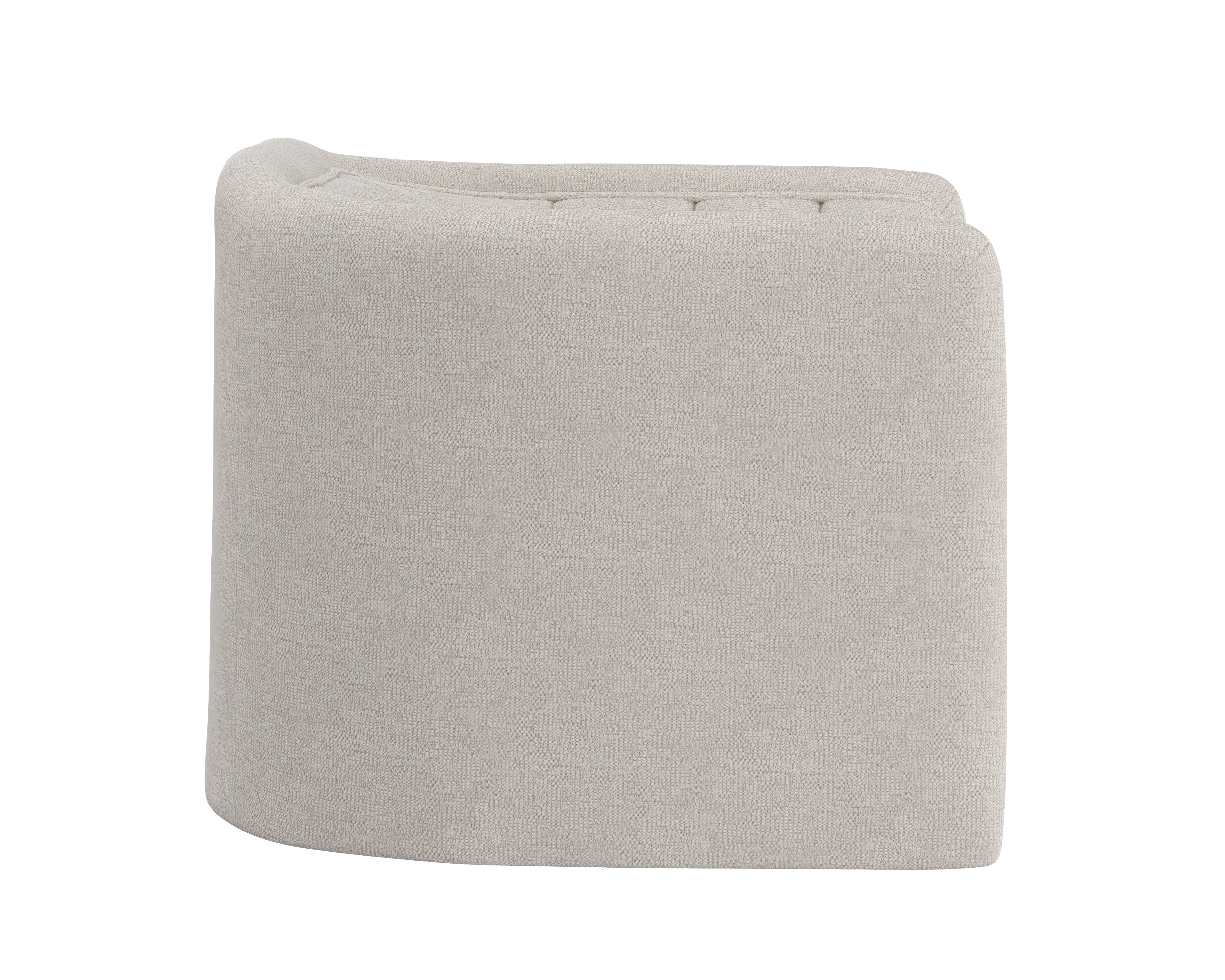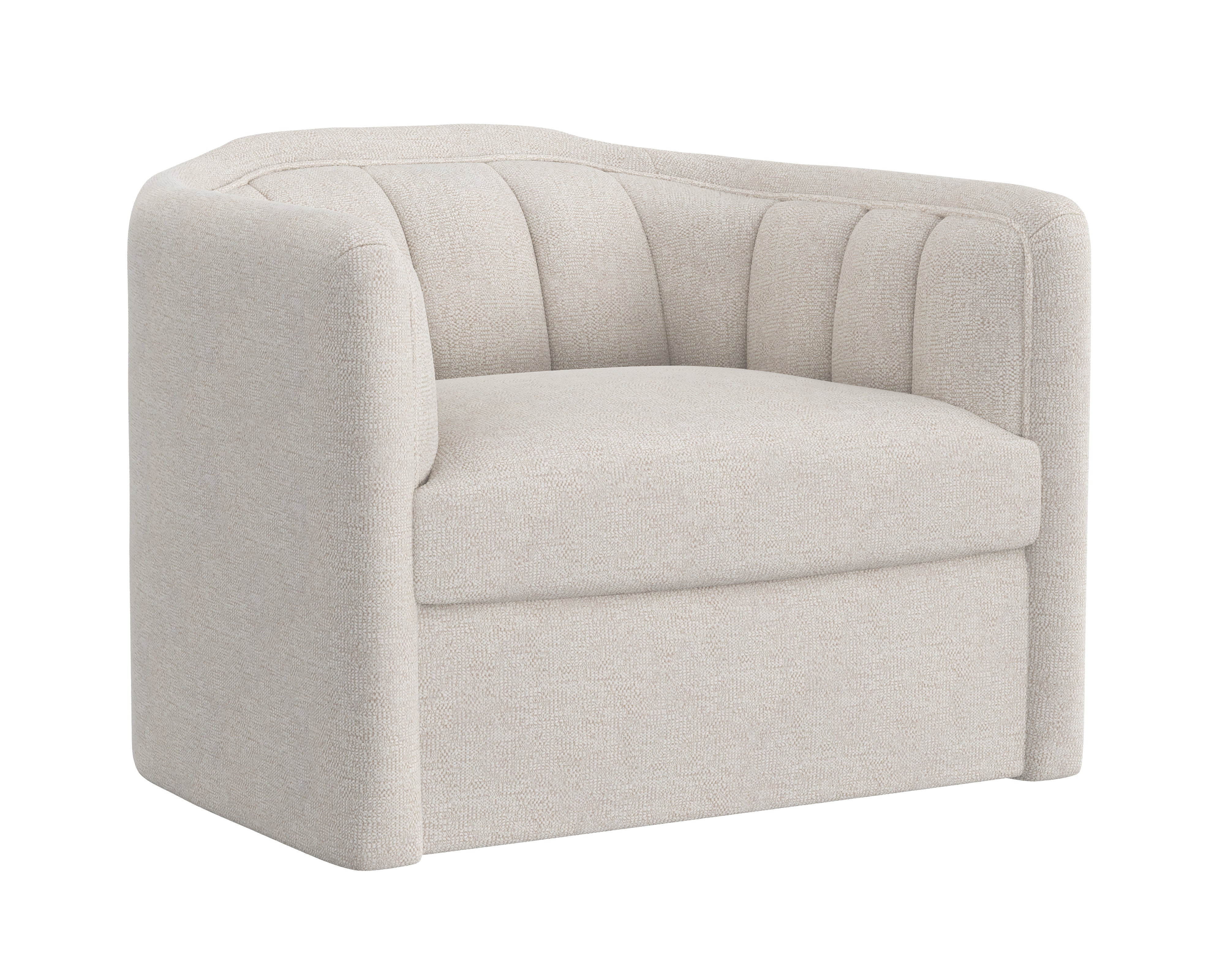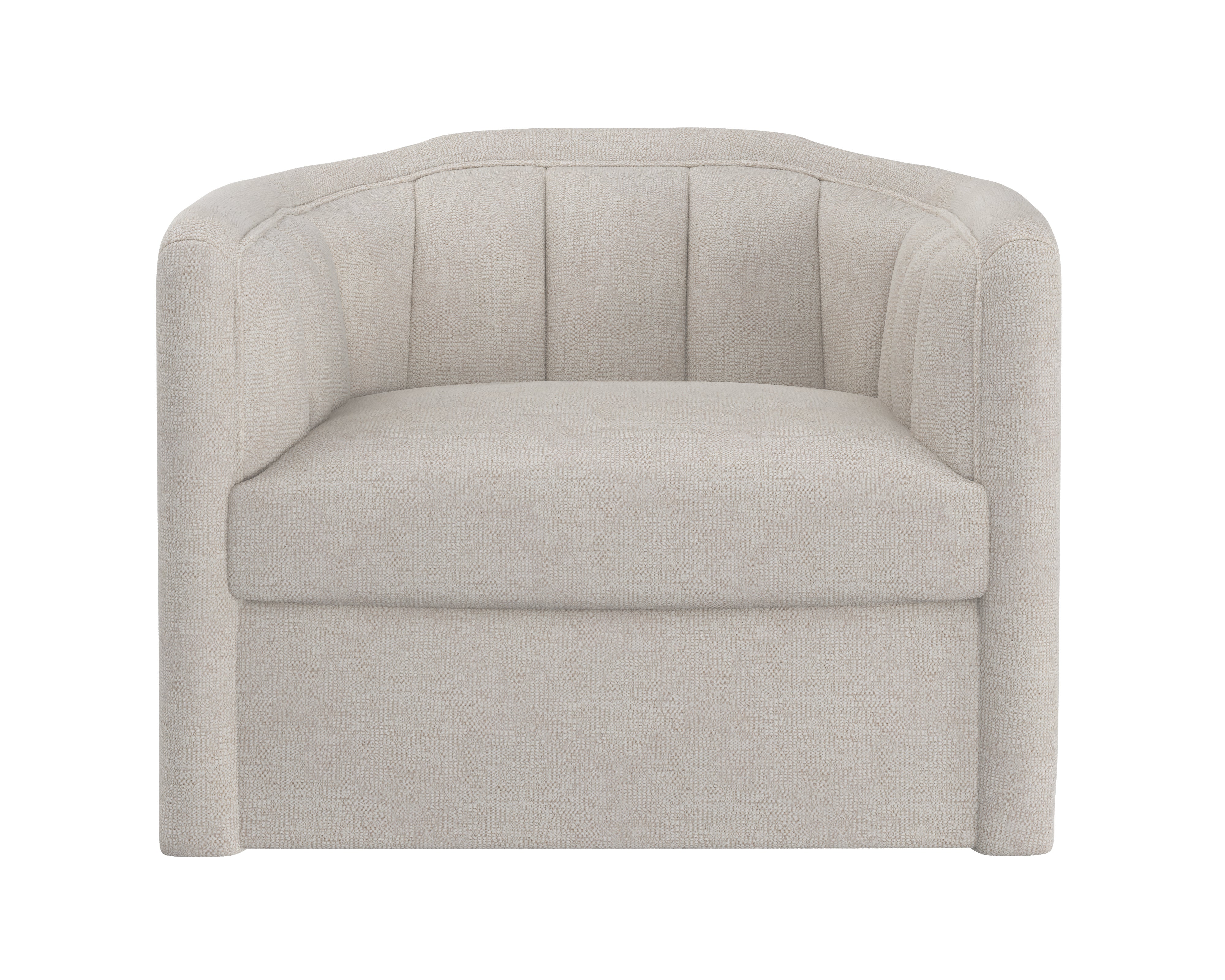 Introduce lavish comfort to any space with this contemporary swivel armchair. Stocked in alaska greige performance fabric. Features vertical tufting on the interior. Completed with a wooden frame and base. Coordinating sofa also available. Performance fabric is moisture repellent, durable and easy to clean.