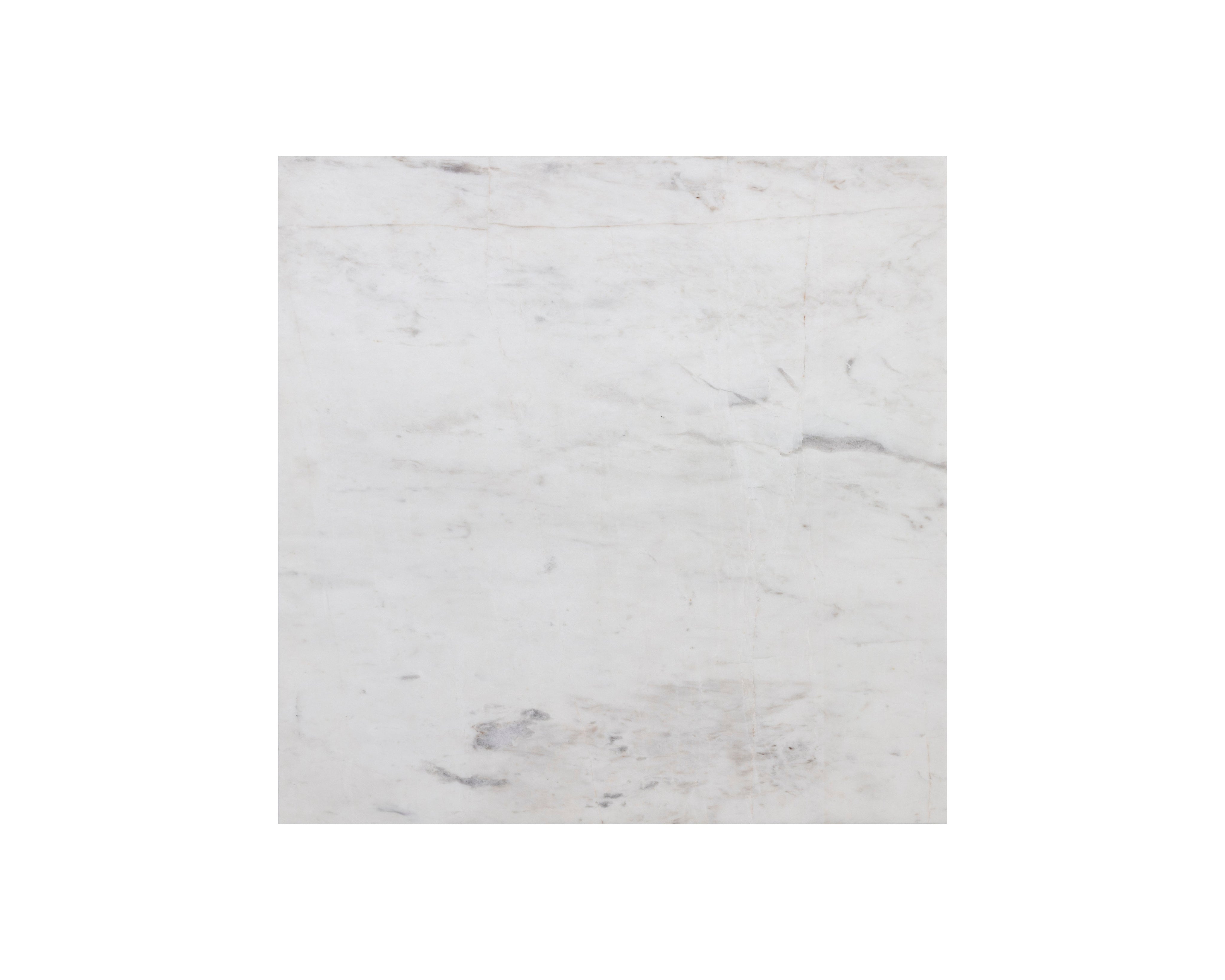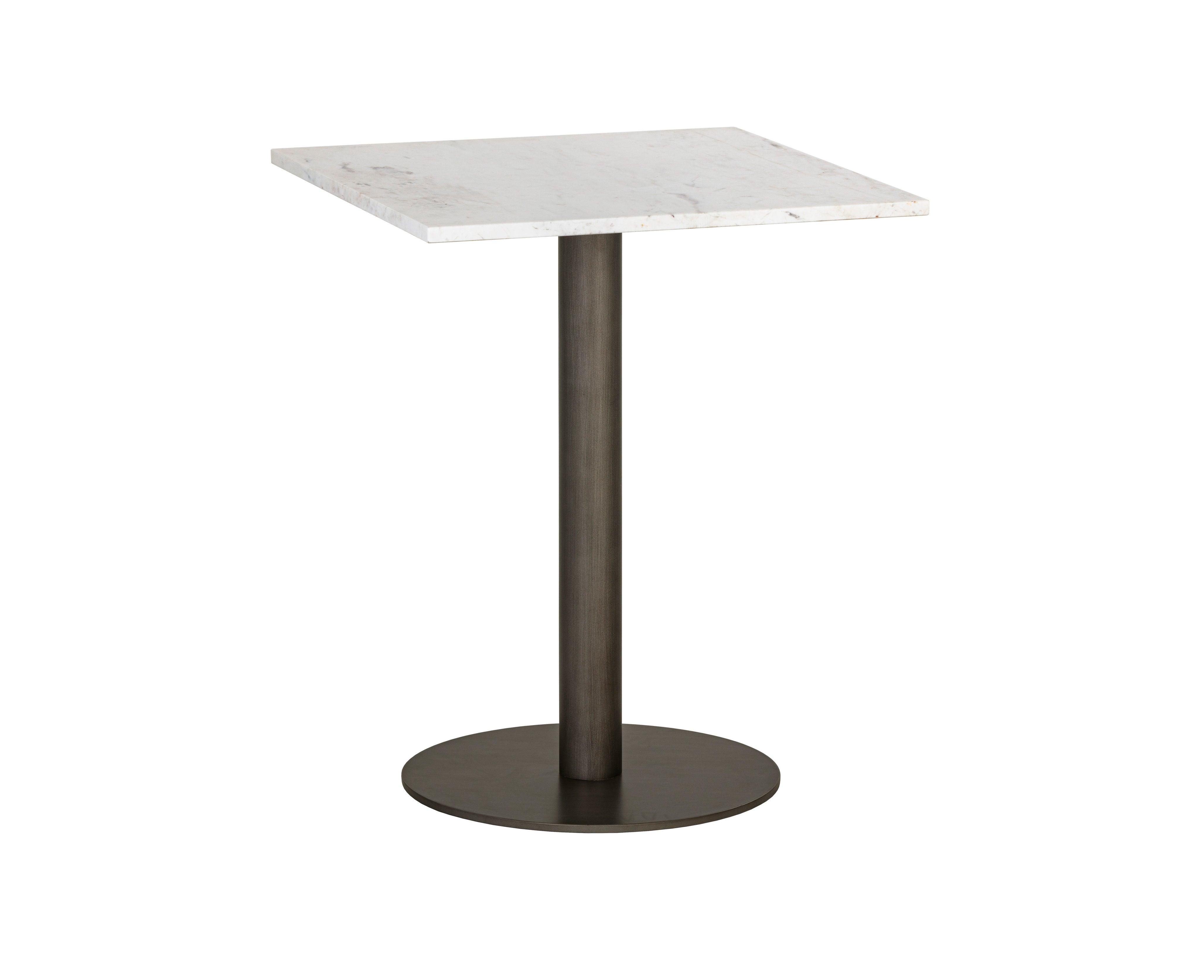An Art Deco inspired 24" square bistro table featuring a white marble top with a pewter finished steel base. Perfect for restaurants and smaller dining spaces. As marble is a natural material, unique veining, pitting, fissures, micro-cracks and colour variations are all characteristics that add to the uniqueness and beauty of each piece.