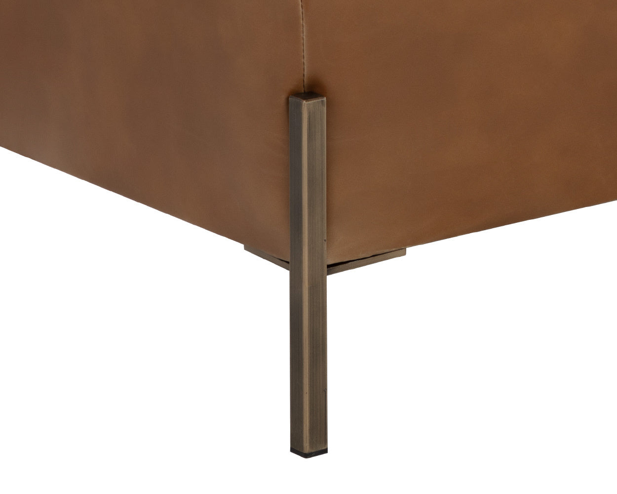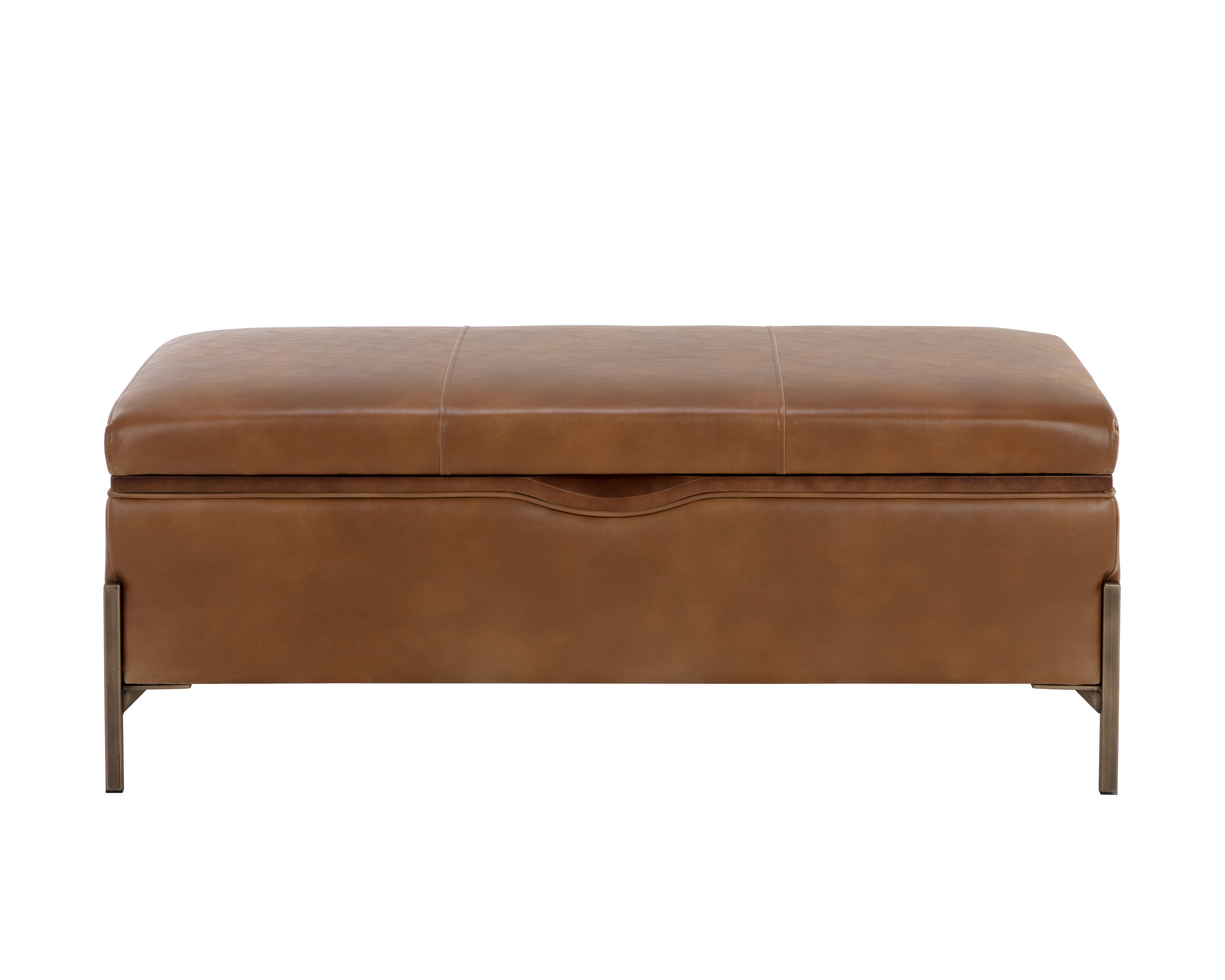 Modern design and functionality come together in the Kael Storage Bench. Upholstered in smooth tobacco tan faux leather with antique brass legs. The large auburn wooden frame adds extra dimension to this piece. As wood is an organic, porous material, these pieces will contain natural variation of texture and may also exhibit fine indentations and cracks. Wood pieces will also display a disparity of colour and grain, and visible knots and burls that add to the character of each piece. Handle With Care: This design has been crafted with faux leather. Faux leather is manufactured to reflect the natural characteristics of leather; as such, colour variations, markings, wrinkles, grooves, and light scratches are appreciated characteristics. No two pieces will be alike. Visit our Product Care page for more information on how to ensure the lasting beauty of this piece.