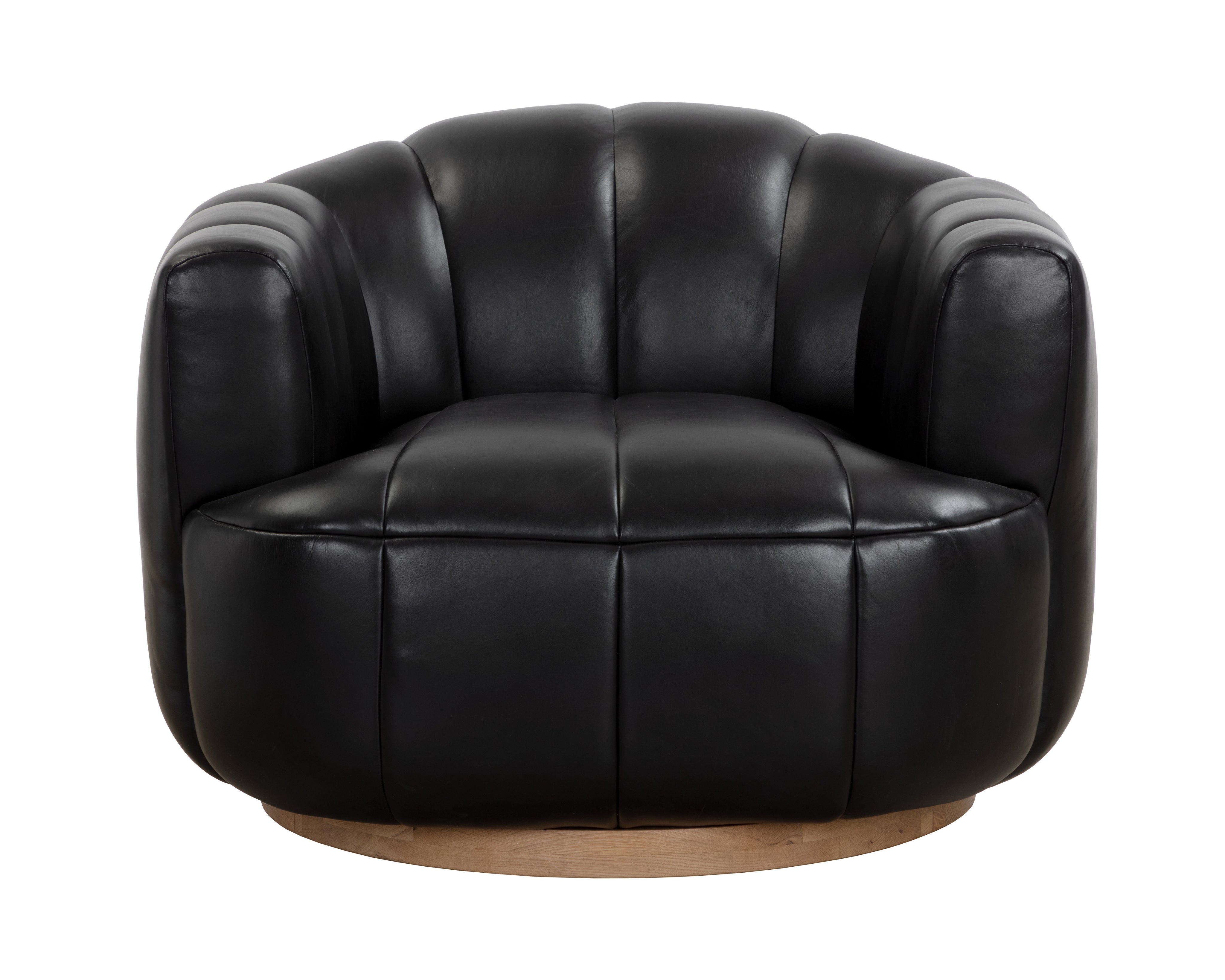 With its shapely silhouette and bolstered seating, the Tadeo Swivel Armchair takes comfort to a different level. A luxurious seat upholstered in our smooth vintage black night top grain leather sits atop an oak wood base. Matching wood detailing along the back of the chair with antique brass accents give a playful yet coordinated look to the design.