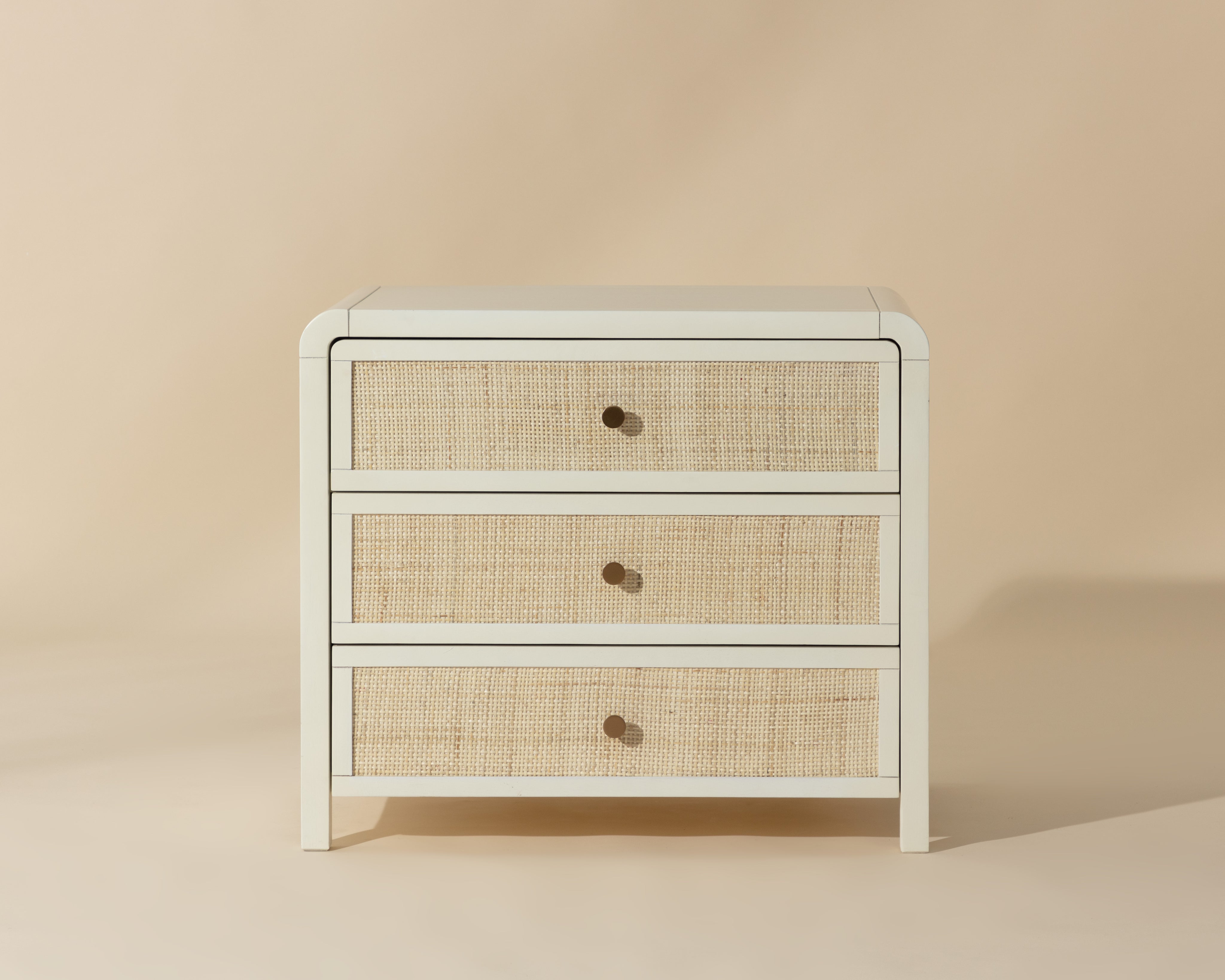 Boasting a stylish design with coastal influence, this beautiful nightstand features a clean-cut silhouette. Features an antique white wood frame with natural rattan detailing on three spacious drawers. Completed with minted copper steel hardware. Handle With Care: This design has been crafted with rattan. This artisan-crafted material features intricate weaving that results in natural variations where no two pieces are alike. Colour and texture differences are to be expected and embraced with this natural material. Due to the weaving process used, the fibres in this material may display shorter or longer lengths where the weaving ends. Visit our Product Care page for more information on how to ensure the lasting beauty of this piece. As wood is an organic, porous material, these pieces will contain natural variation of texture and may also exhibit fine indentations and cracks. Wood pieces will also display a disparity of colour and grain, and visible knots and burls that add to the character of each piece.