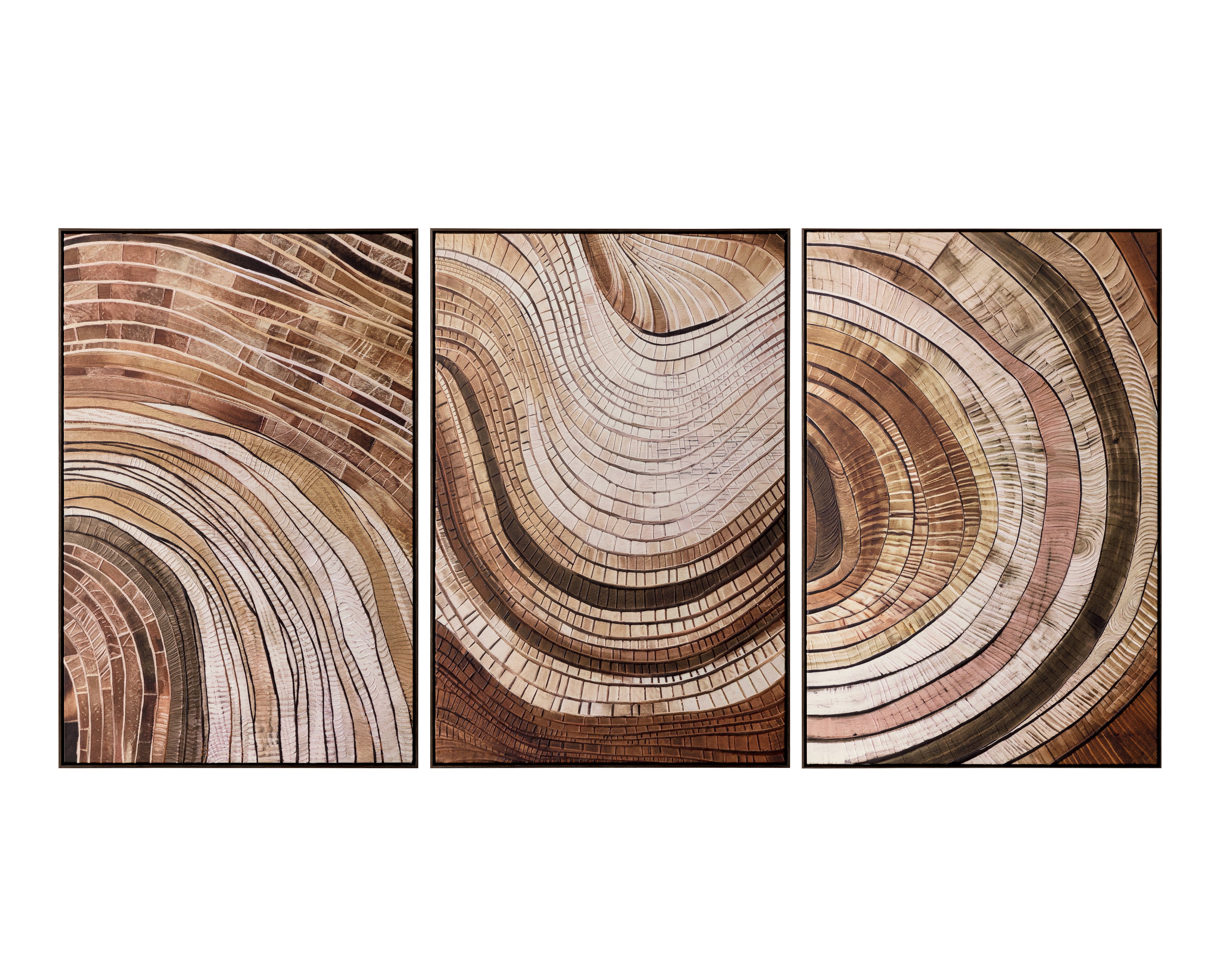 Inspired by biophilic design, Turning Point seeks to build a profound connection with the raw organic beauty of nature. Resembling the natural ring patterns found in trees, each layer is a mosaic of earthy browns and alluring texture that creates a commanding presence. This stunning and rich work can stand alone or be paired with the coordinating art pieces in its collection.