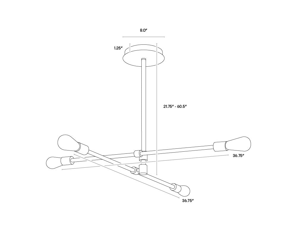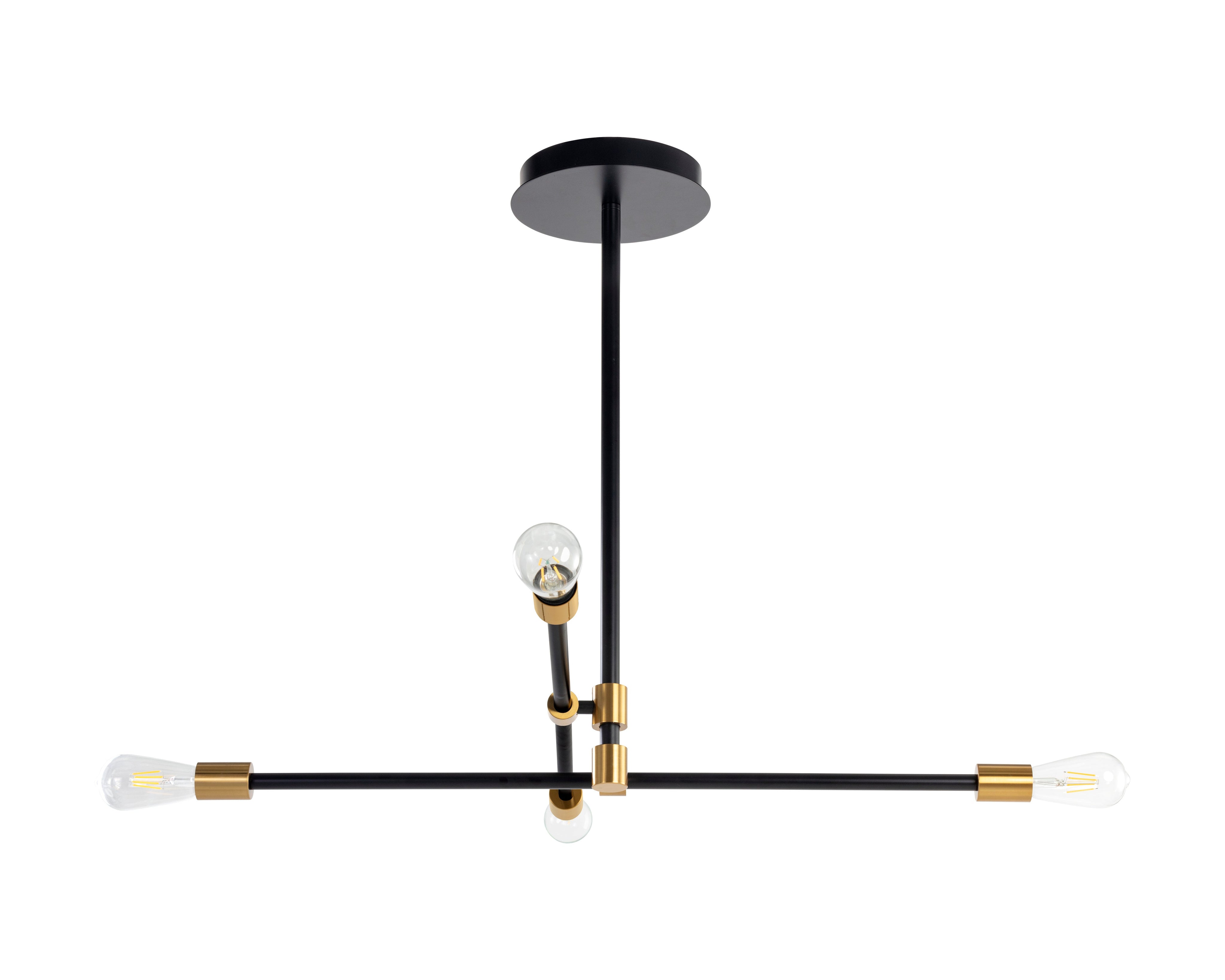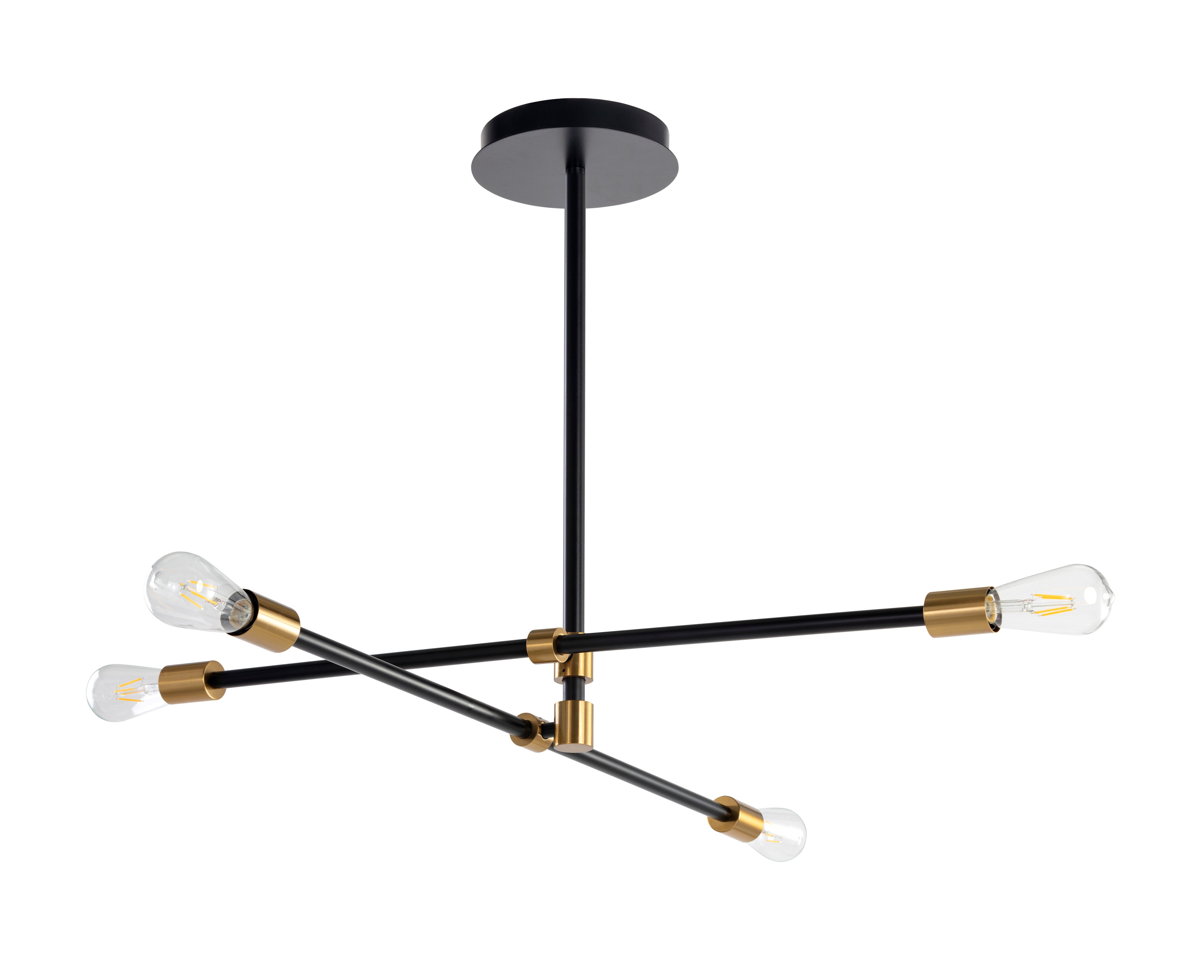Complete an intriguing space with this modern sputnik-style chandelier. Features two adjustable crossing arms that can be rearranged. Crafted from iron with black and brass finishes. Install multiples for a dramatic look. Requires 4 light bulbs and maximum 40 watts each.