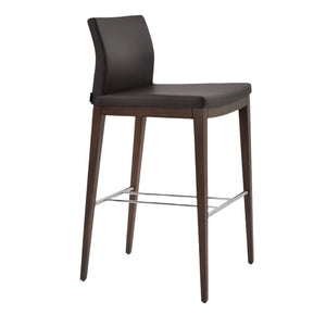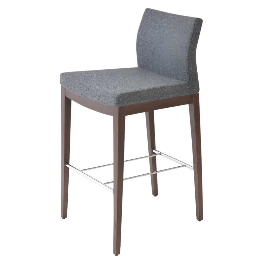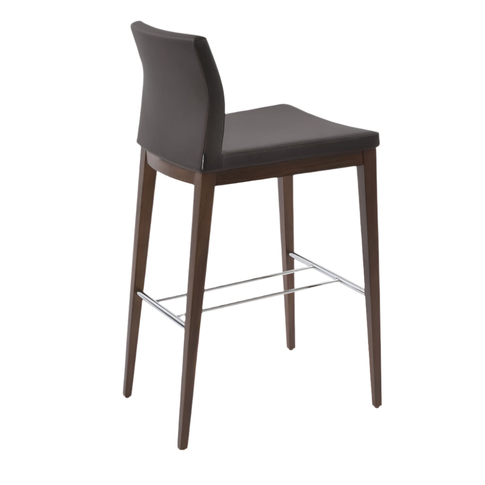 Pasha Wood Stool is an ergonomic bar and counter stool with a comfortable upholstered seat and backrest on solid beech legs tipped with screwed plastic caps. With its chromed steel footrests, it is an ideal stool for bars and counters. The seat has a steel structure with “S” shape springs for extra flexibility and strength. This steel frame is molded by injecting polyurethane foam. Pasha seat is upholstered with a removable velcro enclosed leather, PPM or wool fabric slip cover. The stool is suitable for both residential and commercial use.