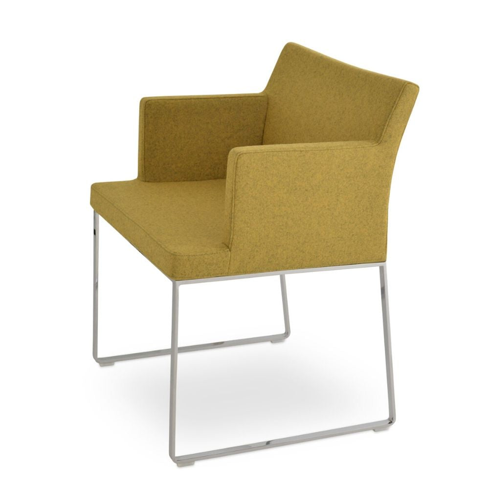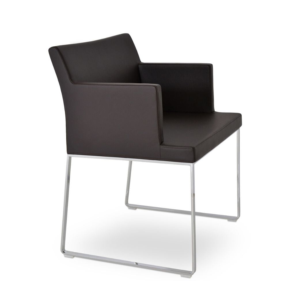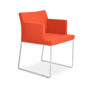 SOHO SLED CHAIR is a classy armchair with a comfortable upholstered seat and backrest on chrome steel sled base. The steel base can be finished in black powder coating. The seat has a steel structure with “S” shape springs for extra flexibility and strength. This steel frame molded by injecting polyurethane foam. Soho seat is upholstered with a removable velcro enclosed leather, PPM or wool fabric slip cover. The chair is suitable for both residential and commercial use.