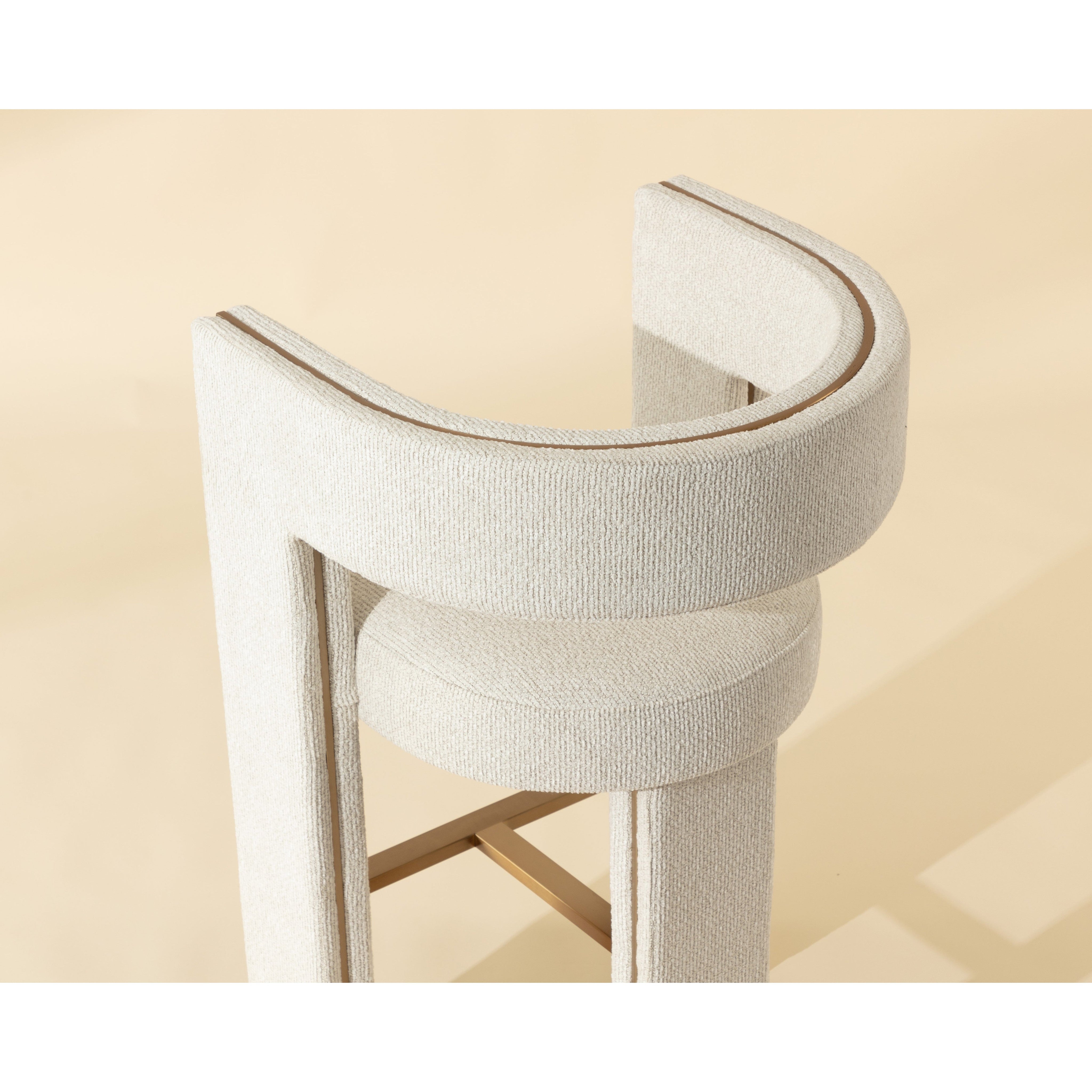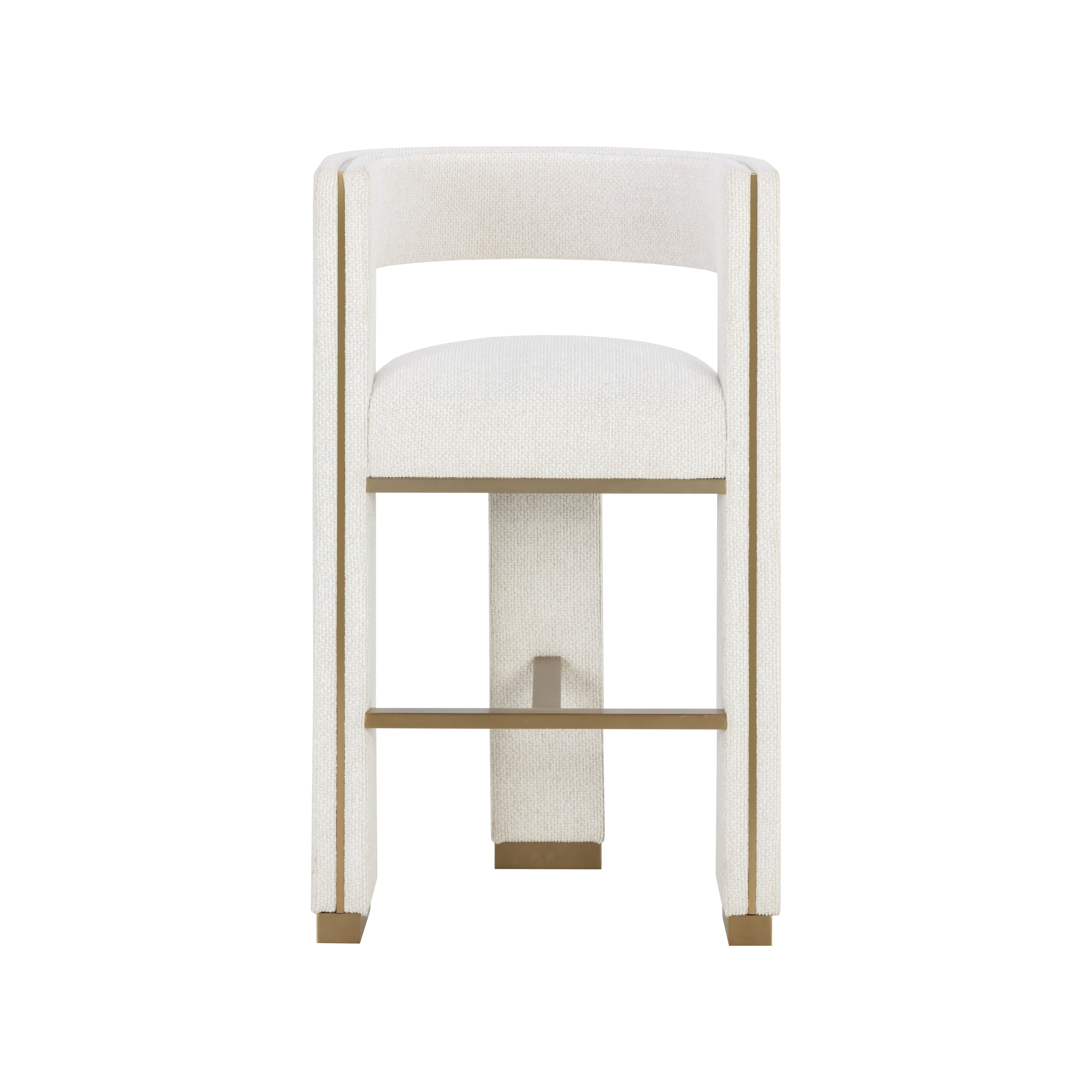 Perfectly poised with a distinct three-legged design, the Adamina Barstool will leave a lasting impression. Powder-coated gold metal detailing enhances the plush texture of our rhea light barley performance fabric for a stylish seating solution. Performance fabric is moisture repellent, durable and easy to clean.
