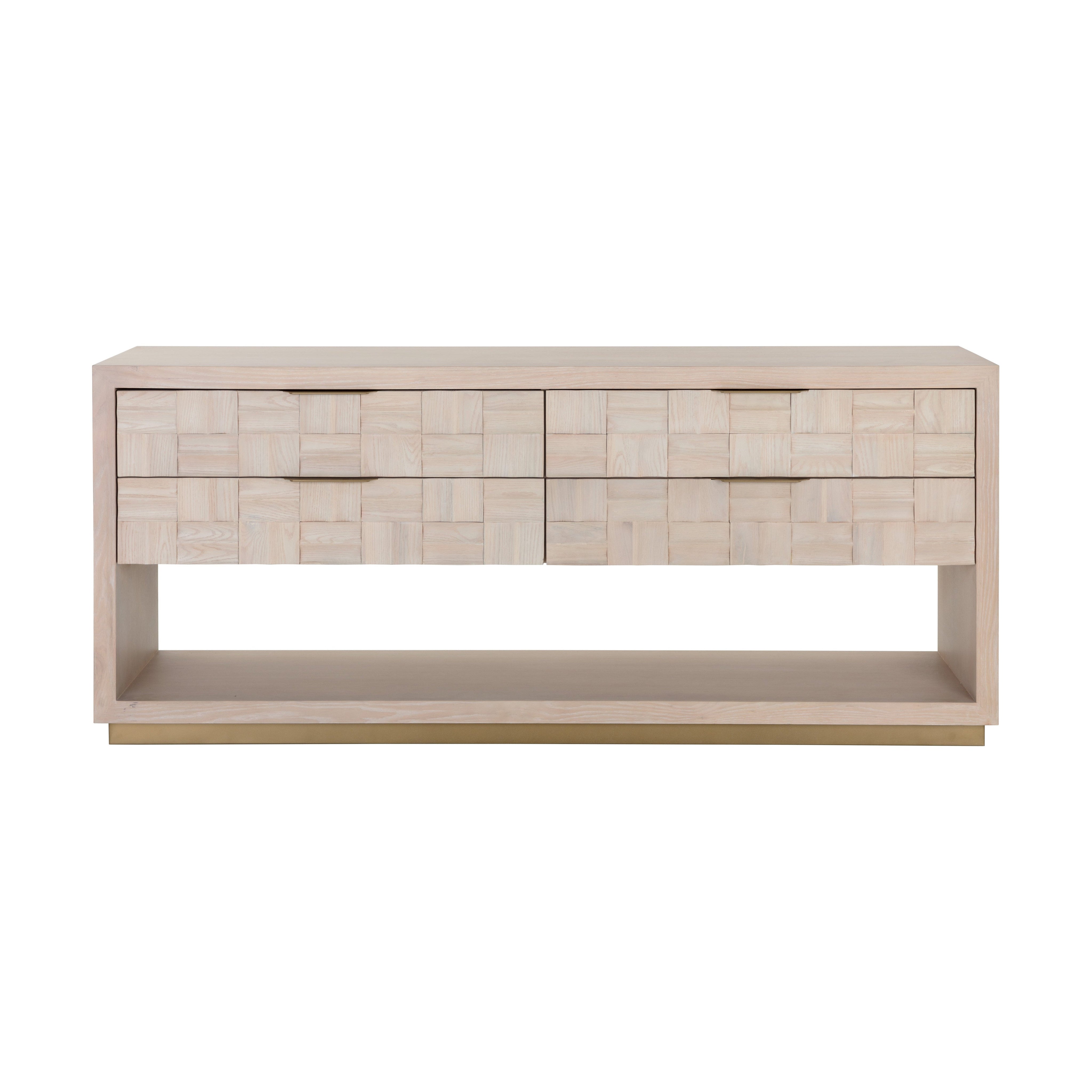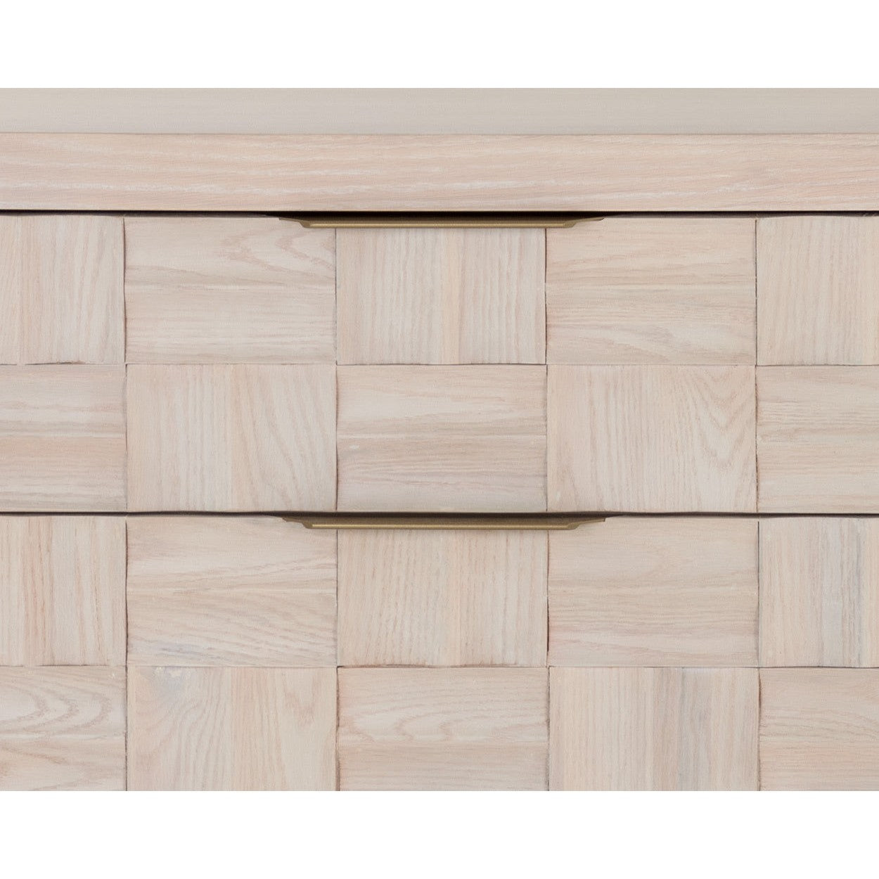The Akava Dresser will add intrigue to any bedroom space. Features a minimal linear frame crafted with a light oak wood veneer. Wood tiling on the front drawer brings texture and visual interest to the overall look. Completed with light gold aluminum handles and a matching steel base. As wood is an organic, porous material, these pieces will contain natural variation of texture and may also exhibit fine indentations and cracks. Wood pieces will also display a disparity of colour and grain, and visible knots and burls that add to the character of each piece.