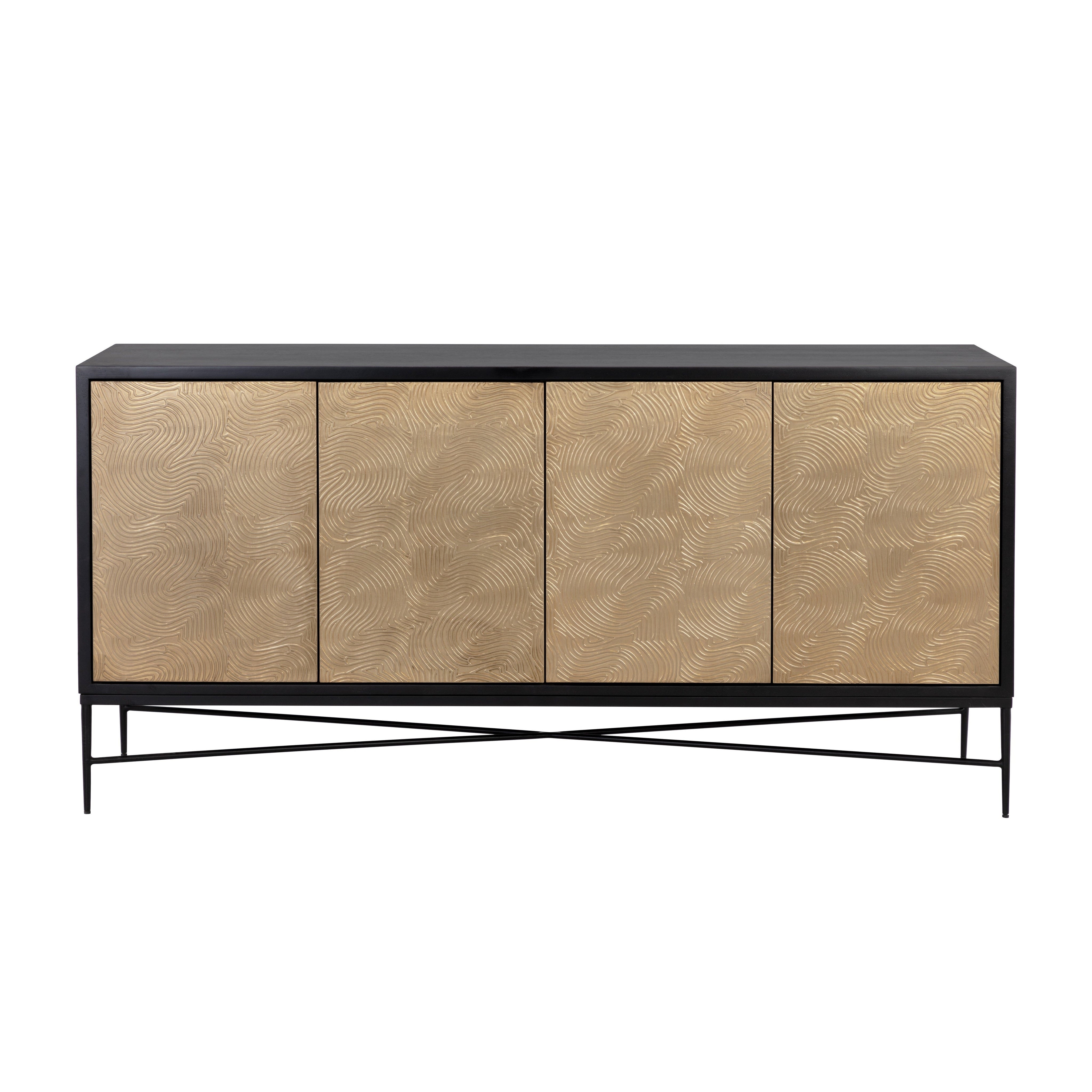 Infused with rich texture, this beautiful sideboard combines the timelessness of mid-century design with a modern twist. Features a solid mango wood frame with a black finish and complemented with champagne gold aluminum cladding on door fronts. Completed with a black iron base. Anti-tipping kit included. Made in India. With refined craftsmanship, this design was brought to life by skilled local artisans. By nature, these materials develop unique imperfections such as fissures, markings and colour variations for a truly one-of-a-kind piece. As wood is an organic, porous material, these pieces will contain natural variation of texture and may also exhibit fine indentations and cracks. Wood pieces will also display a disparity of colour and grain, and visible knots and burls that add to the character of each piece.