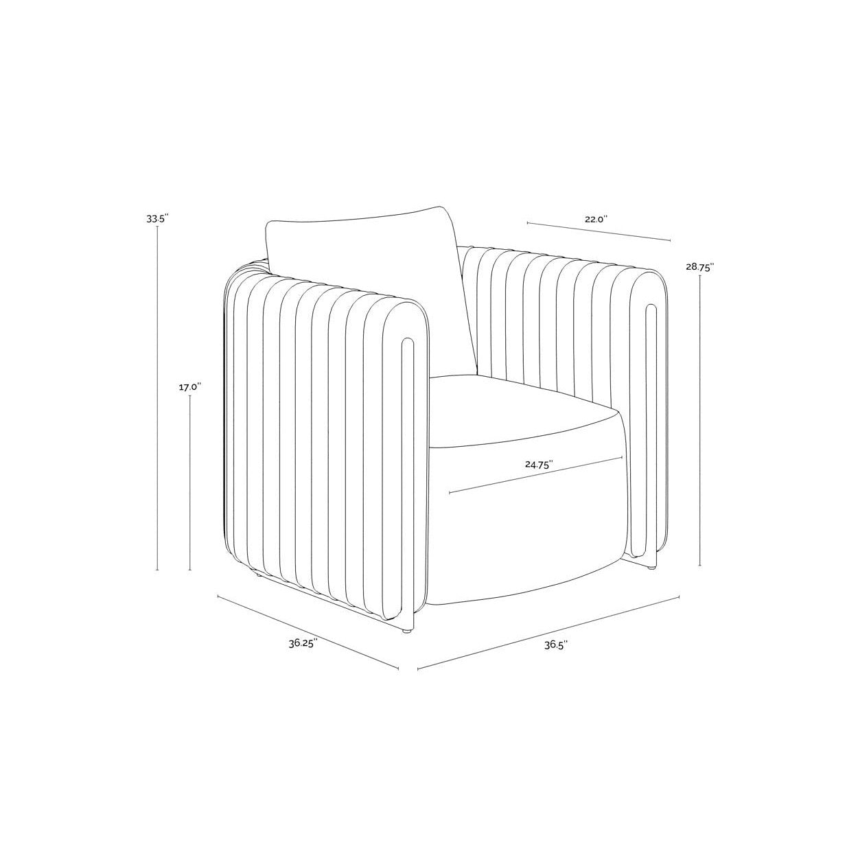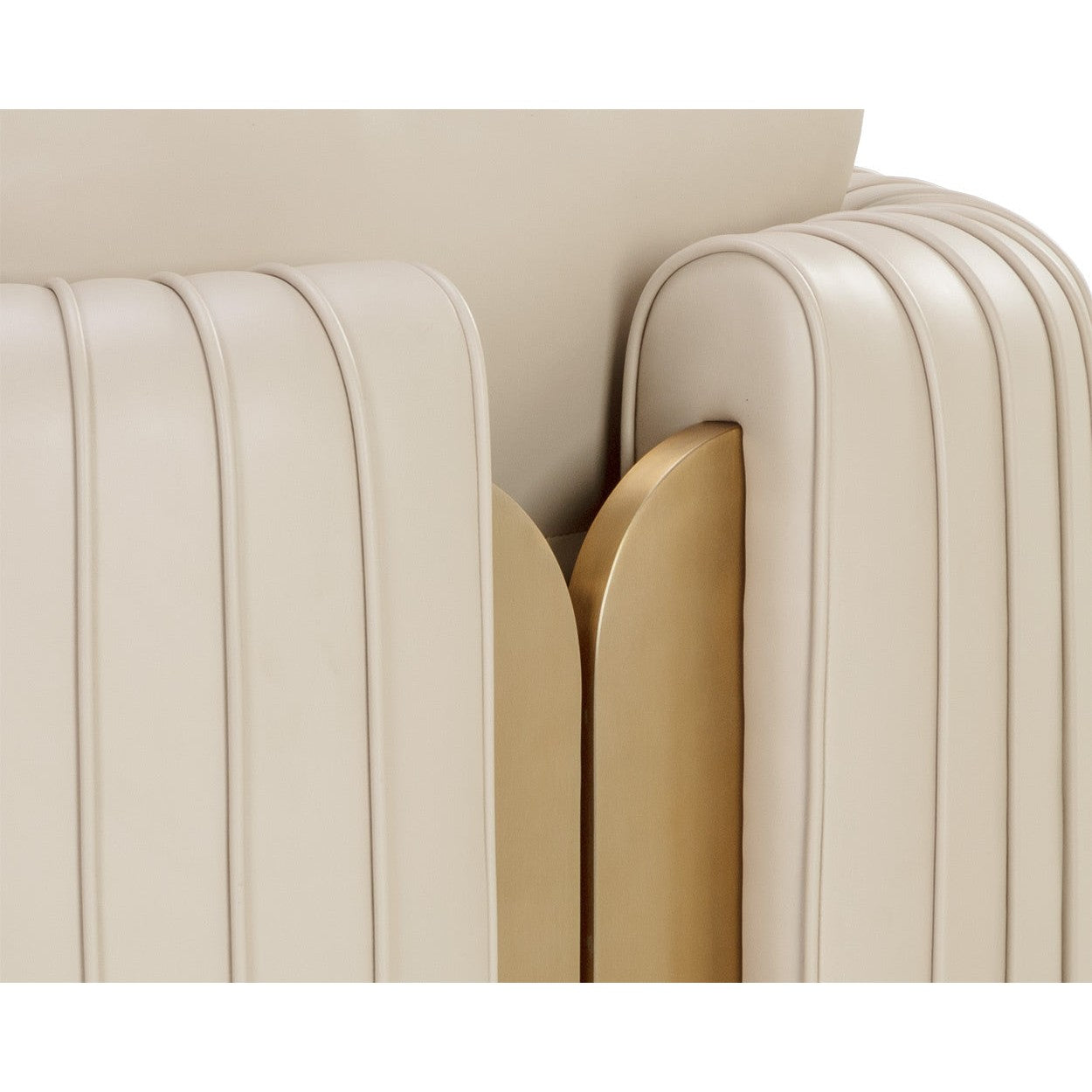The Alix Lounge Chair is elevated comfort with a touch of glamour. A luxuriously rounded frame is upholstered in napa beige faux leather. Channeled piping and gold stainless steel detailing on the front and back add visual allure from every angle.