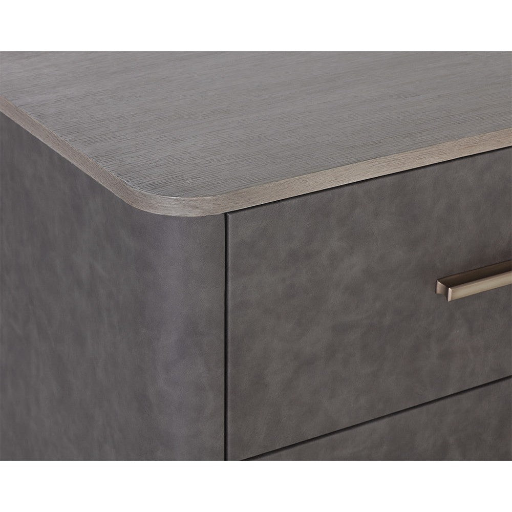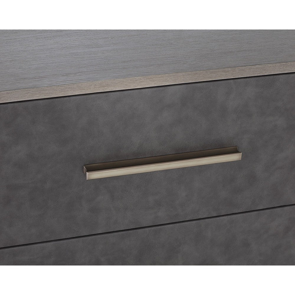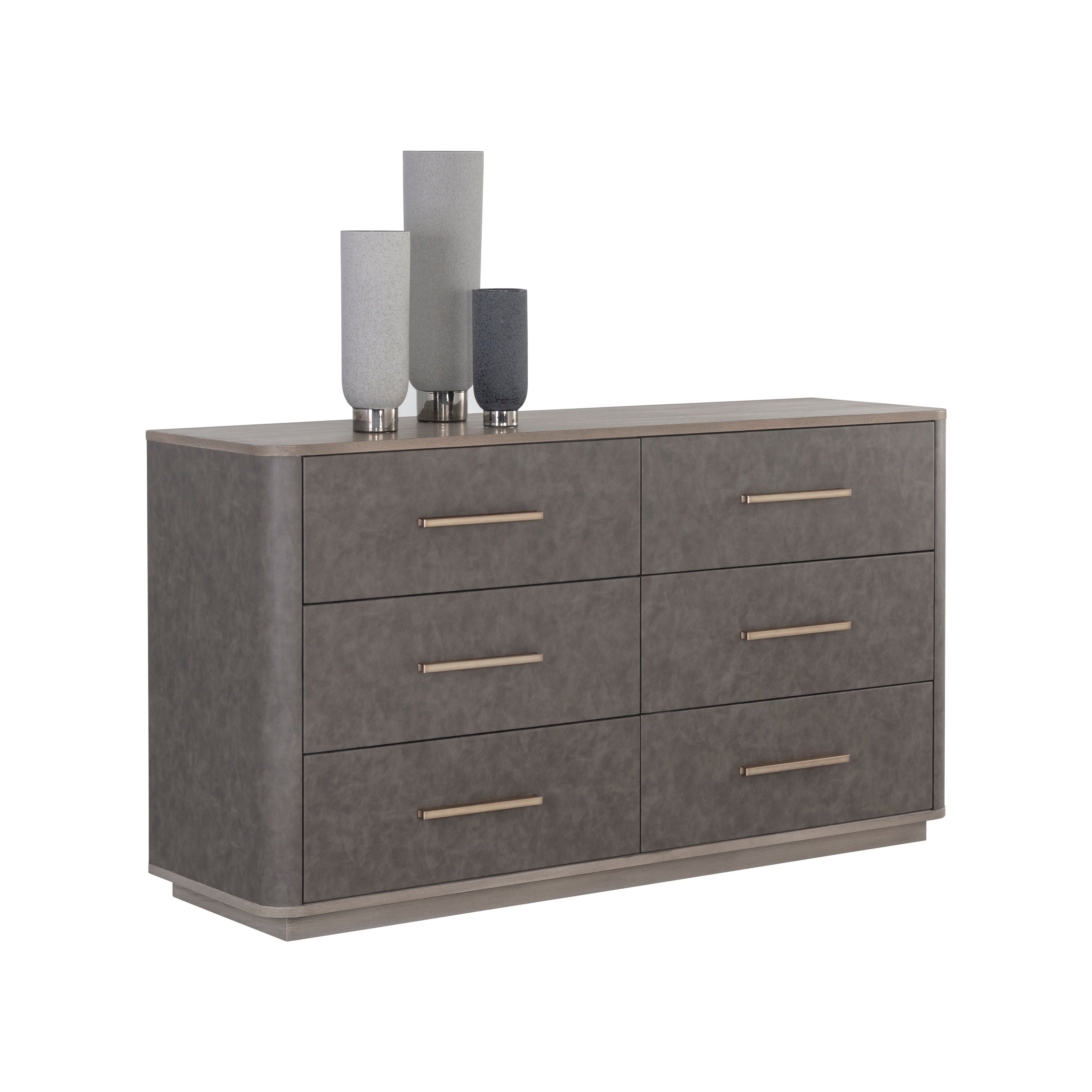 With clean lines and an alluring textured look, the Altman Dresser reflects a refined expression of shape and form. Designed with a faux leather wrapped frame and six soft closing drawers. A dark grey oak veneer wood top and brass stainless steel hardware complete the look.