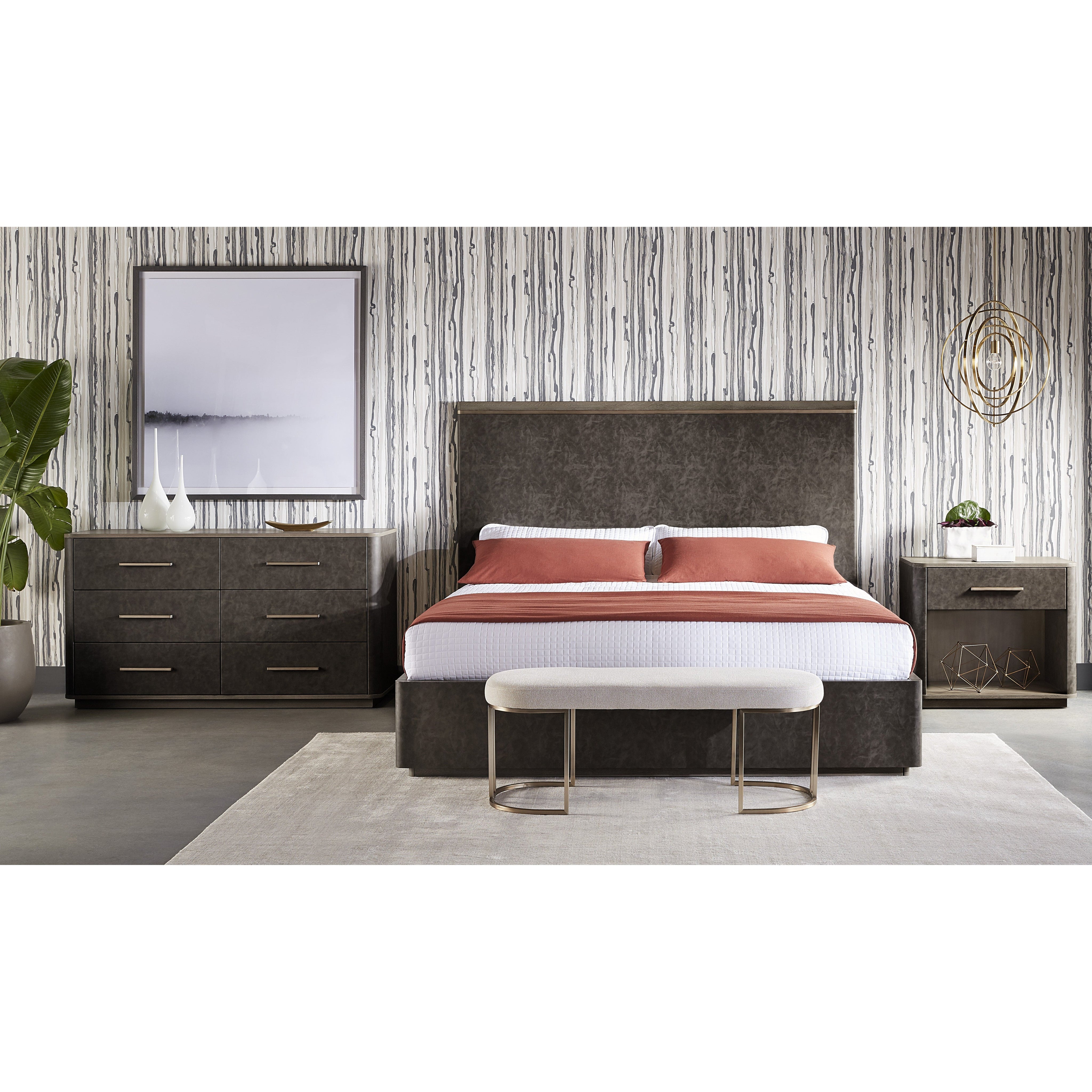 With clean lines and an alluring textured look, the Altman Nightstand reflects a refined expression of shape and form. Designed with a faux leather wrapped frame and one soft closing drawer, a dark grey oak veneer wood top and shelf, and brass stainless steel hardware complete the look.