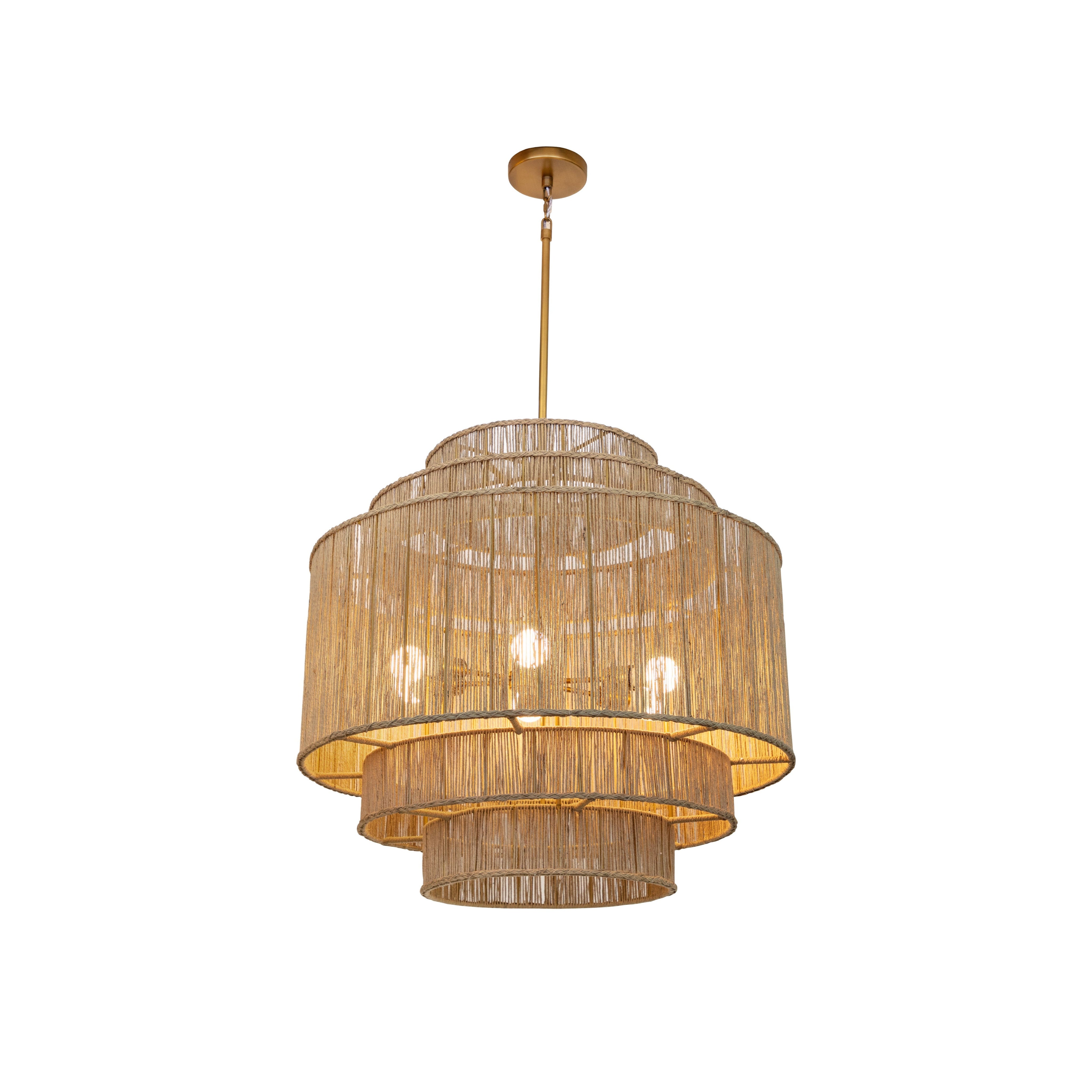 Each of the five tiers of the Alyssa Chandelier is carefully handwoven with jute, highlighting its enduring beauty. Suspended from an antique brass rod, this chandelier brings a light airy look to any room it is placed in.
