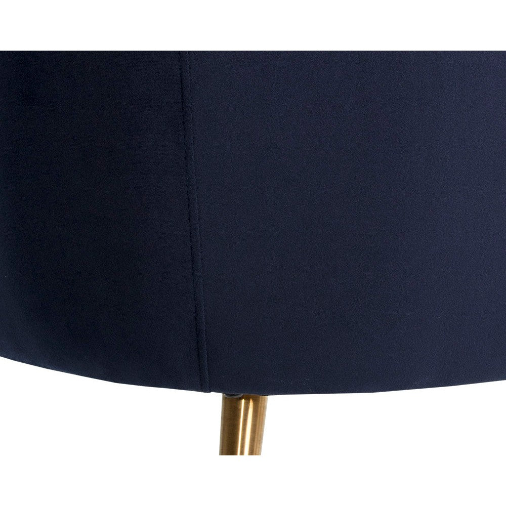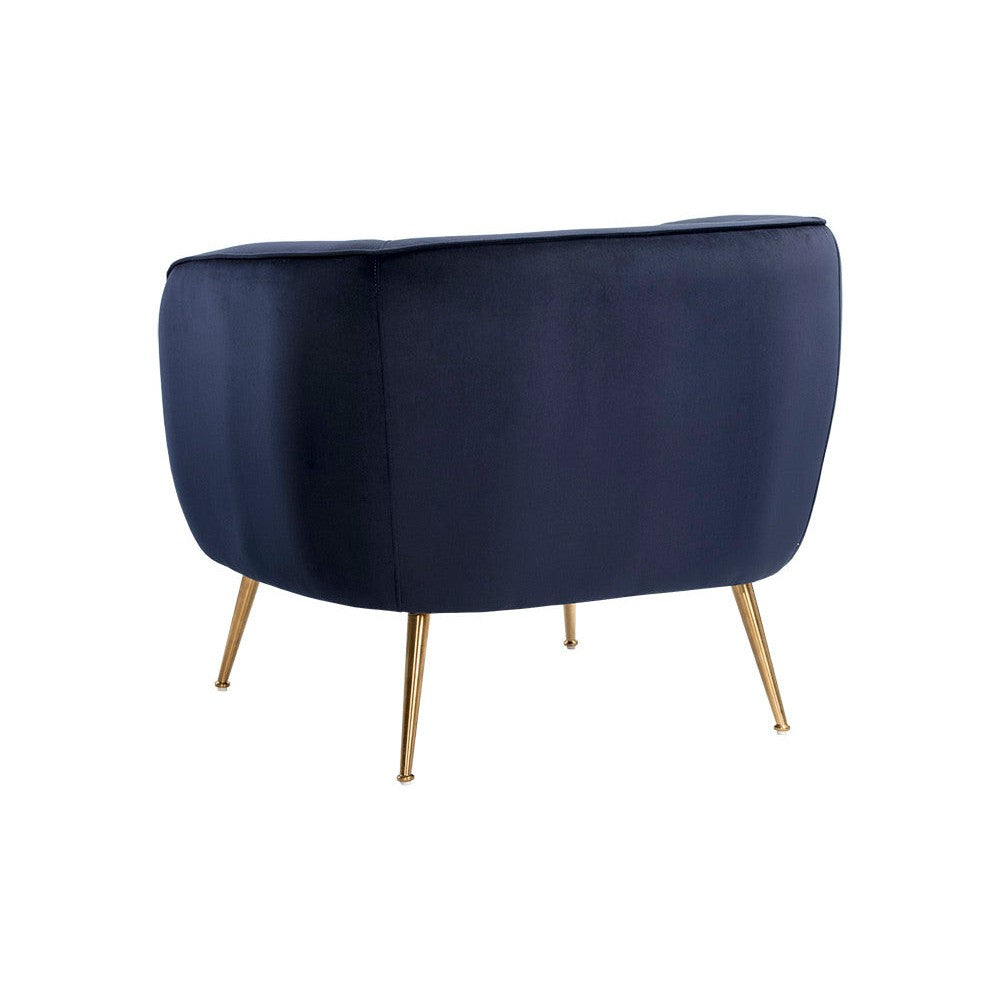A charming lounge chair designed with a bold, curved frame. Upholstered in copenhagen abbington navy fabric. Tapered stainless steel legs in a gold finish complete the look. Perfect for contemporary and modern environments.