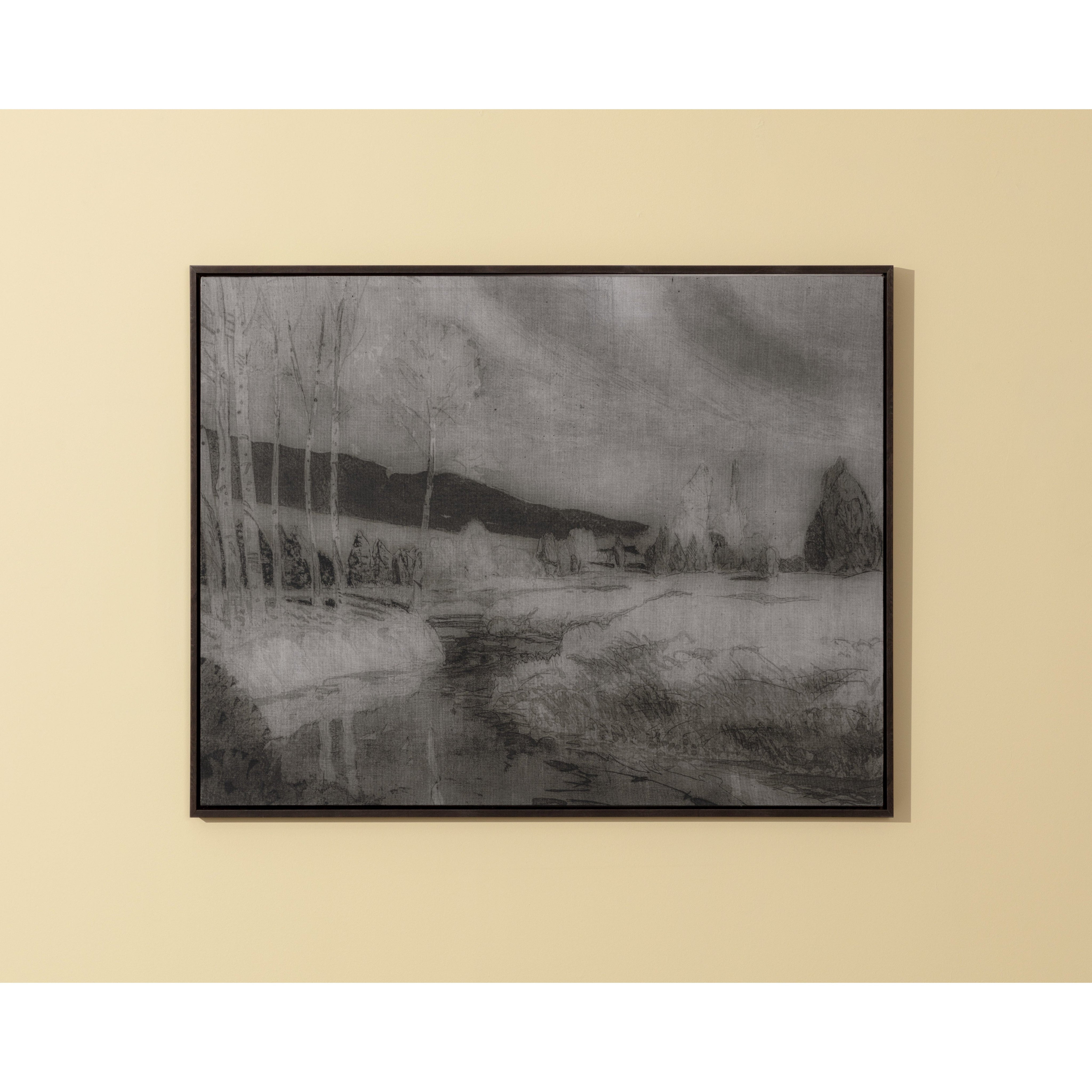 Printed on linen and finished with hand-applied detail, this artwork renders a serene landscape in layered textures. Subtle tonal shifts and gestural linework bring depth to the scene, drawing the eye through a gently unfolding terrain. Crafted in Canada.