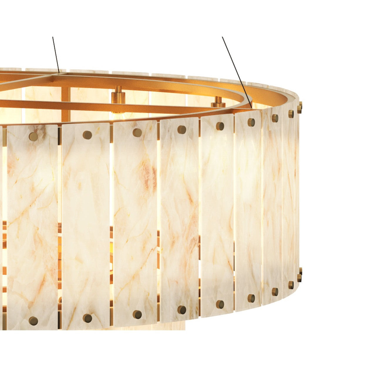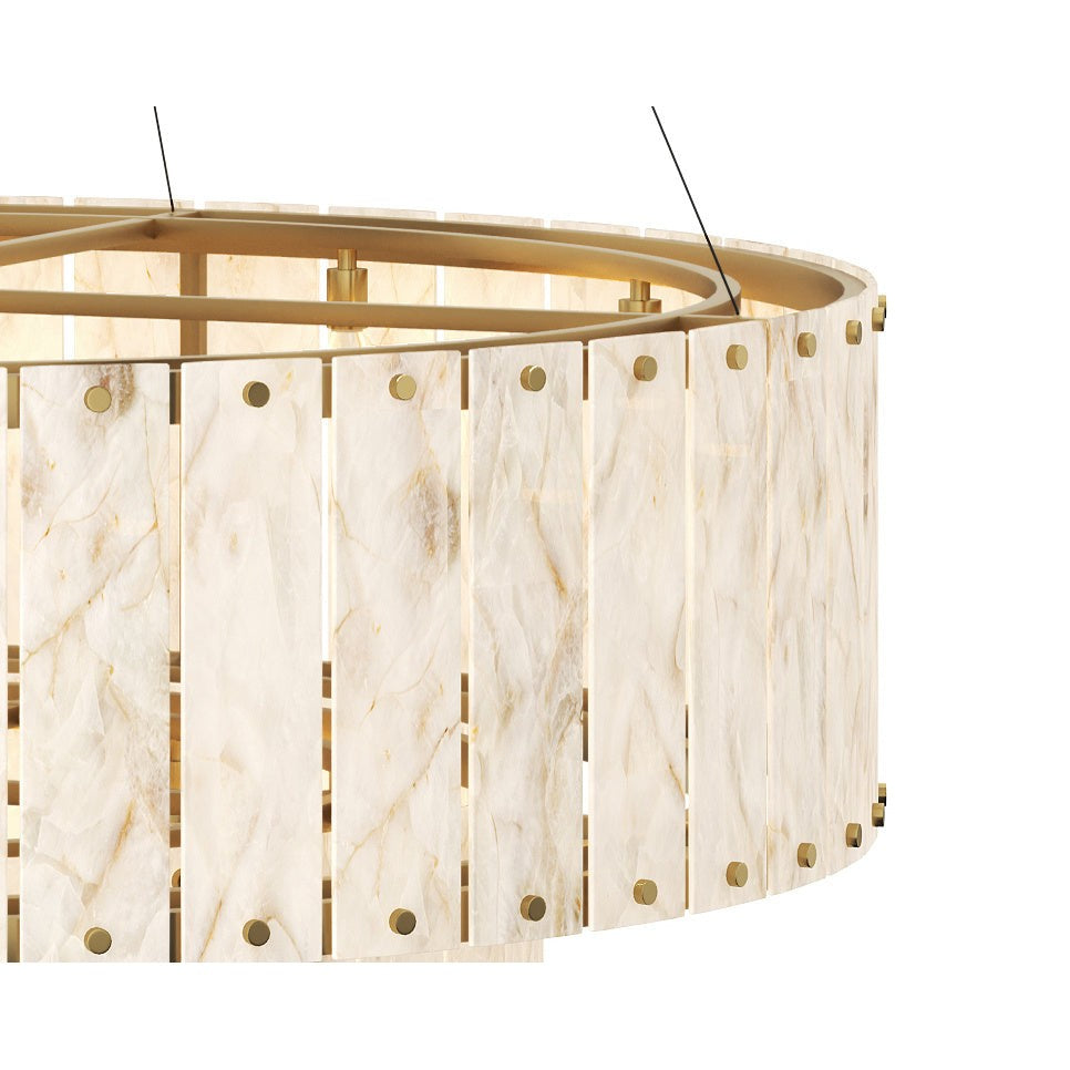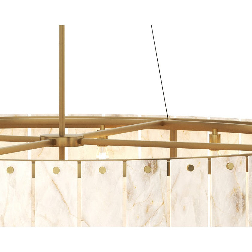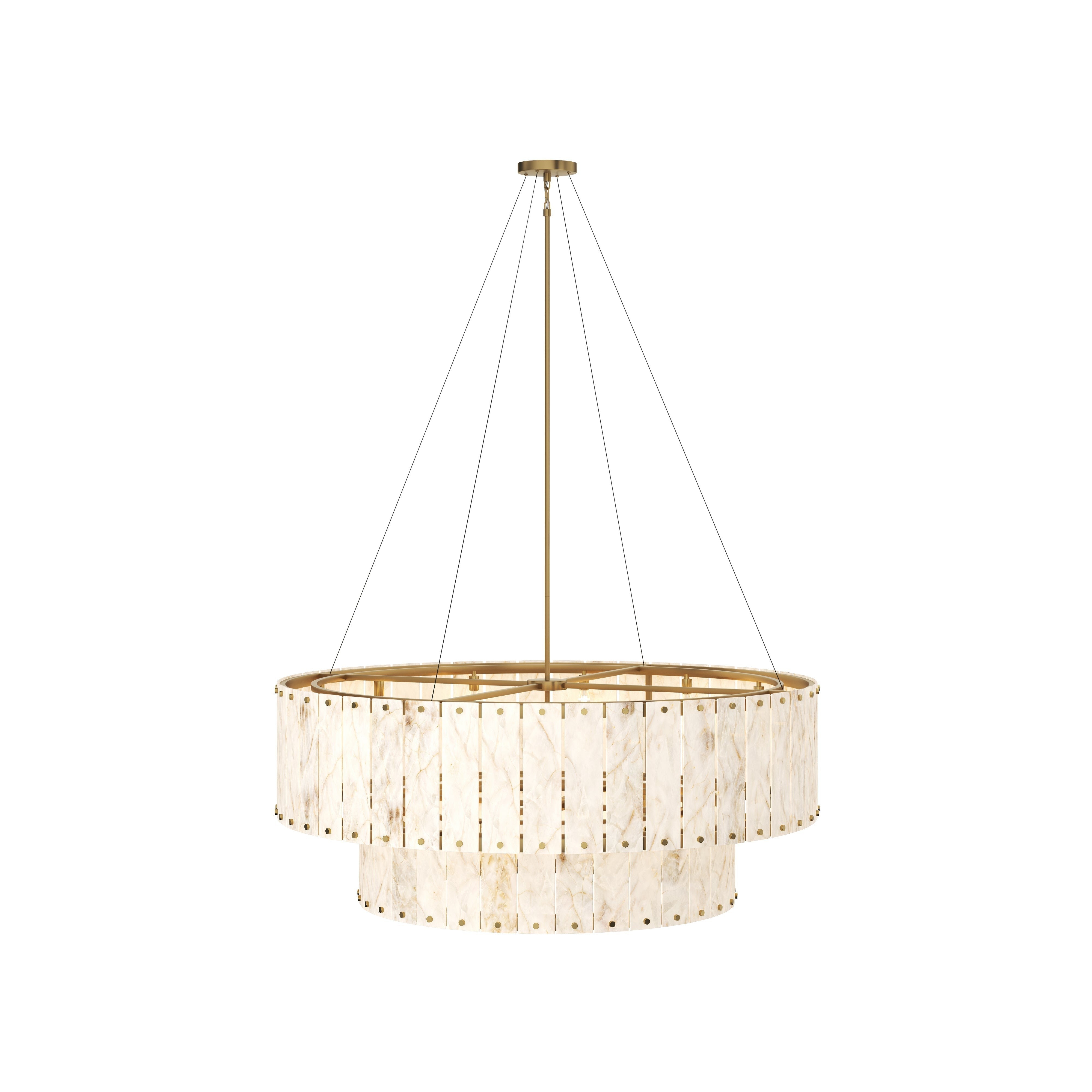 Striking and unforgettable, the Aspara Chandelier is a modern treasure that will make its presence felt in large spaces. This substantially-sized showpiece is masterfully crafted with two tiers of natural Spanish alabaster, prized for its translucency and soft cream colour. Each alabaster panel is sizeable and features unique veining that makes every chandelier one-of-a-kind.