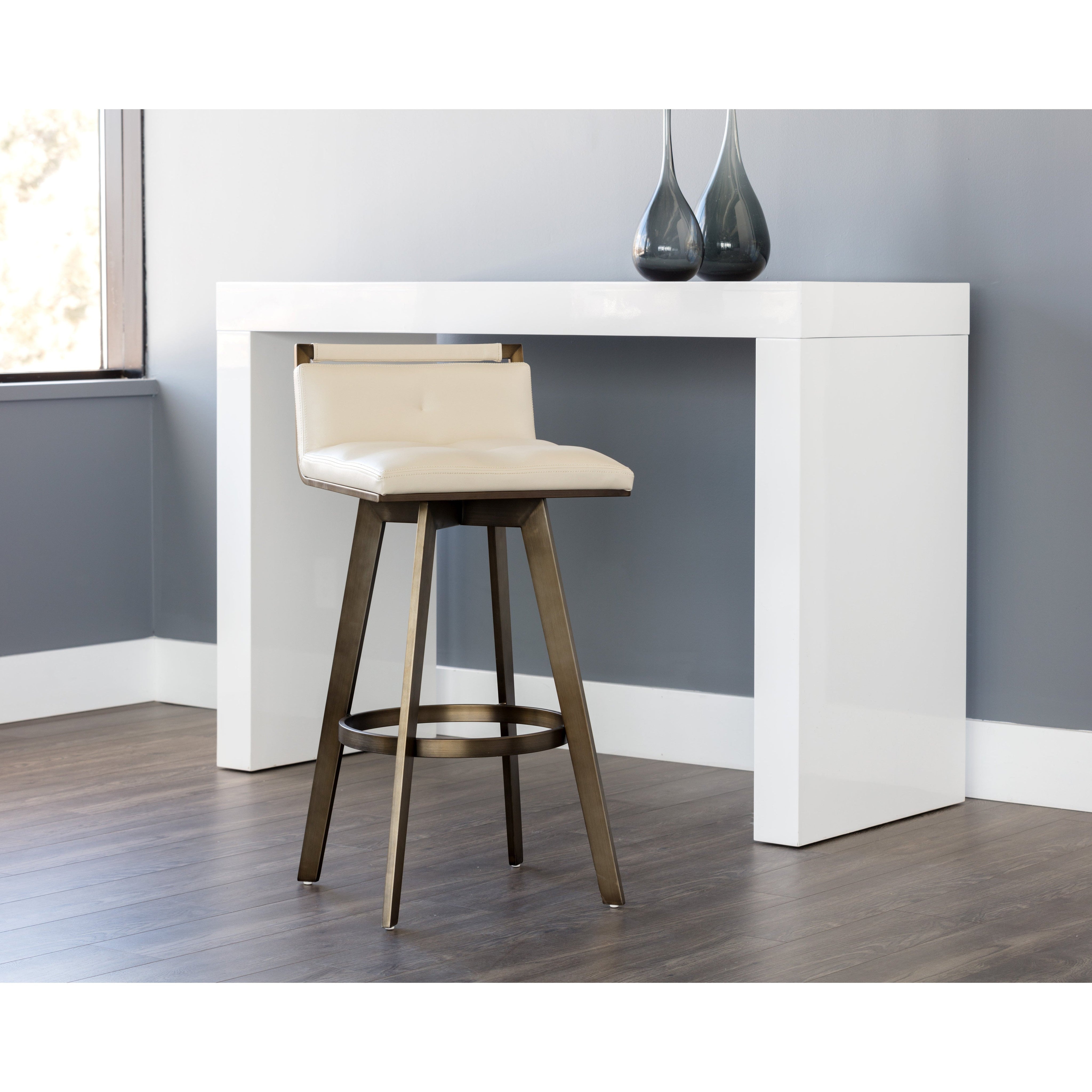 A stylish Art Deco inspired swivel barstool with a low profile seatback. Features a partially exposed frame and legs made of stainless steel with an antique brass finish. Swivel features 360 degree swivel. Suitable for residential and commercial environments. Suitable for various dining, kitchen and bar spaces of all sizes. Handle With Care: This design has been crafted with faux leather. Faux leather is manufactured to reflect the natural characteristics of leather; as such, colour variations, markings wrinkles, grooves, and light scratches are appreciated characteristics. No two pieces will be alike. Visit our Product Care page for more information on how to ensure the lasting beauty of this piece.