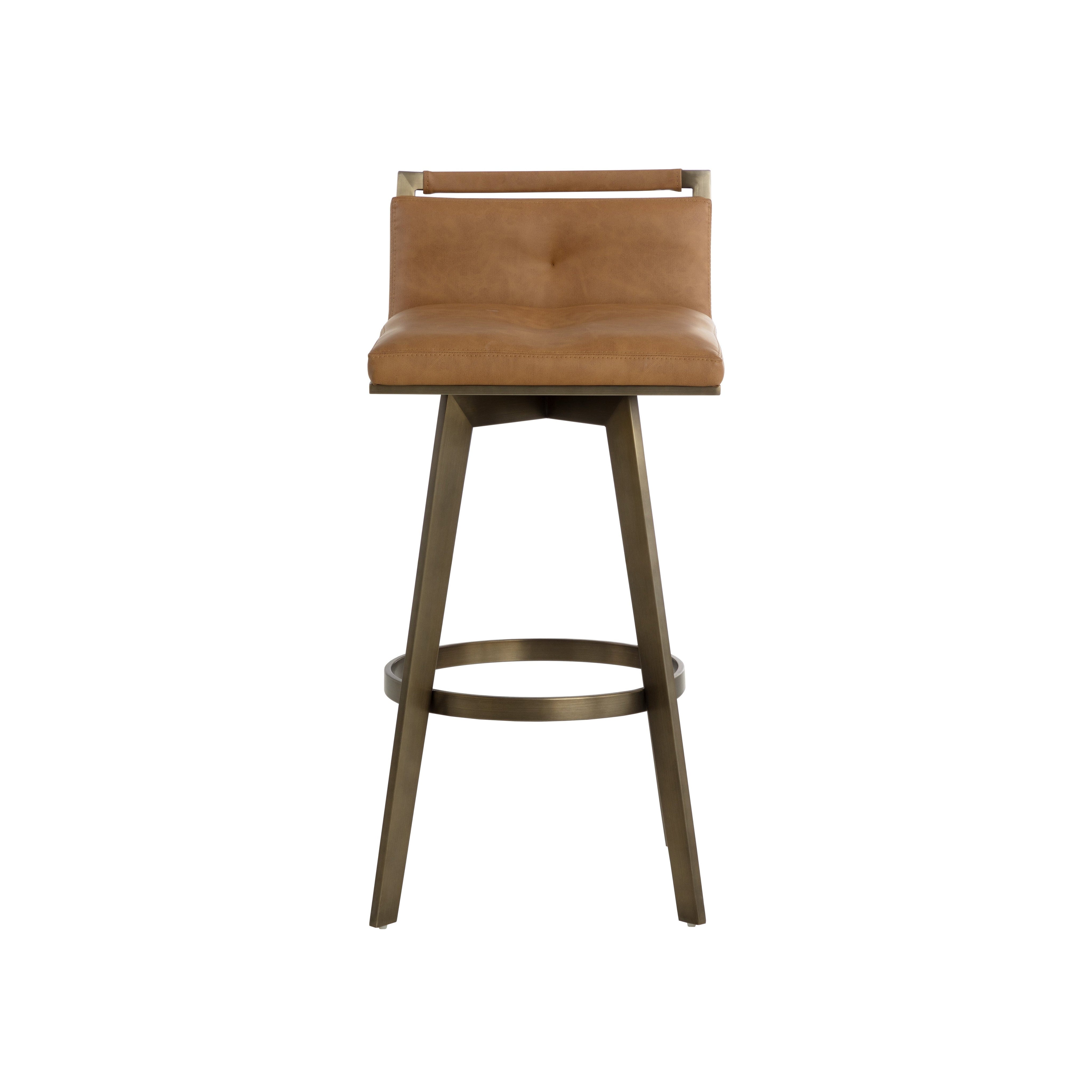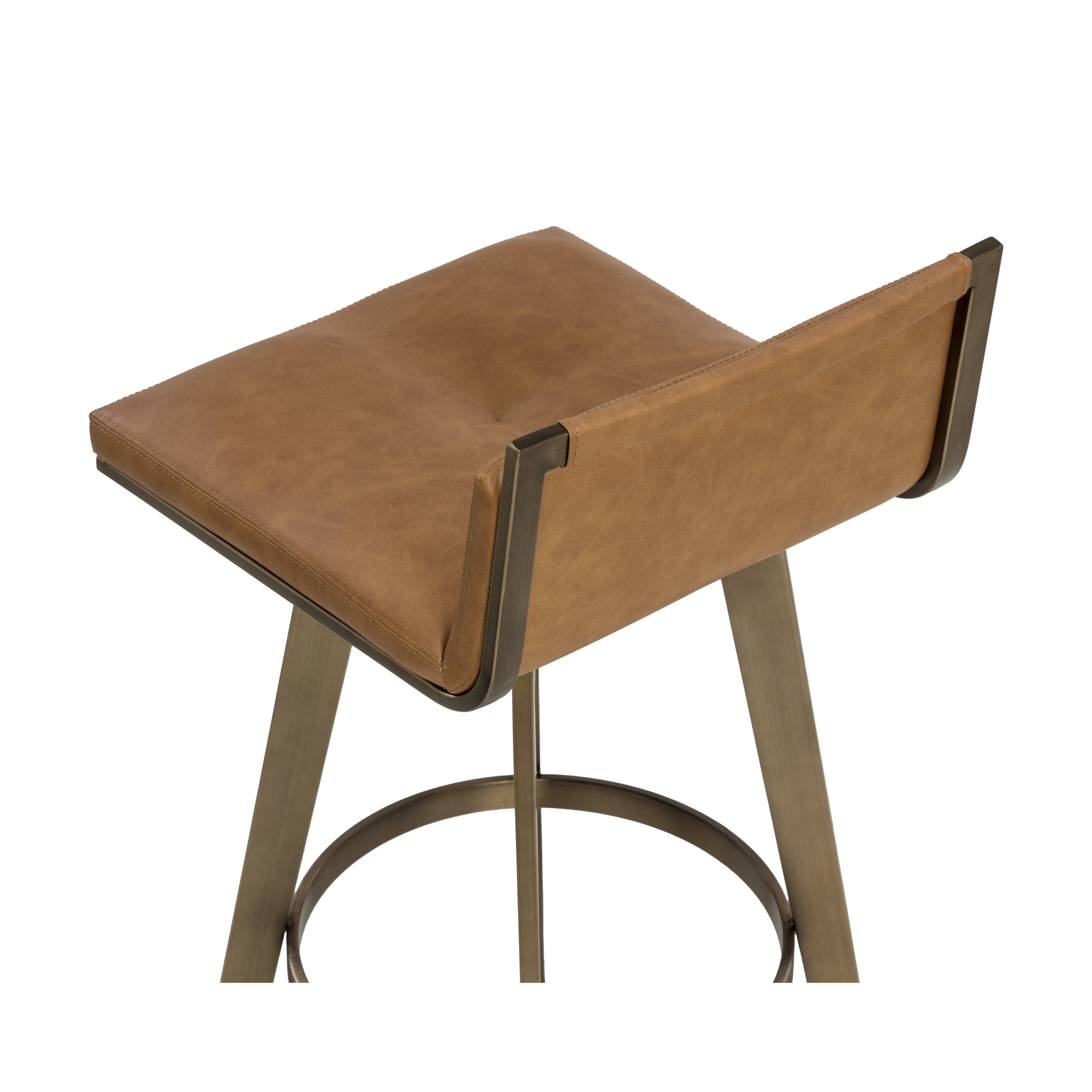 A stylish Art Deco inspired swivel barstool with a low profile seatback. Features a partially exposed frame and legs made of stainless steel with an antique brass finish. Swivel features 360 degree swivel. Suitable for various dining, kitchen and bar spaces of all sizes. Handle With Care: This design has been crafted with faux leather. Faux leather is manufactured to reflect the natural characteristics of leather; as such, colour variations, markings wrinkles, grooves, and light scratches are appreciated characteristics. No two pieces will be alike. Visit our Product Care page for more information on how to ensure the lasting beauty of this piece.