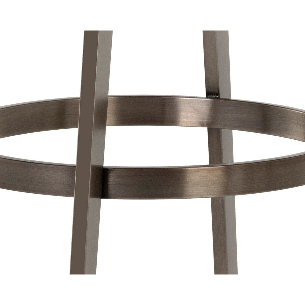 A stylish Art Deco inspired swivel counter stool with a low profile seatback. Features a partially exposed frame and legs made of stainless steel with an antique brass finish. Swivel features 360 degree swivel. Suitable for residential and commercial environments. Handle With Care: This design has been crafted with faux leather. Faux leather is manufactured to reflect the natural characteristics of leather; as such, colour variations, markings wrinkles, grooves, and light scratches are appreciated characteristics. No two pieces will be alike. Visit our Product Care page for more information on how to ensure the lasting beauty of this piece.