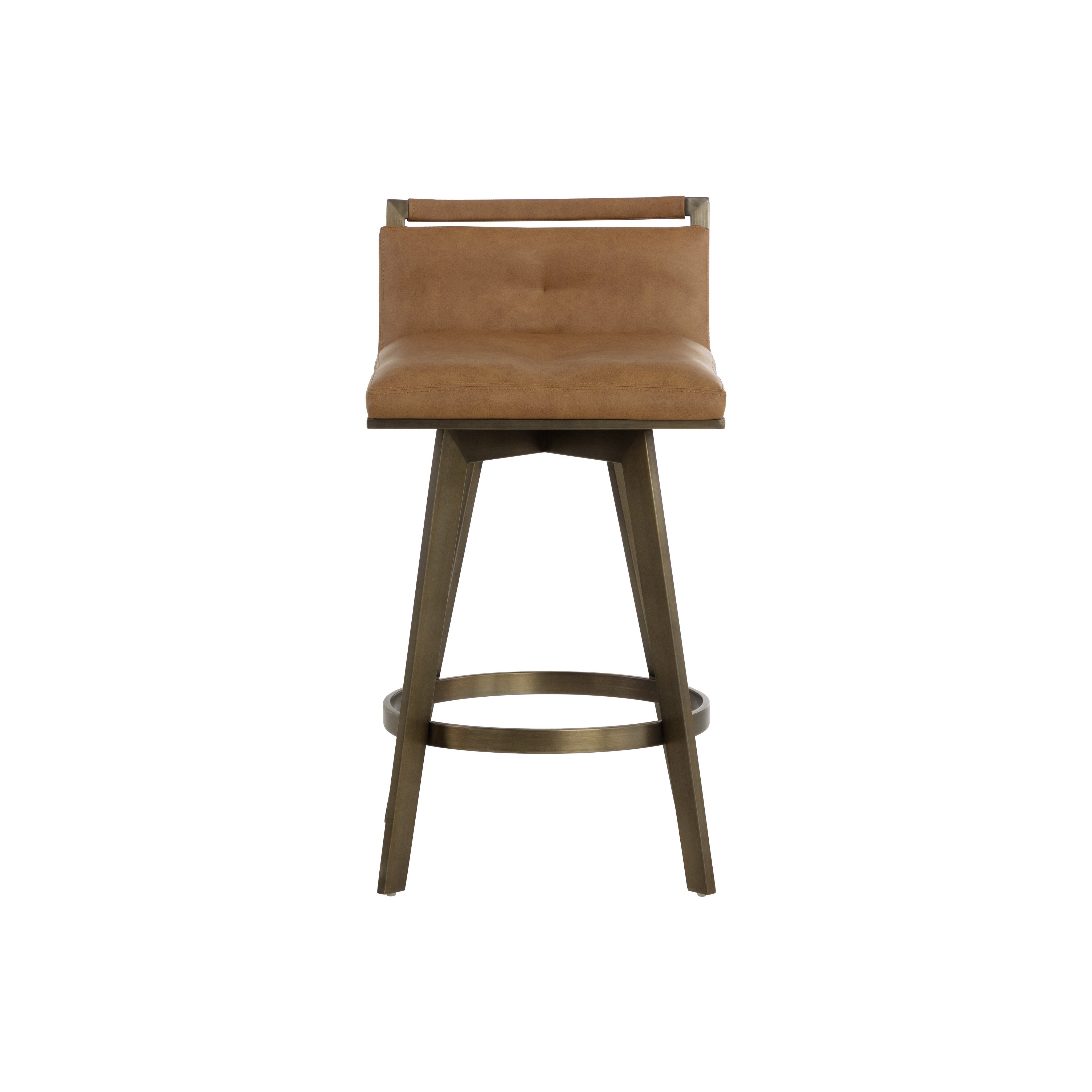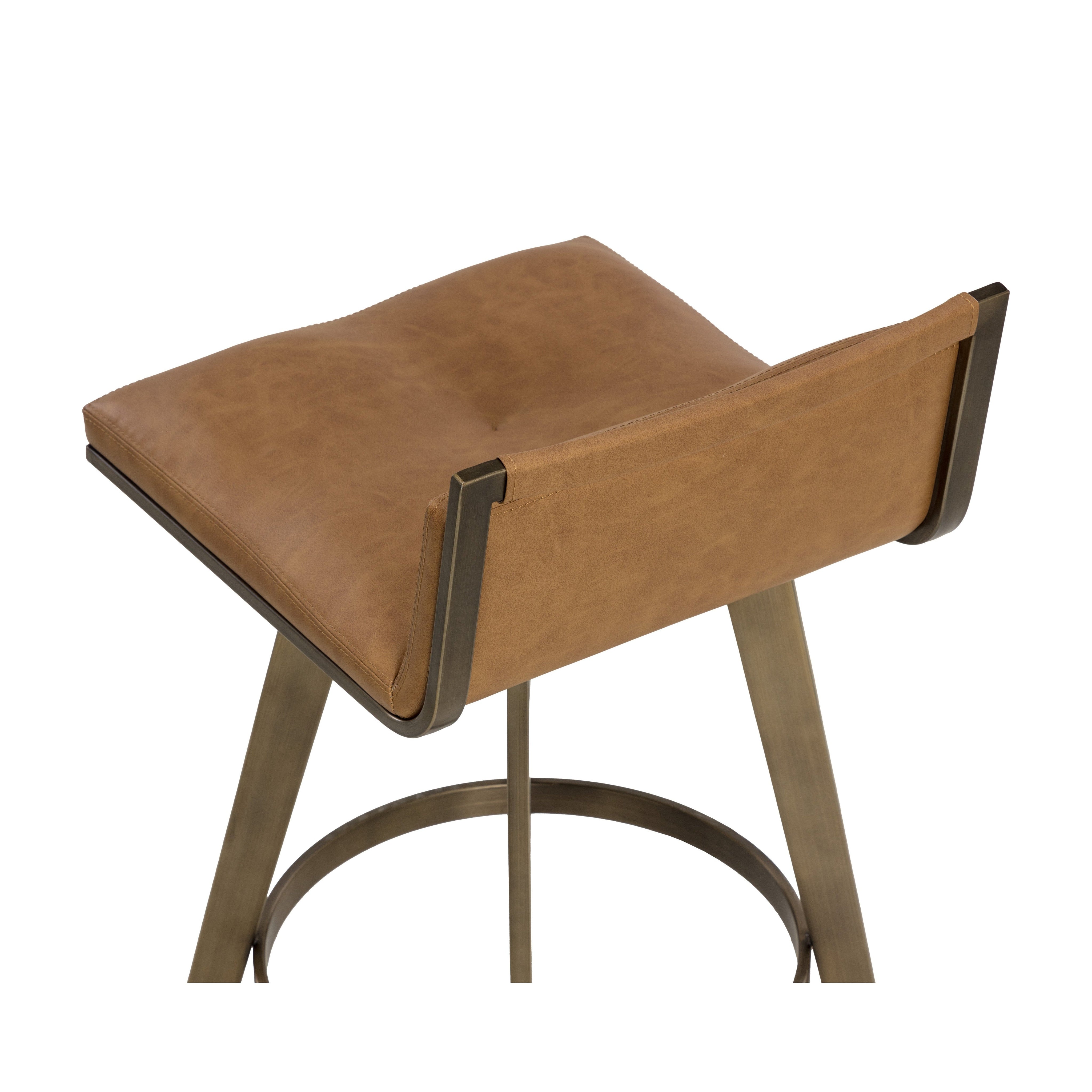 A stylish Art Deco inspired swivel counter stool with a low profile seatback. Features a partially exposed frame and legs made of stainless steel with an antique brass finish. Swivel features 360 degree swivel. Suitable for residential and commercial environments. Handle With Care: This design has been crafted with faux leather. Faux leather is manufactured to reflect the natural characteristics of leather; as such, colour variations, markings wrinkles, grooves, and light scratches are appreciated characteristics. No two pieces will be alike. Visit our Product Care page for more information on how to ensure the lasting beauty of this piece.