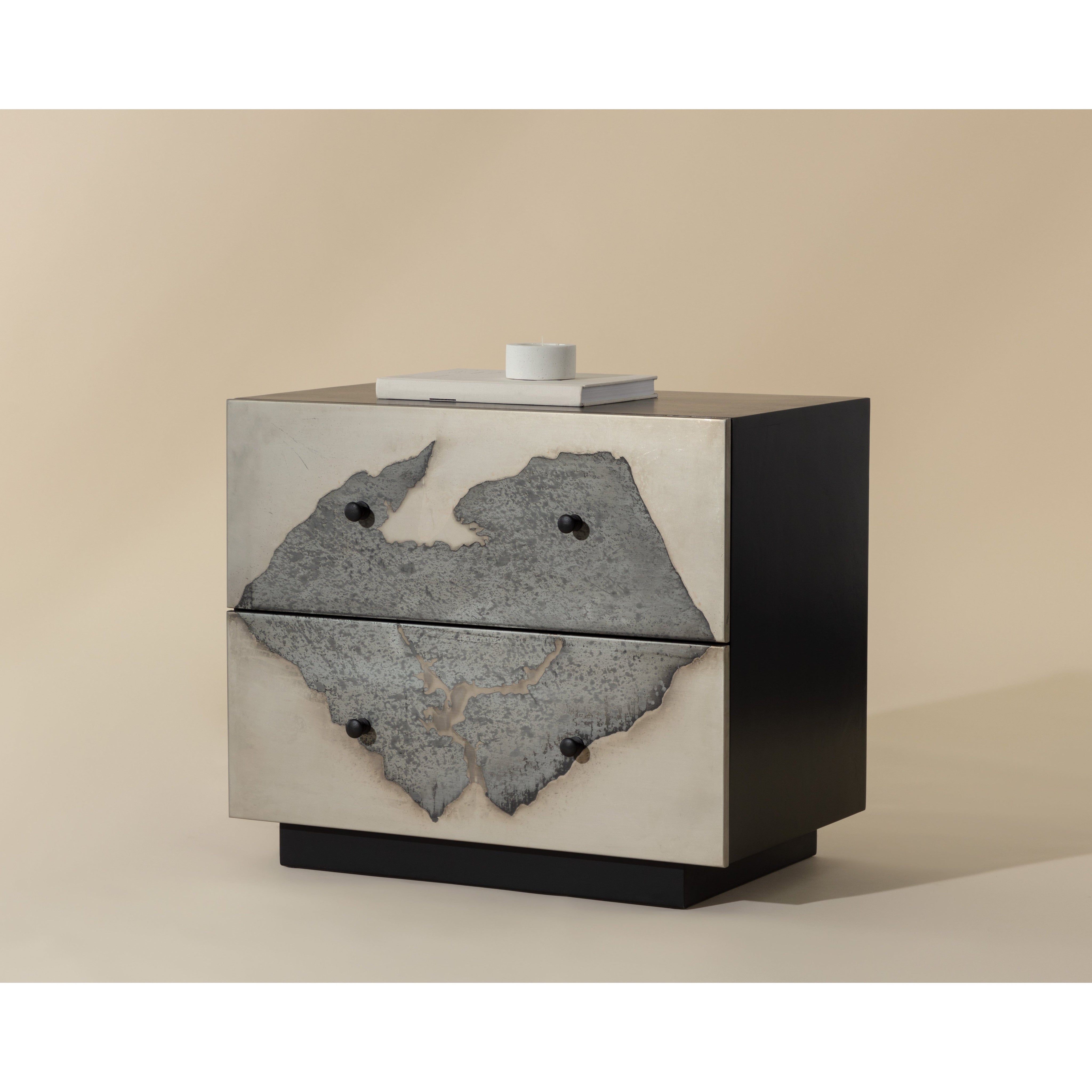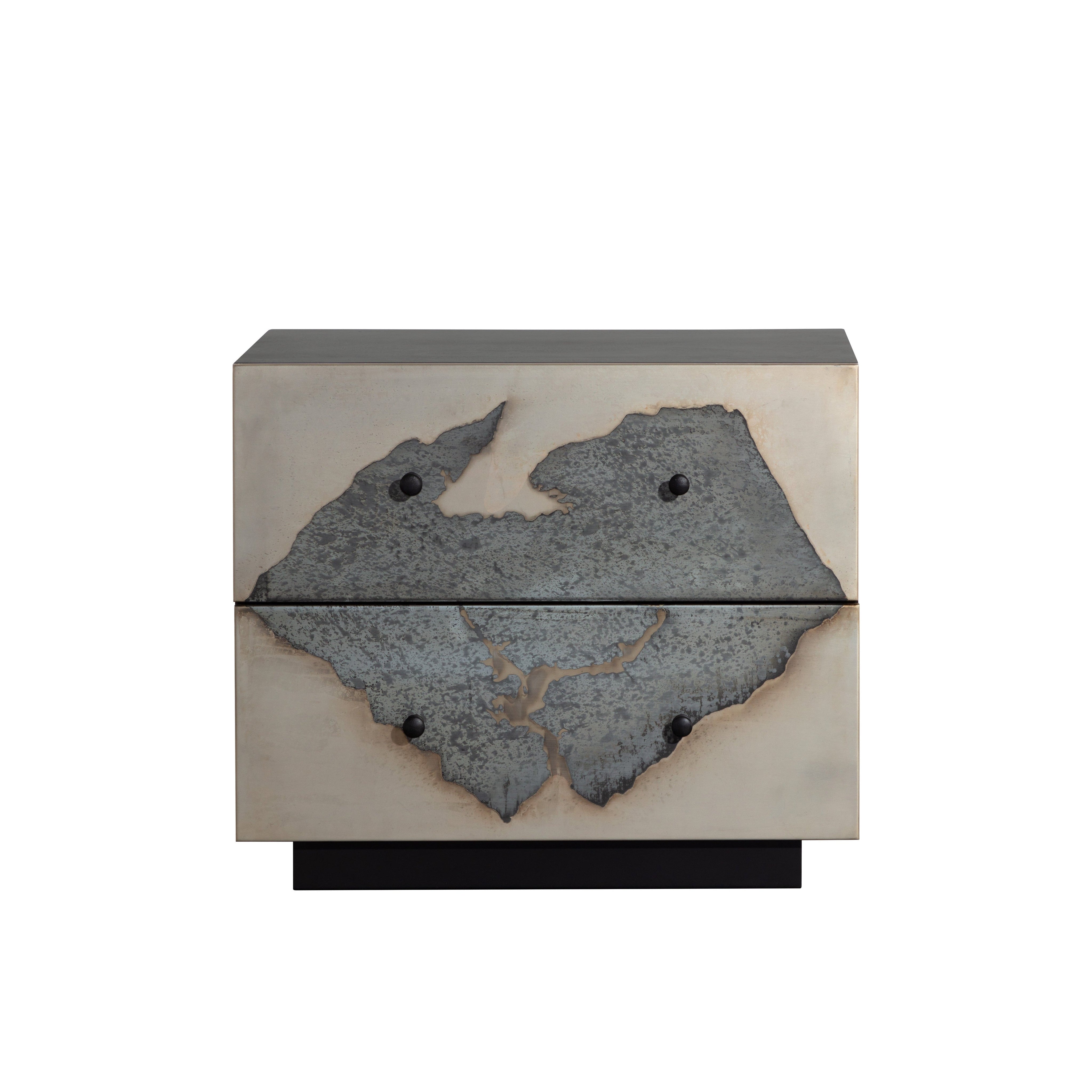 Make a bold statement with this unique nightstand. The drawers feature a one-of-a-kind patina finish, boldly contrasted with a black iron frame. Made in India. With refined craftsmanship, this design was brought to life by skilled local artisans. By nature, these materials develop unique imperfections such as markings and colour variations for a truly one-of-a-kind piece. Pictures shown reflect the lightest and darkest variations of our Arlington patina finish. Actual product may range between these finishes.