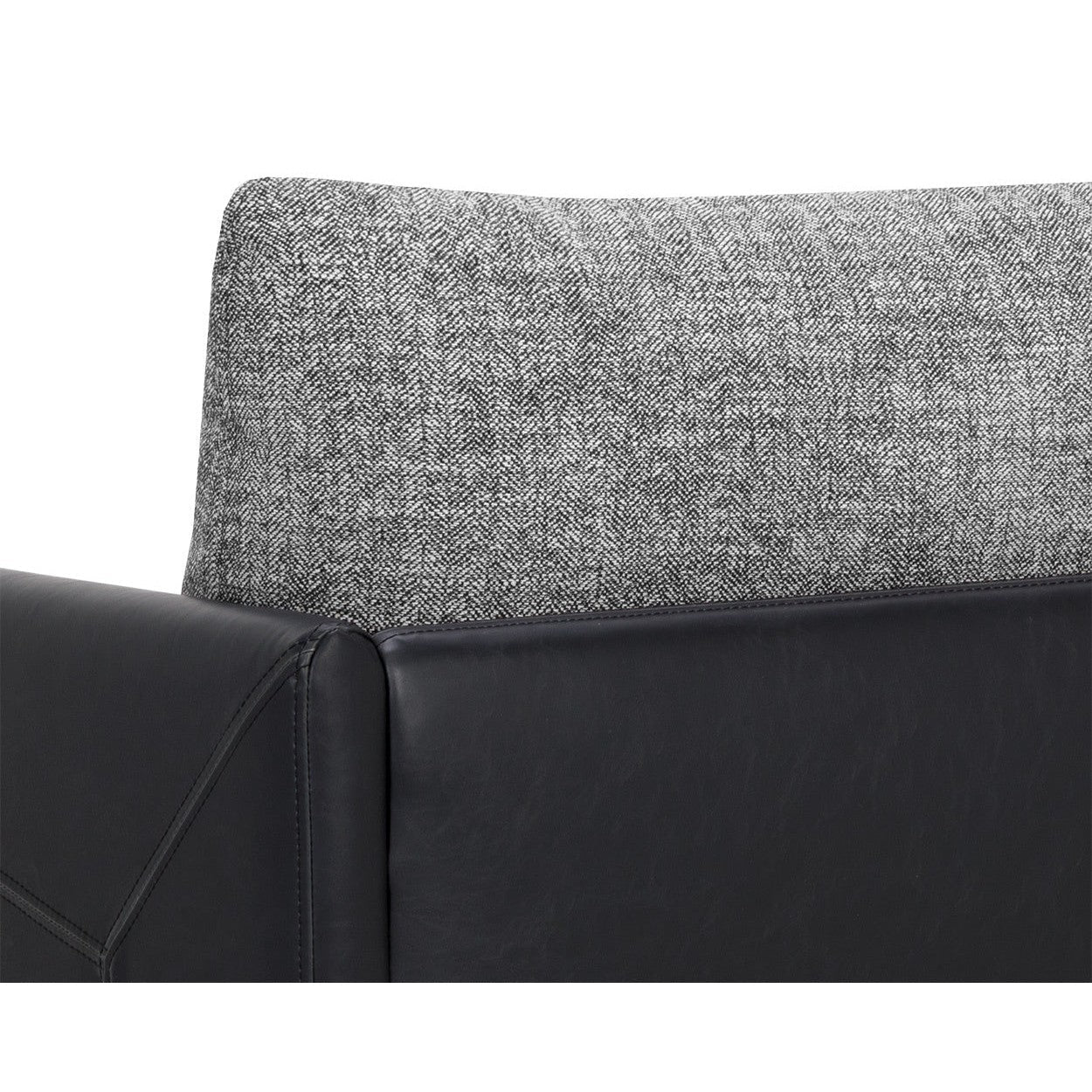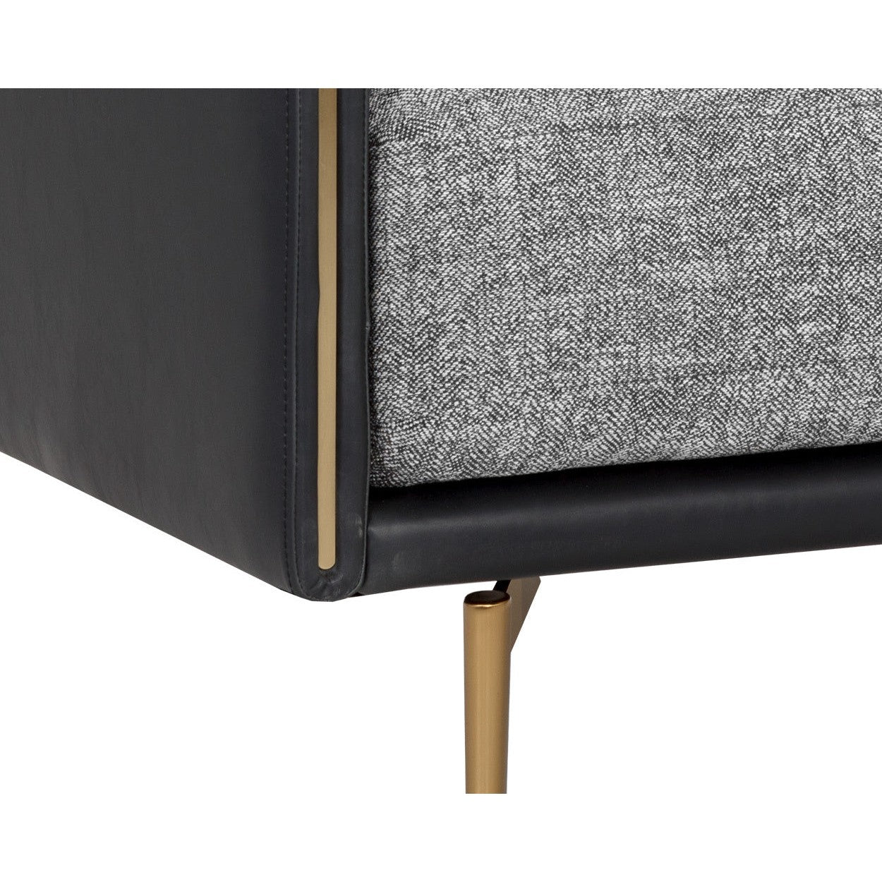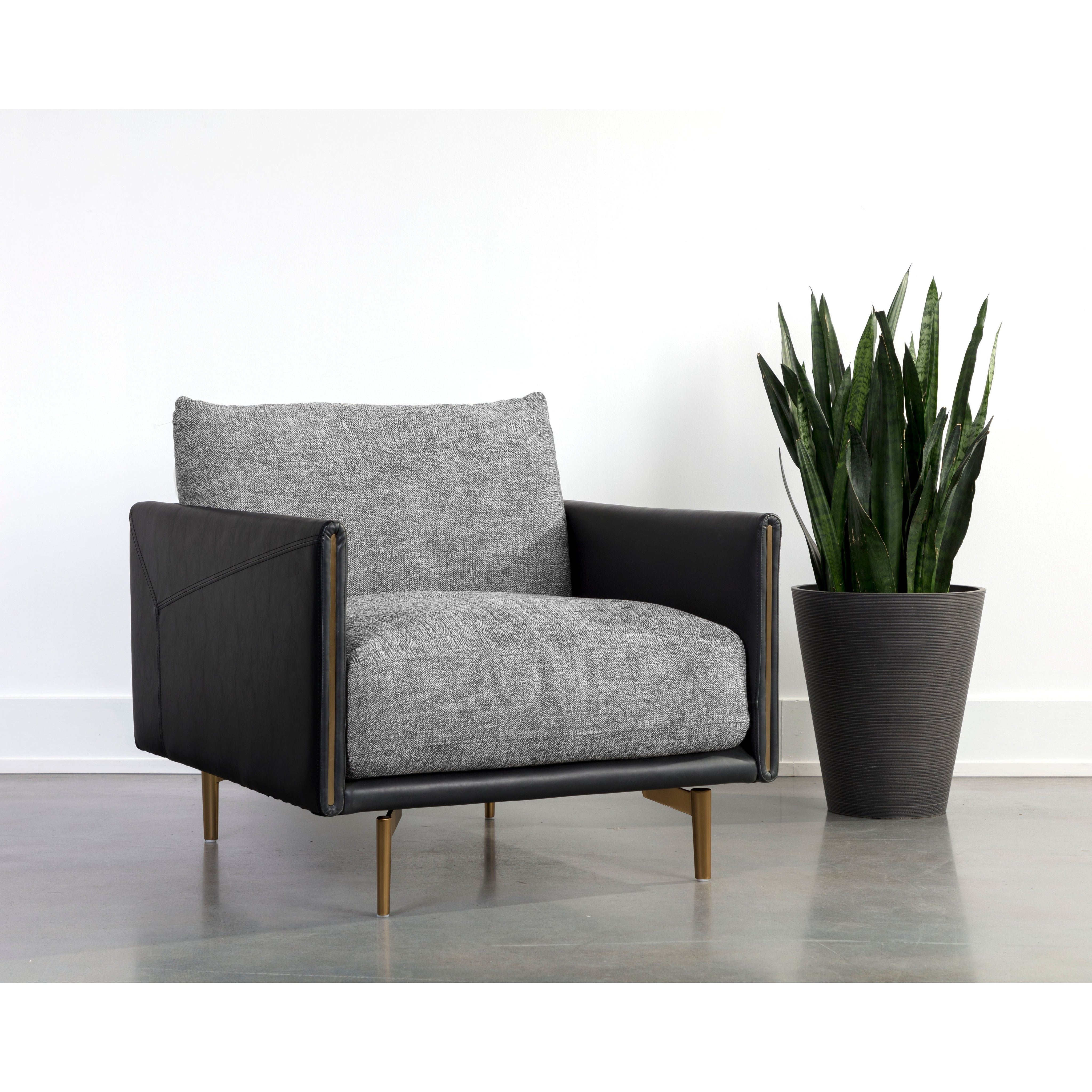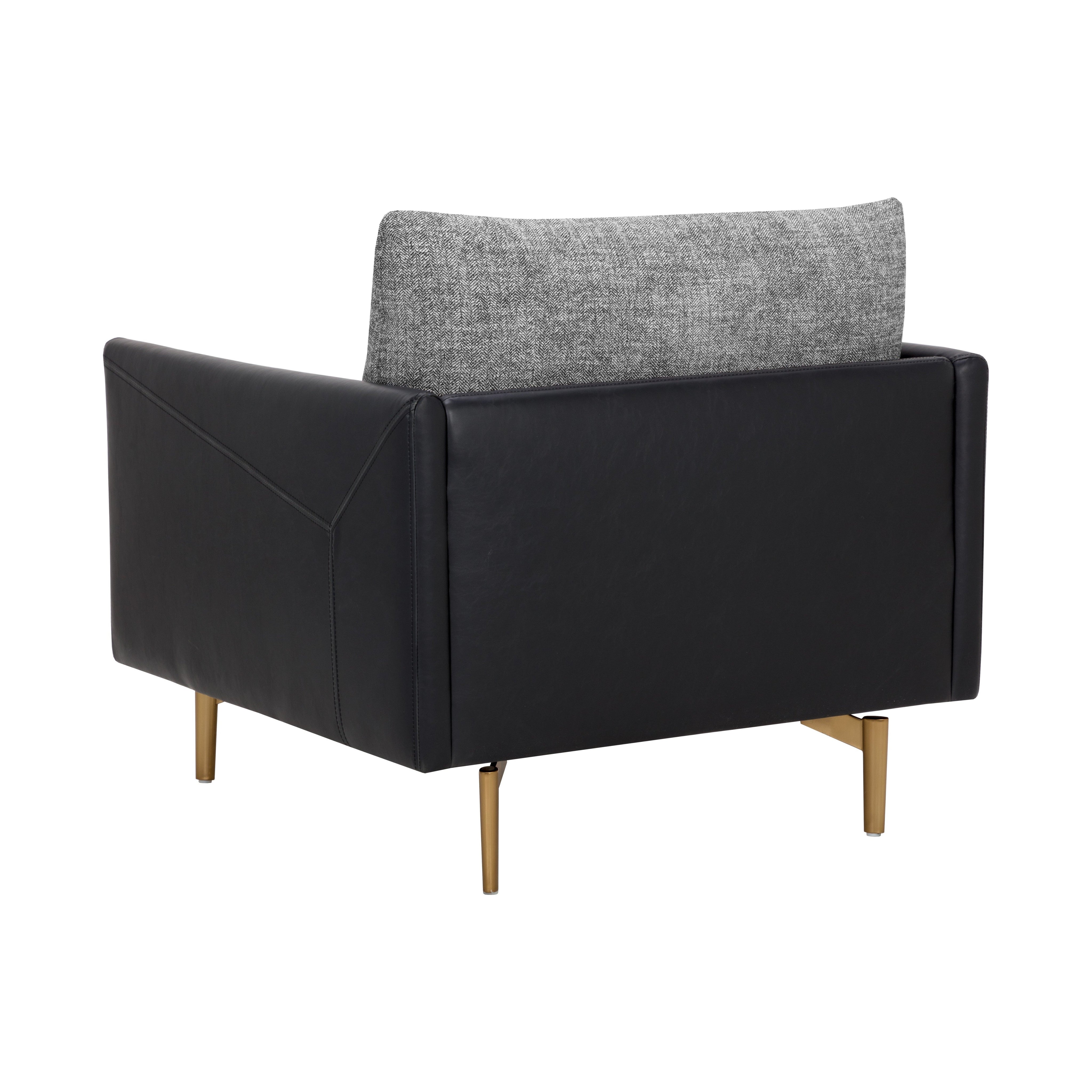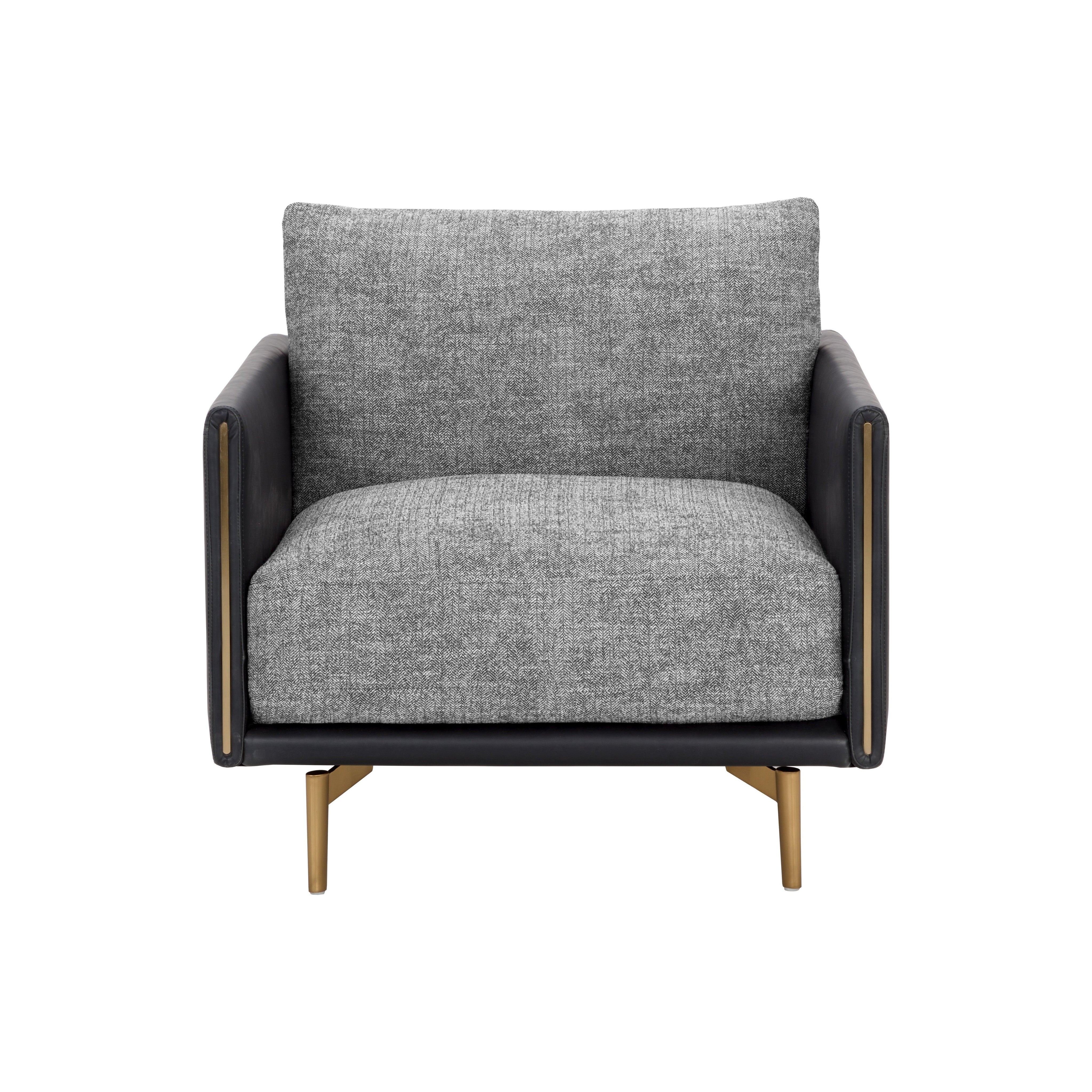 Mixed materials and contrasting colours give the Ashi Armchair an elevated design. Soft cushioning upholstered in nash zebra fabric provides ample comfort. Stitched detailing on the side of the arms gives a subtle geometric design that enhances the coal black faux leather frame. Satin brass aluminum on the legs and trim on the front of the arms ties the look together. Handle With Care: This design has been crafted with faux leather. Faux leather is manufactured to reflect the natural characteristics of leather; as such, colour variations, markings, wrinkles, grooves, and light scratches are appreciated characteristics. No two pieces will be alike. Visit our Product Care page for more information on how to ensure the lasting beauty of this piece.