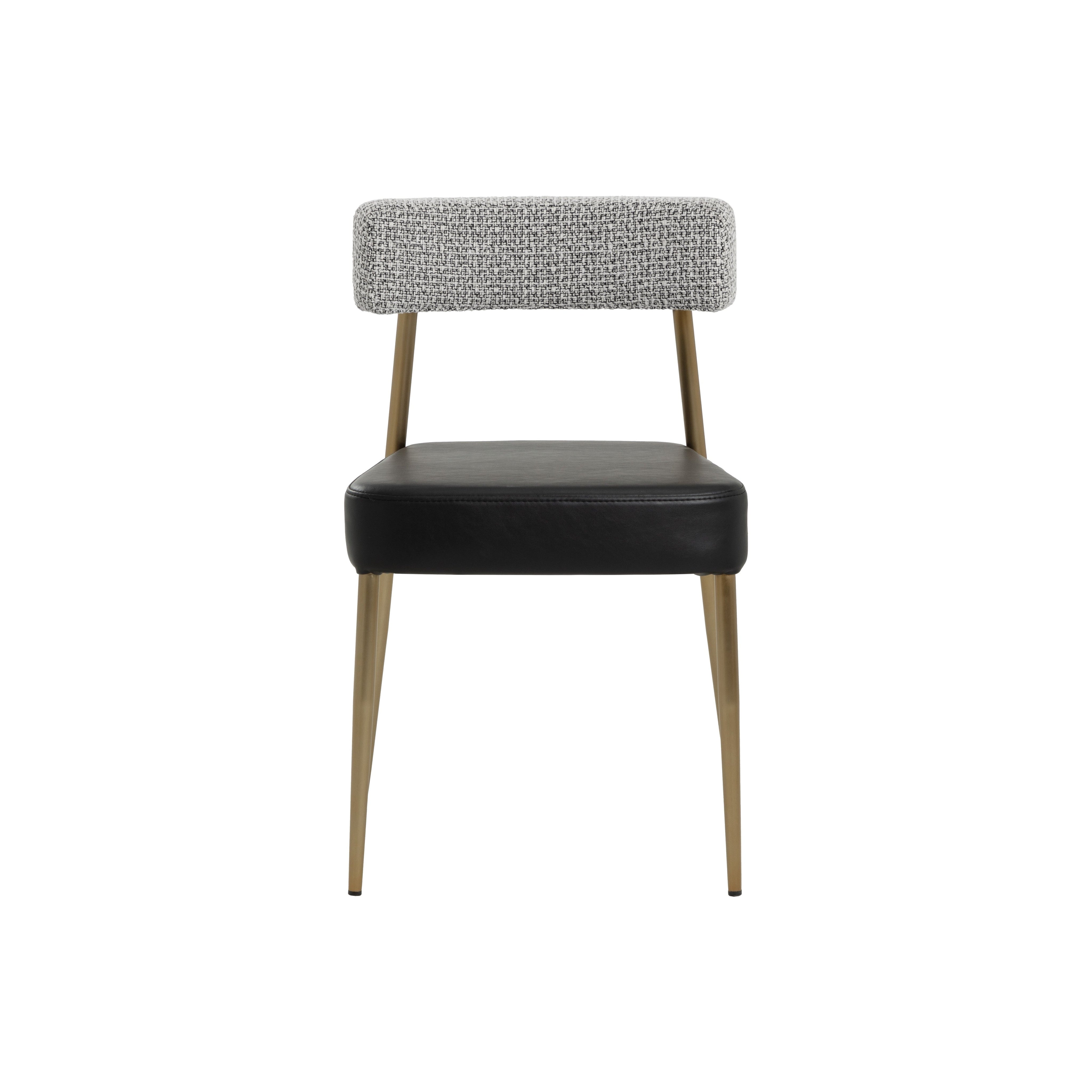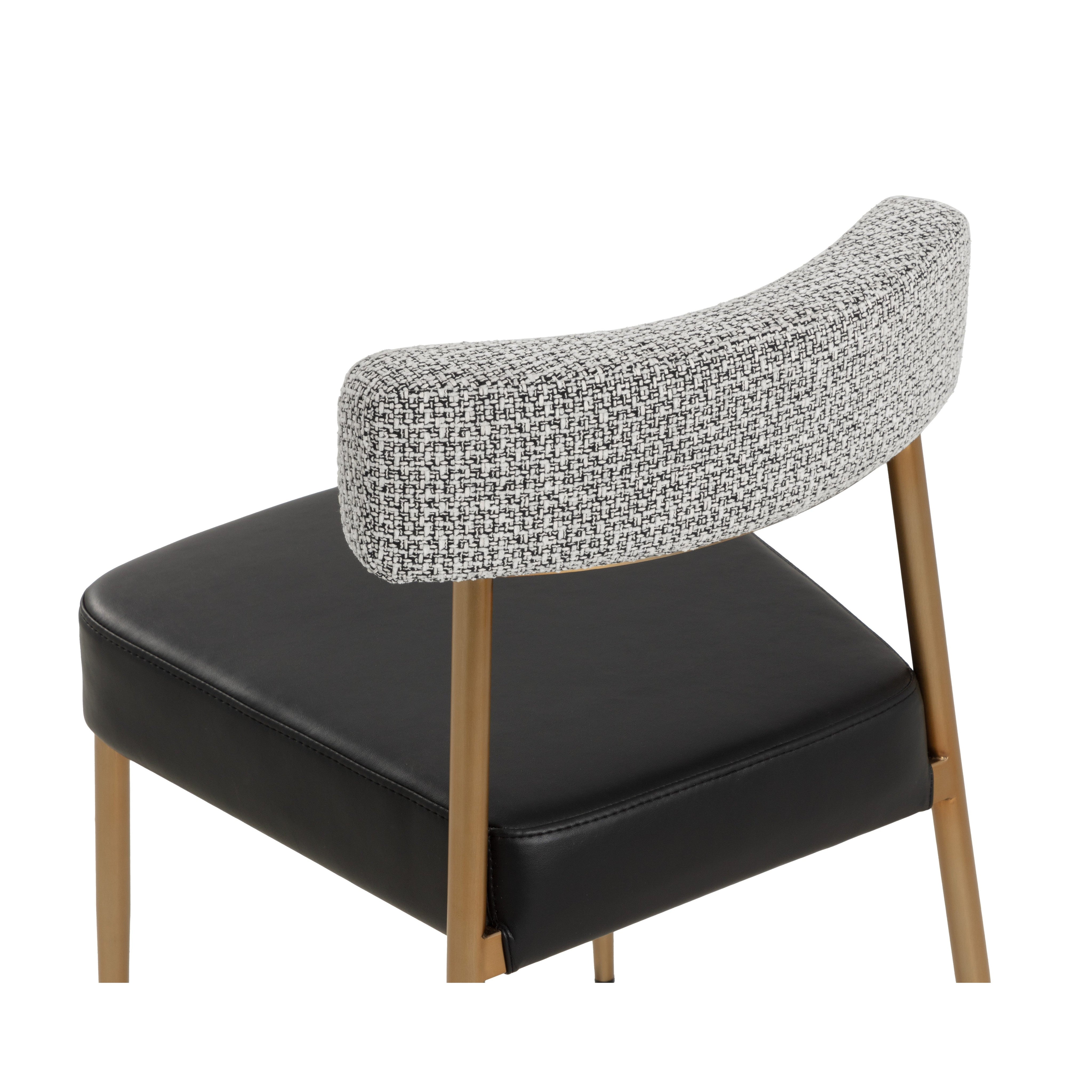 The Ashwin Stackable Dining Chair exudes effortless style with clean functional design. Textured helios check black fabric on the curved backrest contrasts with the bravo black faux leather seat for a sophisticated look. A sturdy powder-coated steel frame in a luxe gold finish enhances its modern appeal.