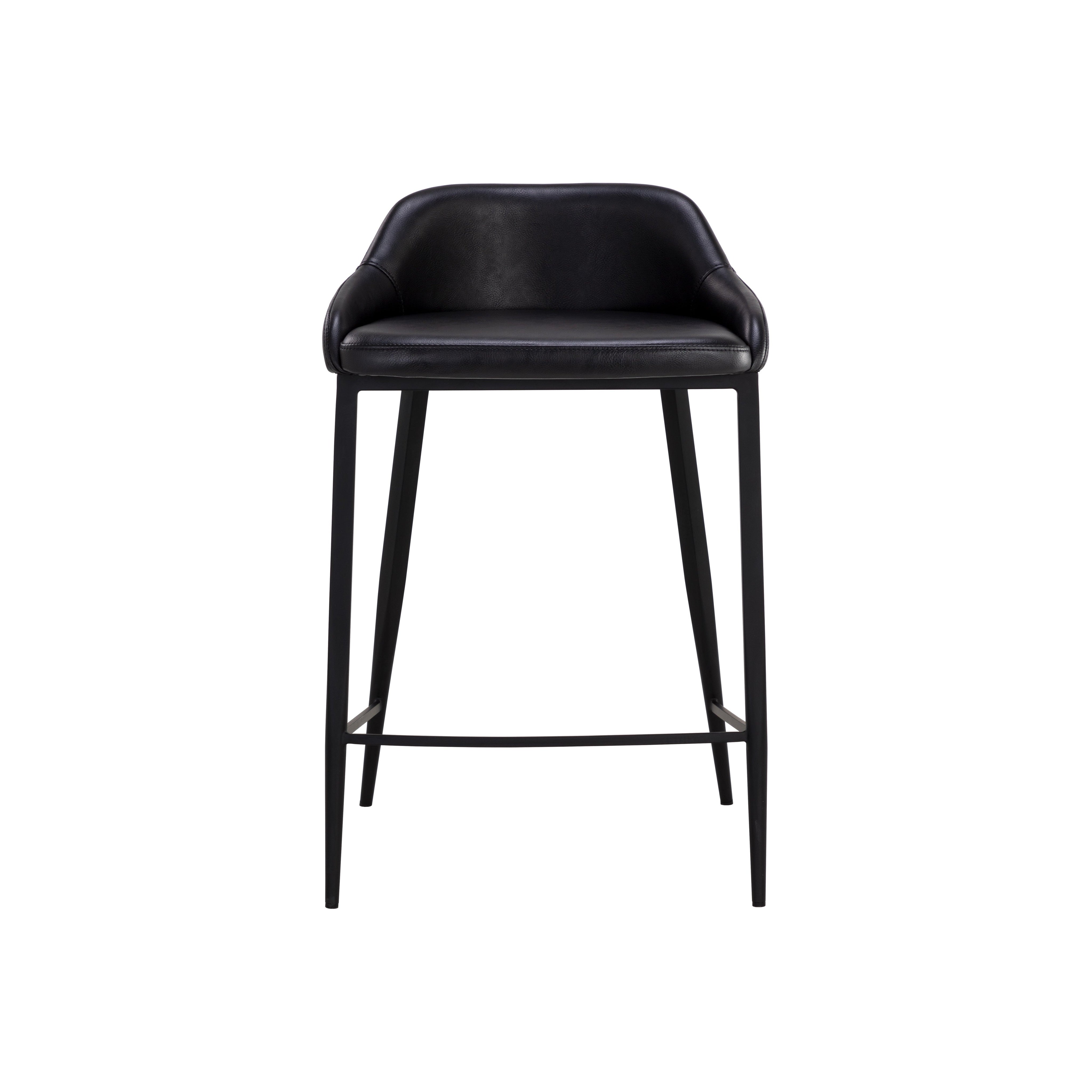 The Astra Counter Stool is distinguished by its strong modern silhouette and sleek black powder-coated iron legs. Smooth nightfall black faux leather wraps around a comfortable low back seat. Handle With Care: This design has been crafted with faux leather. Faux leather is manufactured to reflect the natural characteristics of leather; as such, colour variations, markings, wrinkles, grooves, and light scratches are appreciated characteristics. No two pieces will be alike. Visit our Product Care page for more information on how to ensure the lasting beauty of this piece.