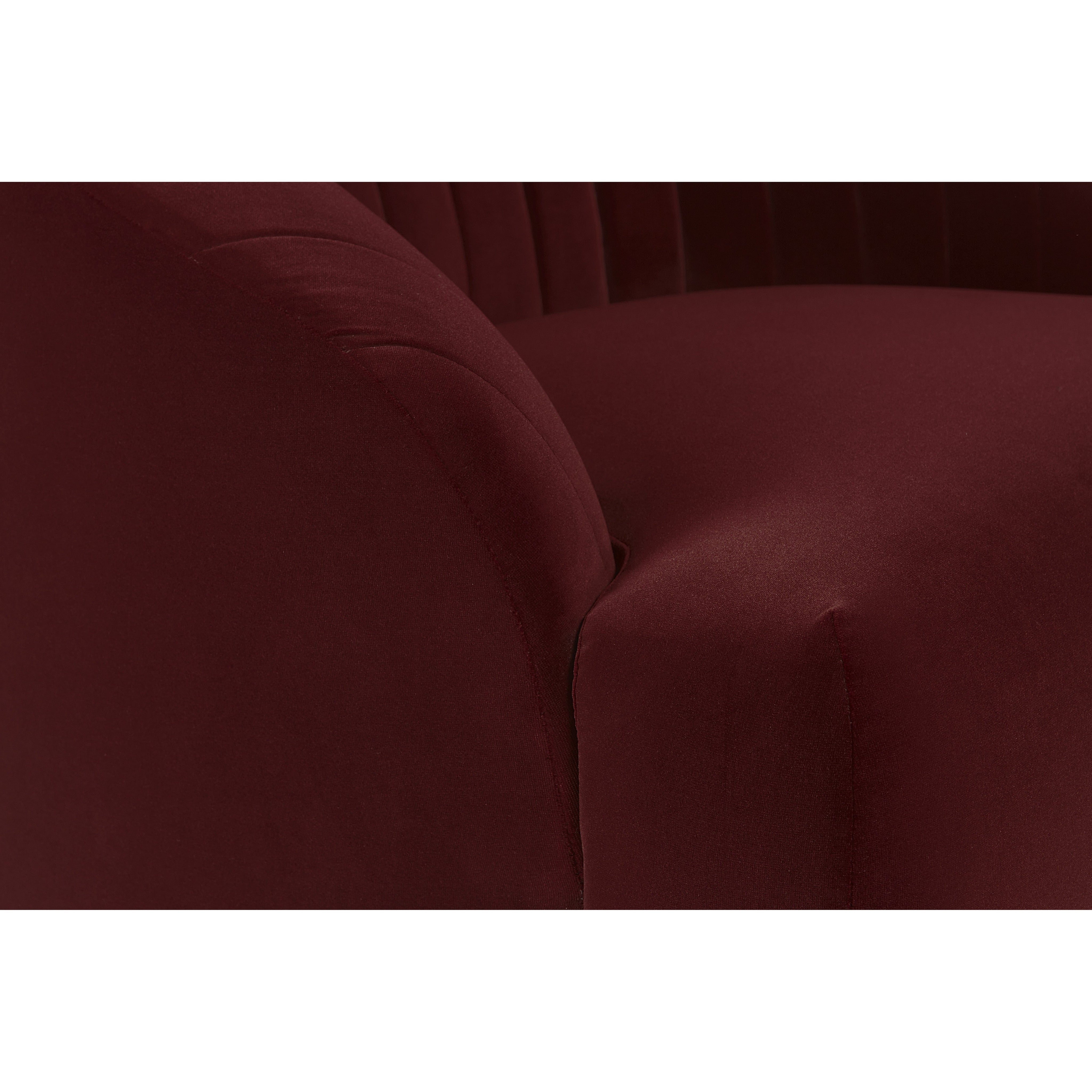 The beautiful lines of this chair will make a bold and comfortable statement in any space. Features a curved seatback with channel tufting in velvet merlot fabric. Finished with an antique brass iron frame.
