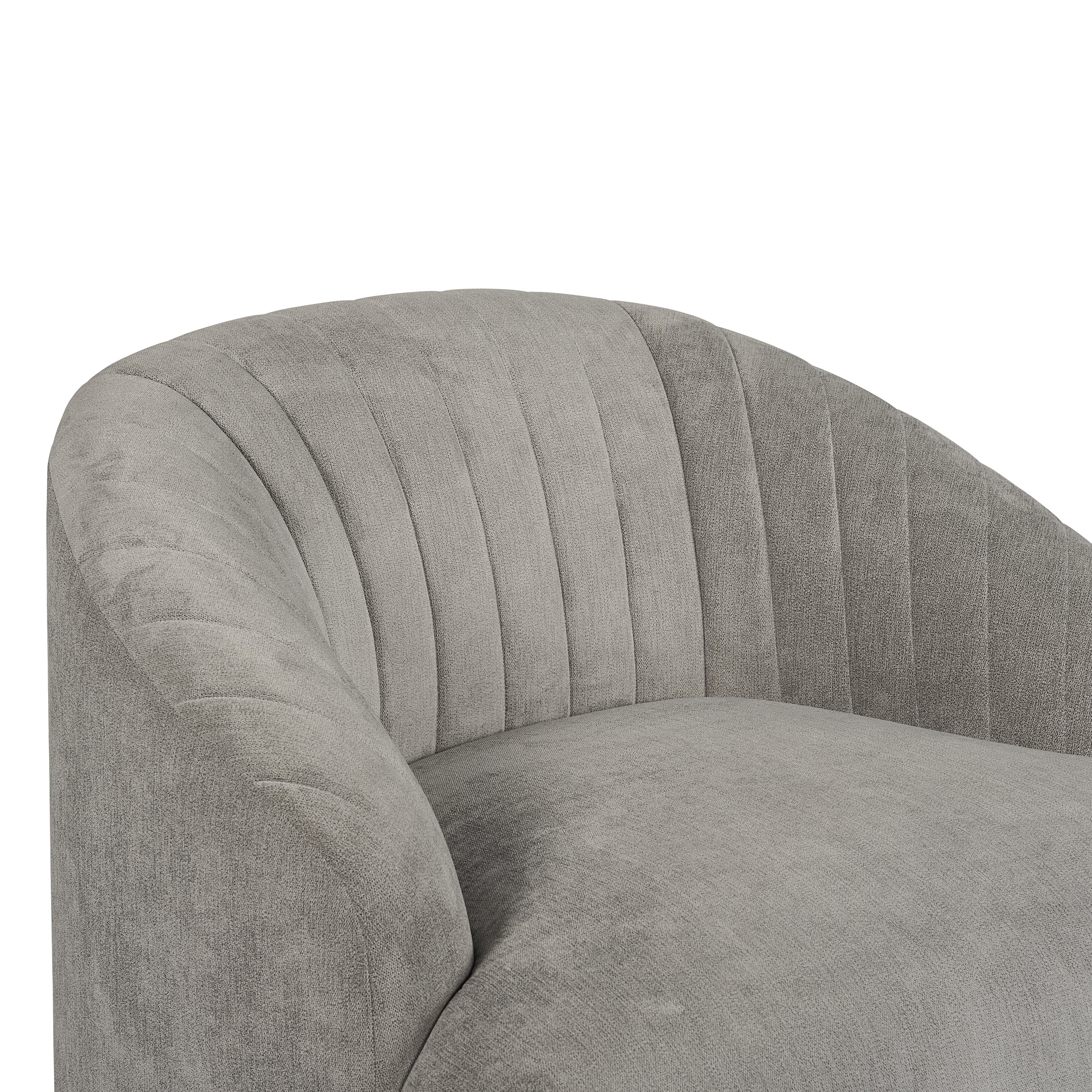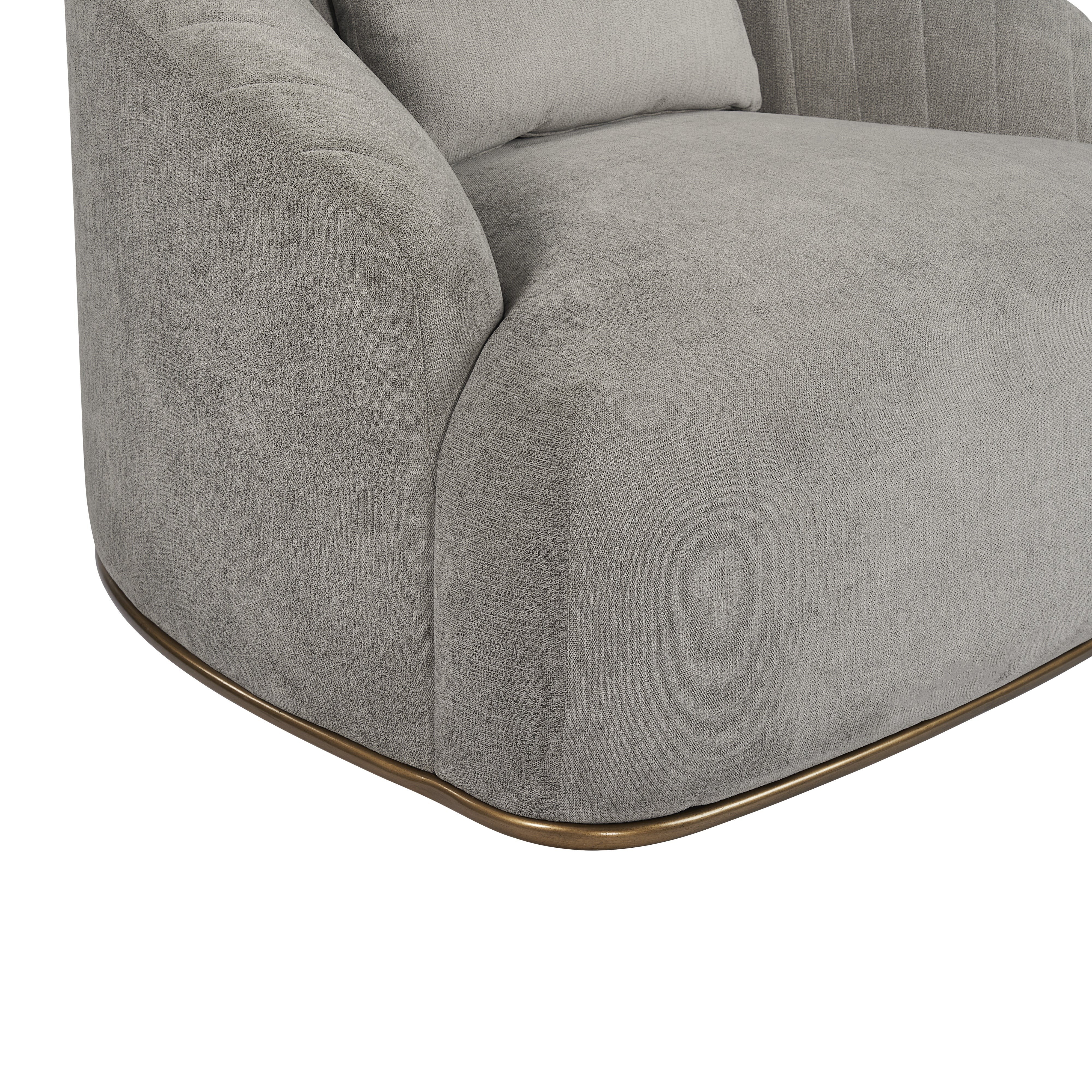 The beautiful lines of this chair will make a bold and comfortable statement in any space. Features a curved seatback with channel tufting in polo club stone performance fabric. Finished with an antique brass steel frame. Performance fabric is moisture repellent, durable and easy to clean.