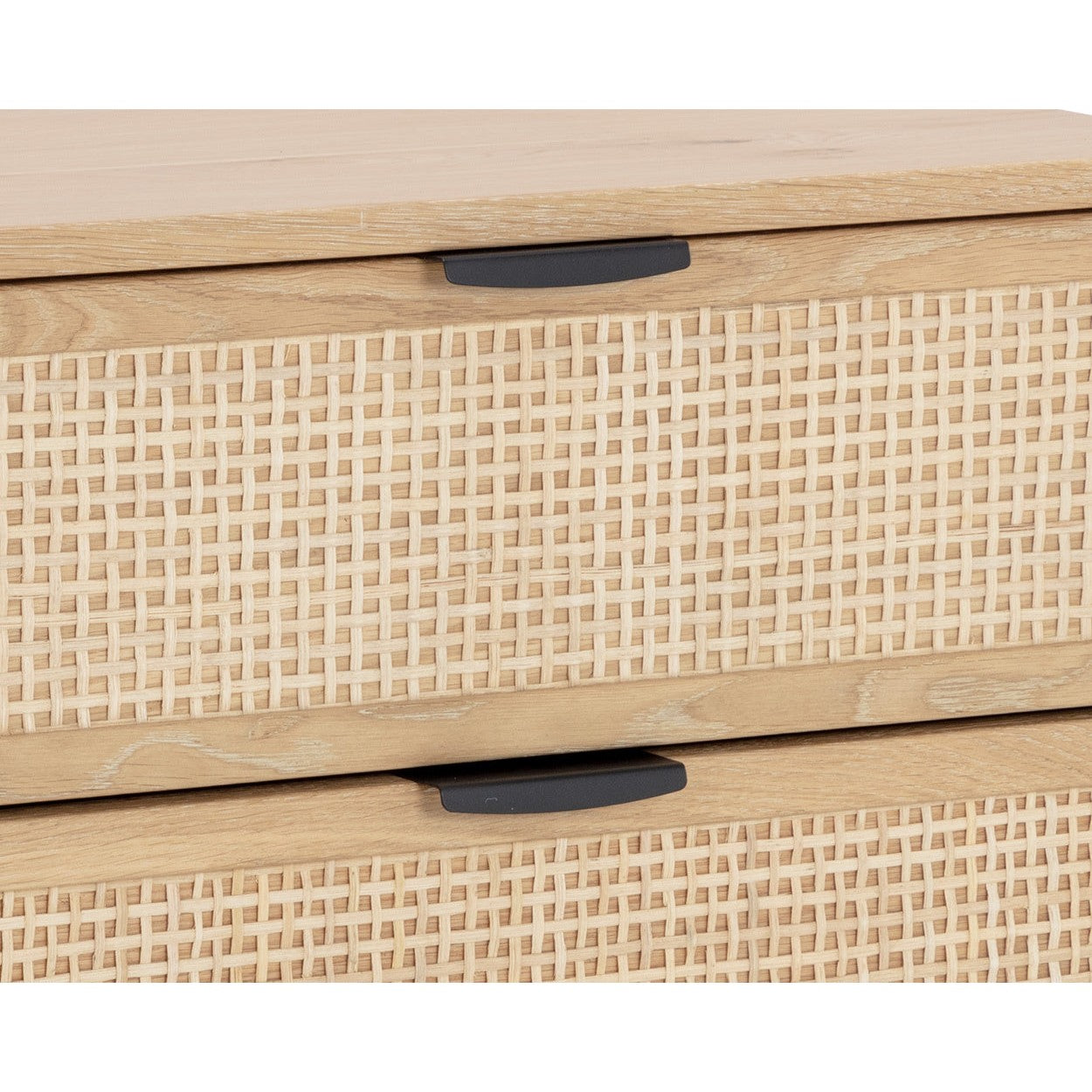 Create a bedroom influenced by global travels with this stylish nightstand crafted in Indonesia. Features two natural rattan drawers contrasted with a rustic oak wood frame. Matte black iron feet and matching iron handles complete the design.