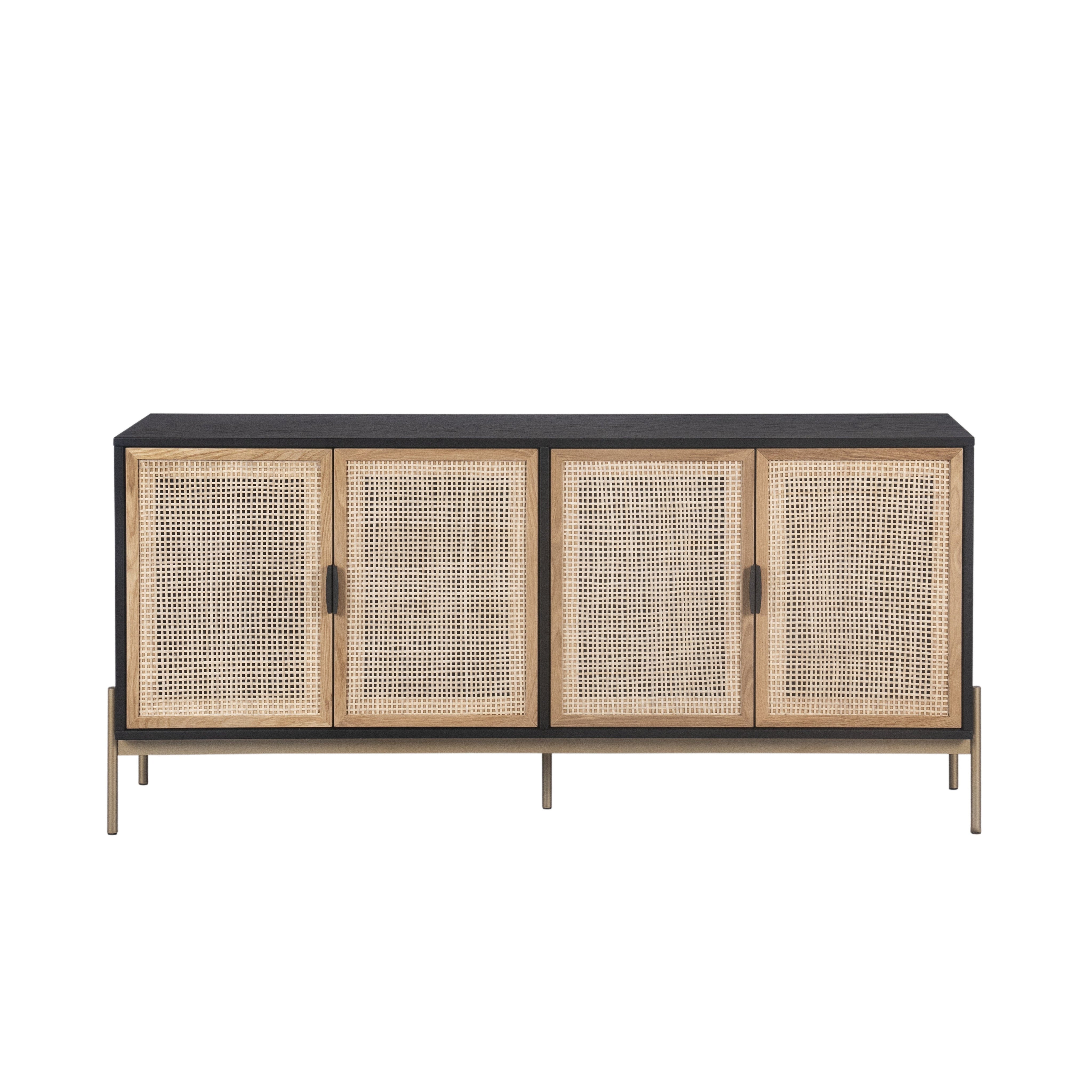 Create a space influenced by global travels with this stylish sideboard crafted in Indonesia. Features four natural rattan cabinets contrasted with a black oak wood frame. Gold iron feet and matte black steel handles complete the design.