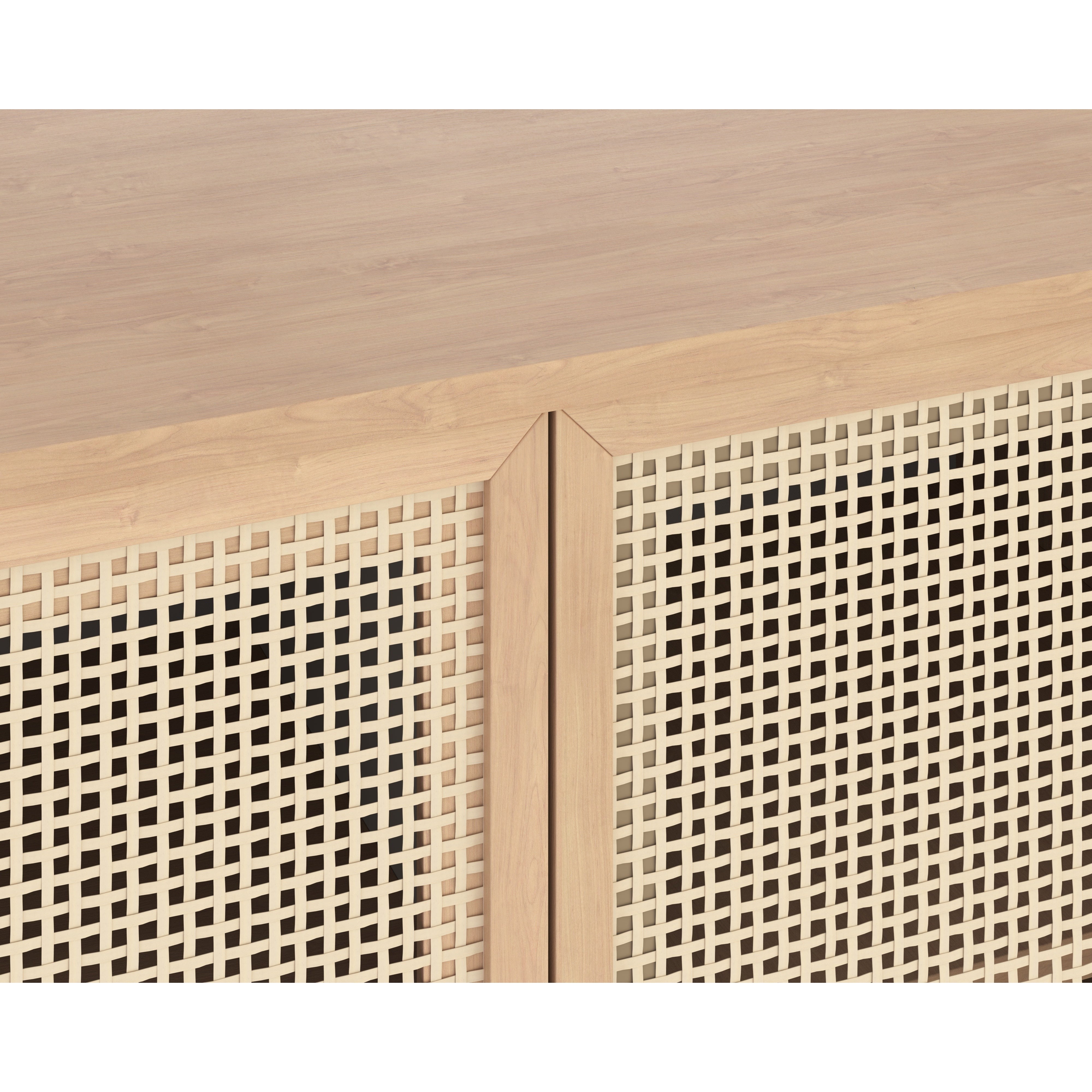 Create a space influenced by global travels with this stylish sideboard crafted in Indonesia. Features two natural rattan cabinets contrasted with a rustic oak wood frame. Black iron feet and matte black iron handles complete the design.