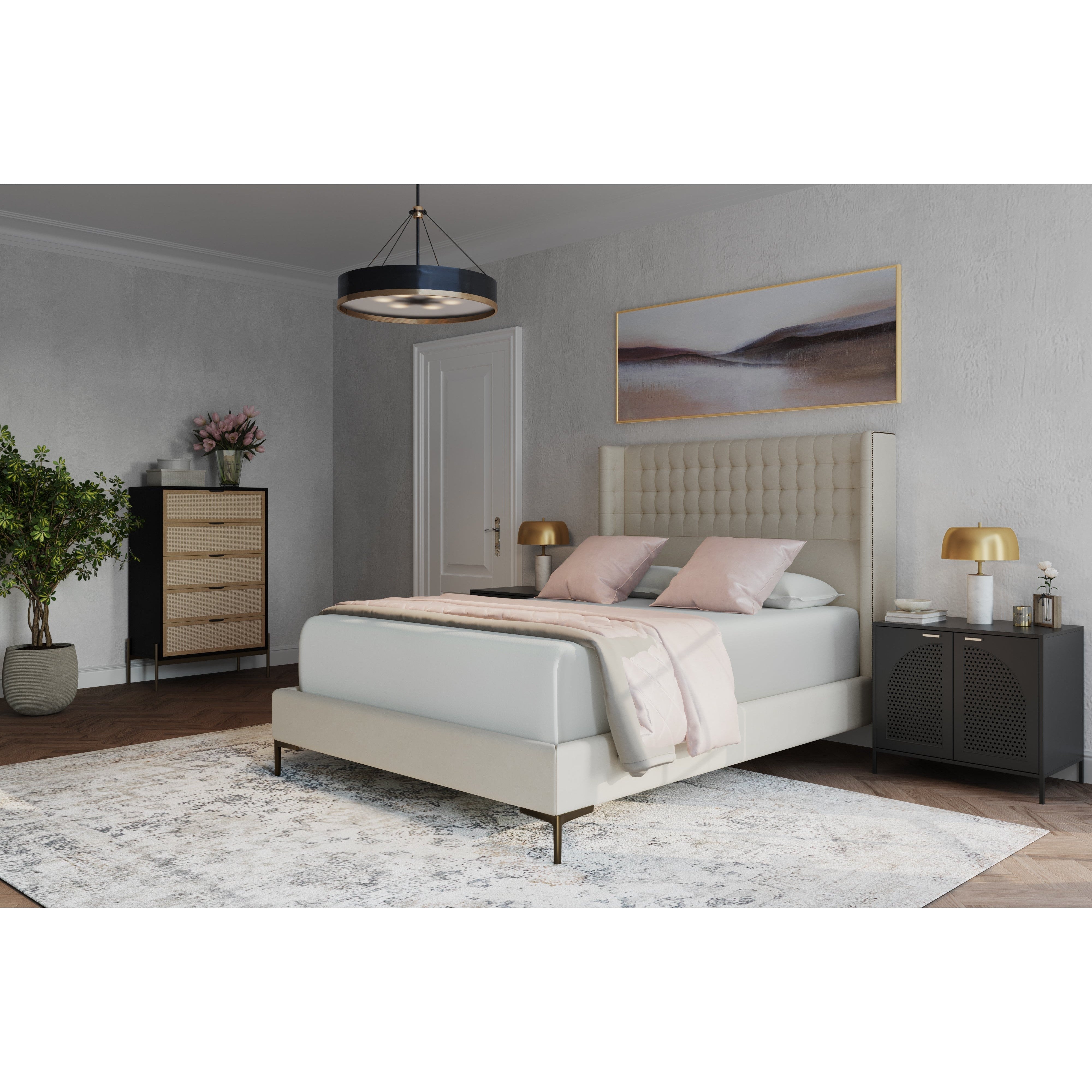 A timeless nightstand with a streamlined composition. Crafted with a black metal frame and completed with brass handles. Features open shelving and two cabinets with an arched perforated metal design. Made in India. With refined craftsmanship, this design was brought to life by skilled local artisans. By nature, these materials develop unique imperfections such as markings and colour variations for a truly one-of-a-kind piece.