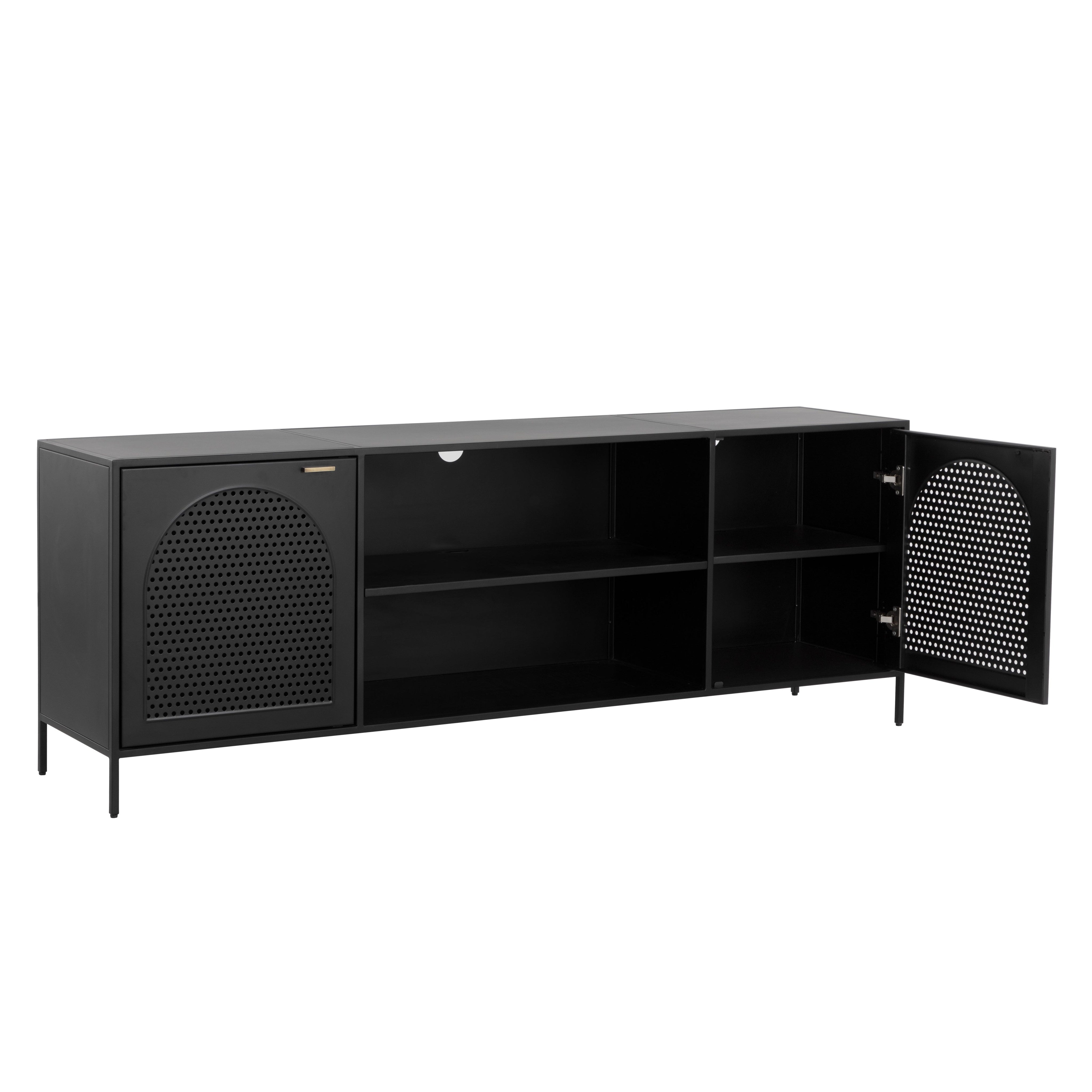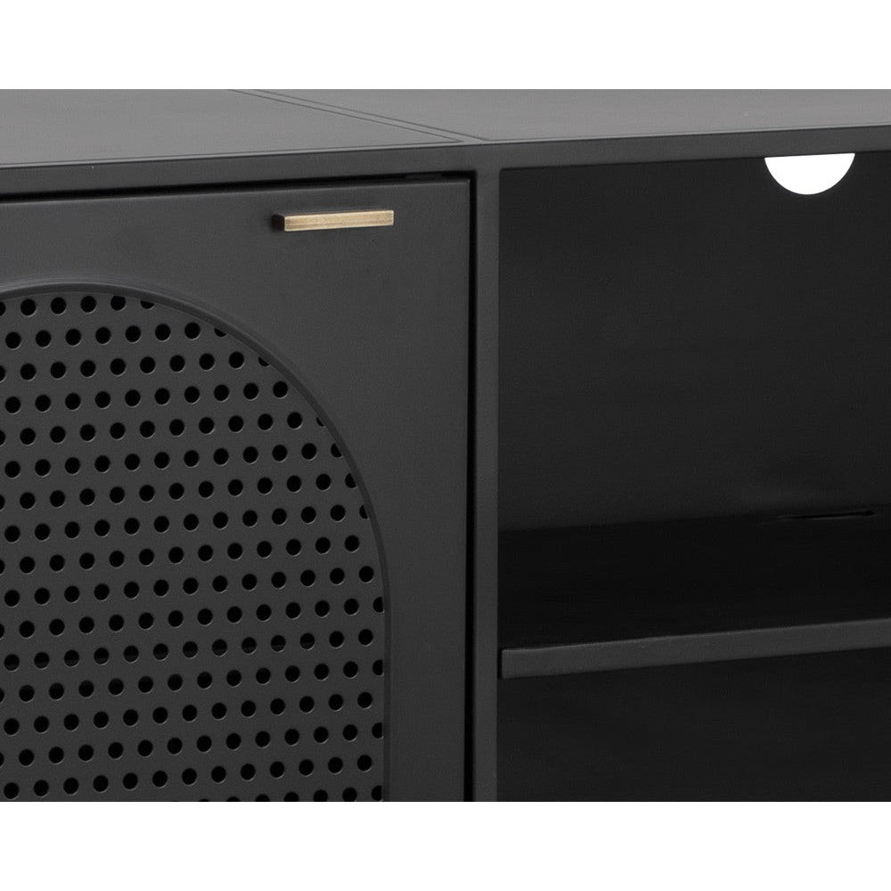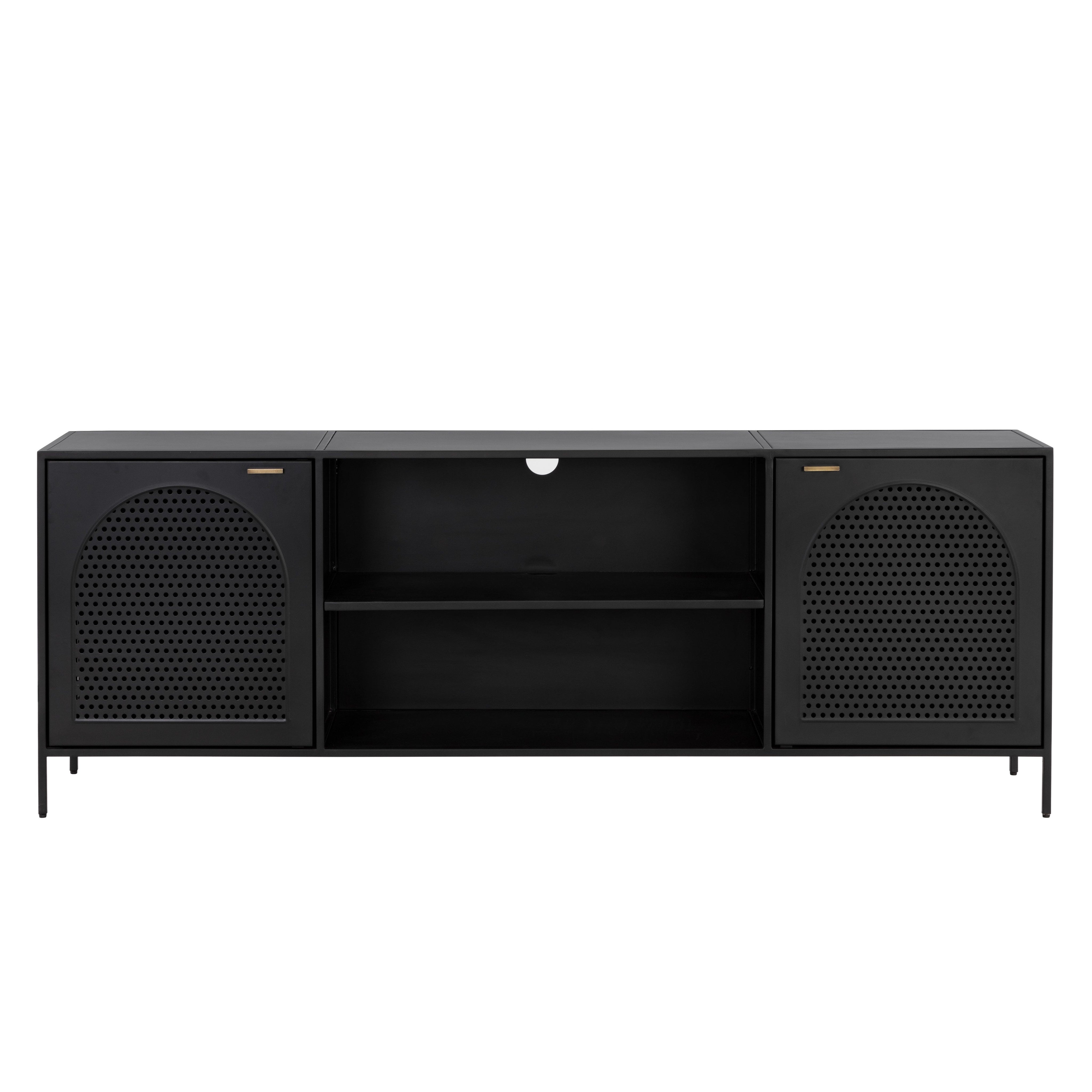 An industrial media console and cabinet with a streamlined composition. Crafted with a black metal frame and completed with brass handles. Features three cord management openings, open shelving and two cabinets with an arched perforated metal design. Made in India. With refined craftsmanship, this design was brought to life by skilled local artisans. By nature, these materials develop unique imperfections such as markings and colour variations for a truly one-of-a-kind piece.