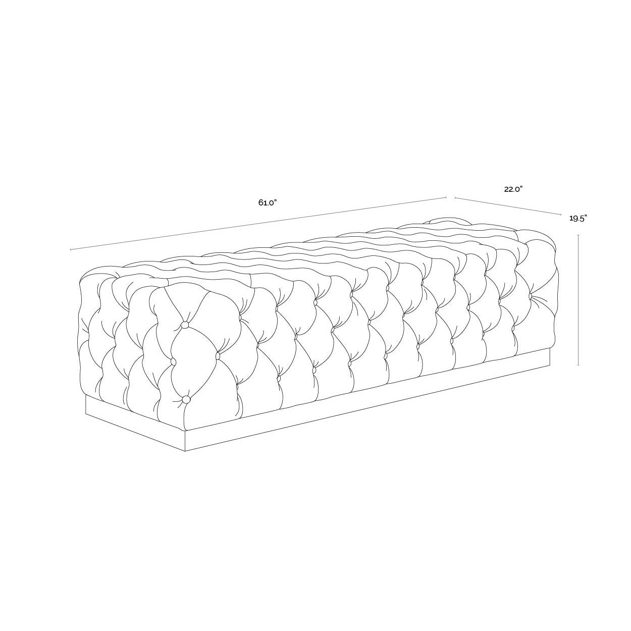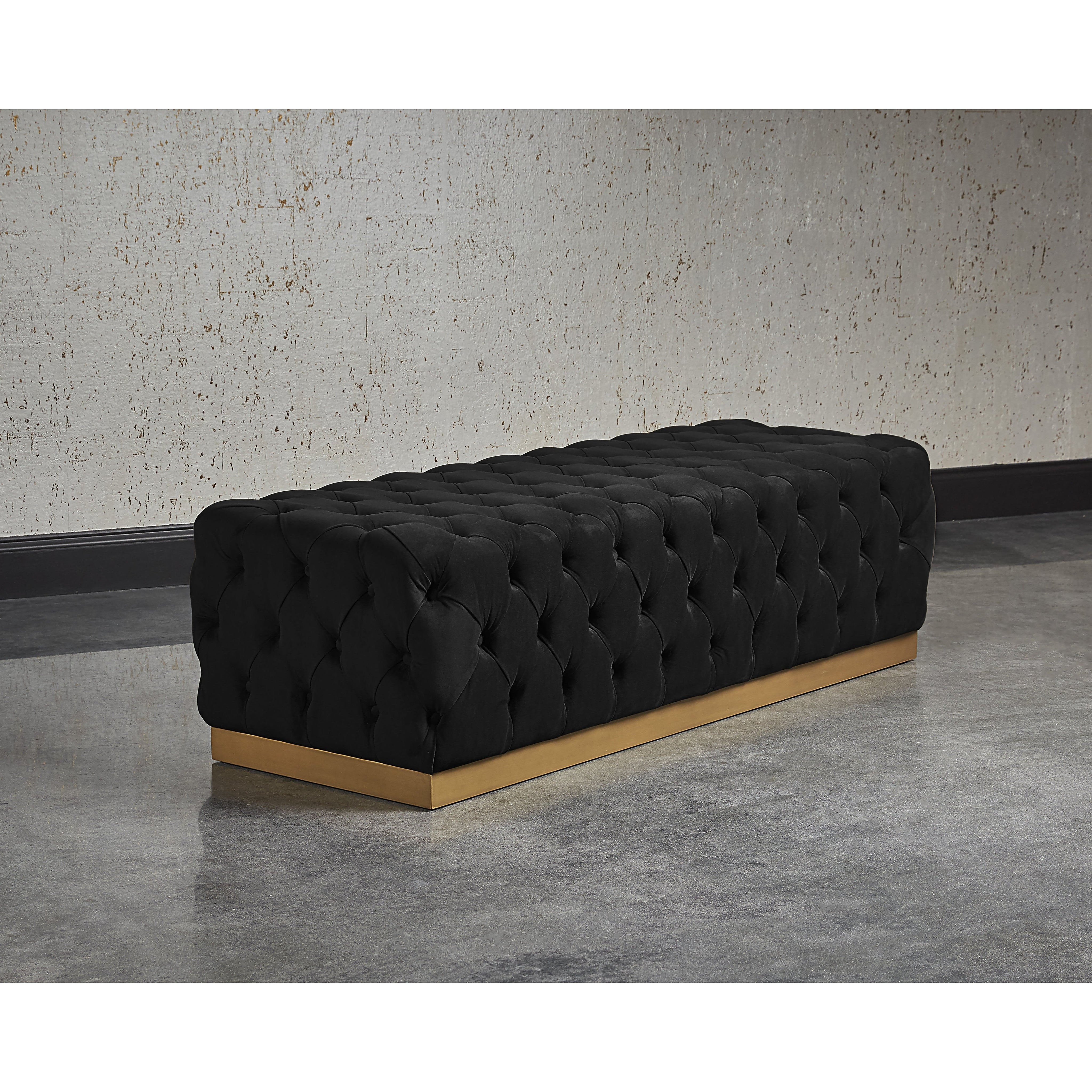 This classic bench incorporates feminine form and flair. Designed with deep tufting in luxurious abbington black fabric and finished with a powder-coated burnished brass steel base. Offers glamourous style as a coffee table or as extra seating.