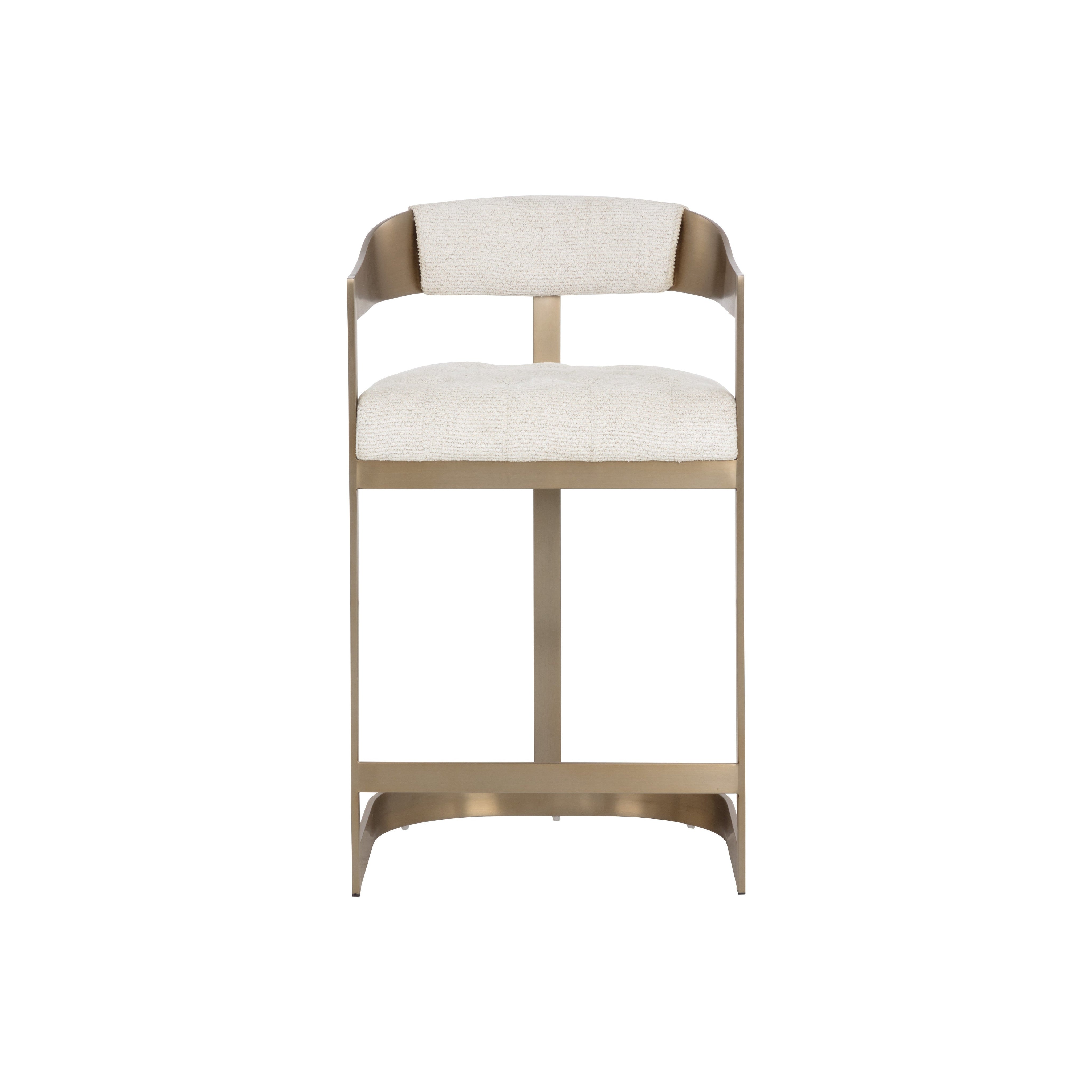 This ultra contemporary counter stool features a T-shaped back, tapered arms and an antique brass crown base. Stocked in rhea light barley fabric. Perfectly suited for various dining, kitchen and bar spaces of commercial and residential settings.