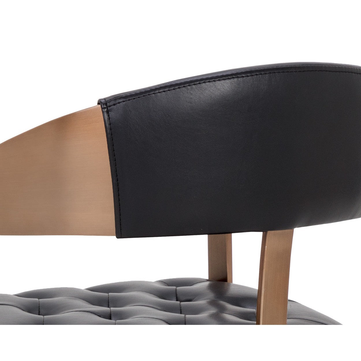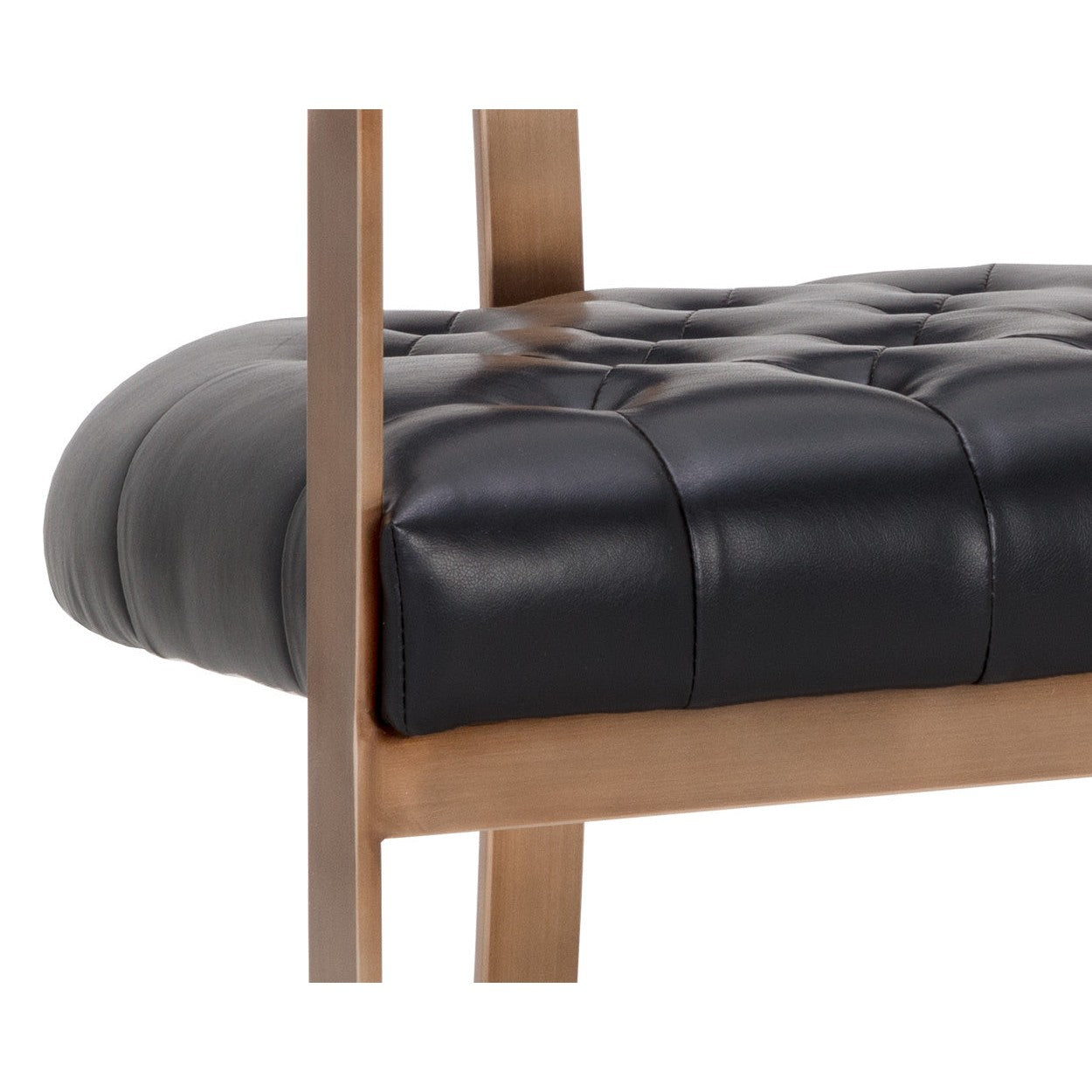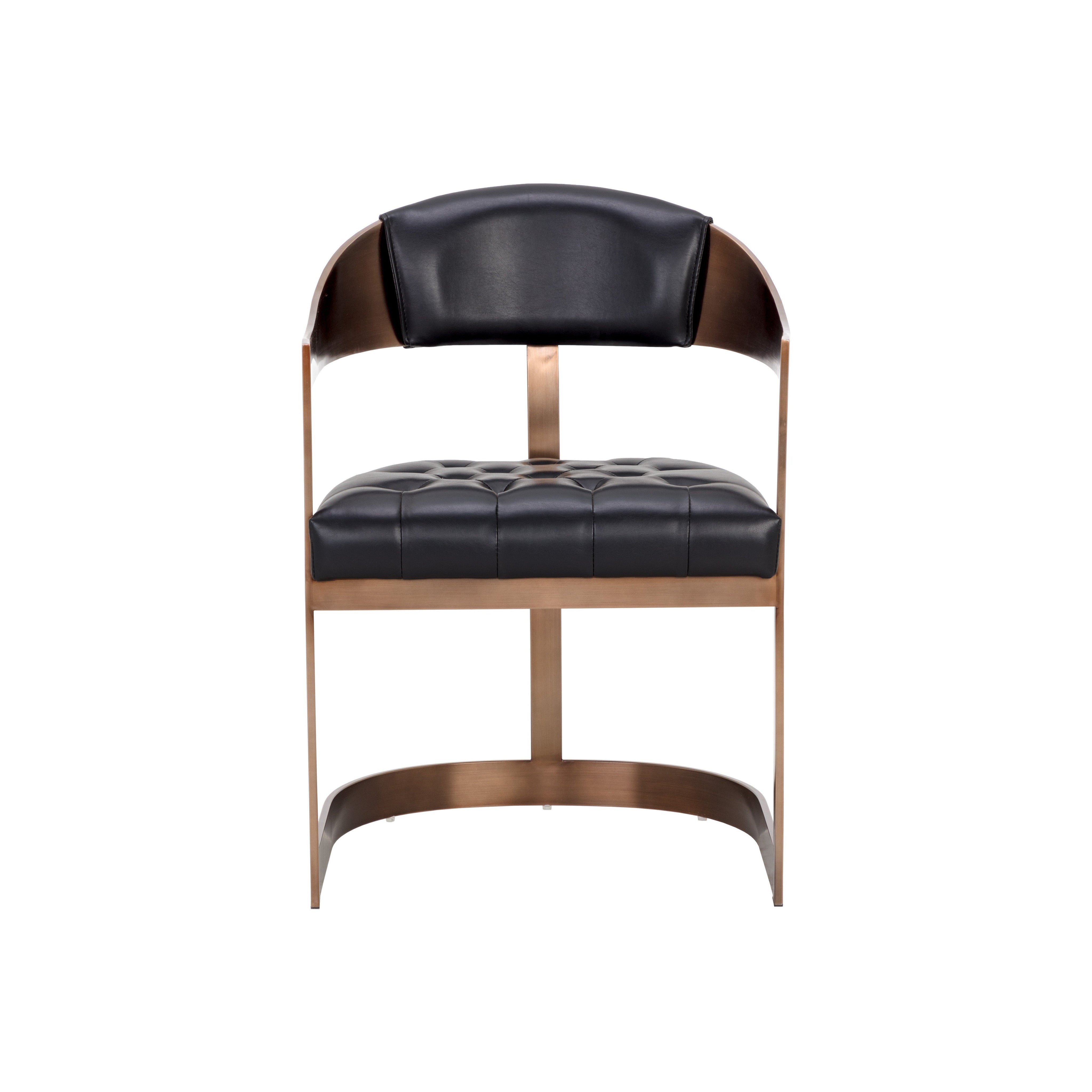 This ultra contemporary dining chair features a T-shaped back, tapered arms and an antique brass crown base. Stocked in cantina black bonded leather. Perfectly suited for various dining, kitchen and bar spaces of all sizes in either commercial or residential settings. Handle with Care: This design has been crafted with bonded leather. Bonded leather is a blend of reconstituted leather and synthetic materials crafted to reflect the natural characteristics of leather; as such, colour variations, markings, wrinkles, grooves and light scratches are acceptable and appreciated characteristics. No two pieces are alike. Visit our Product Care page for more information on how to ensure the lasting beauty of this piece.