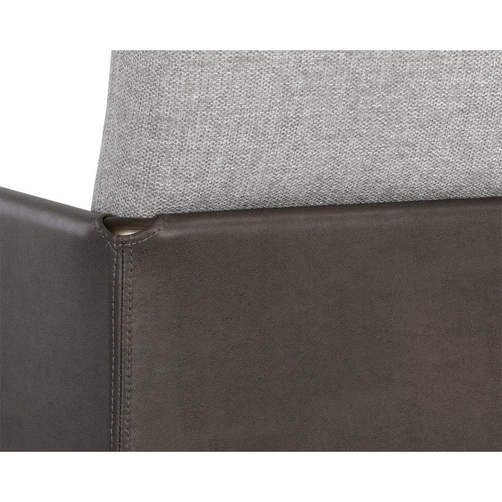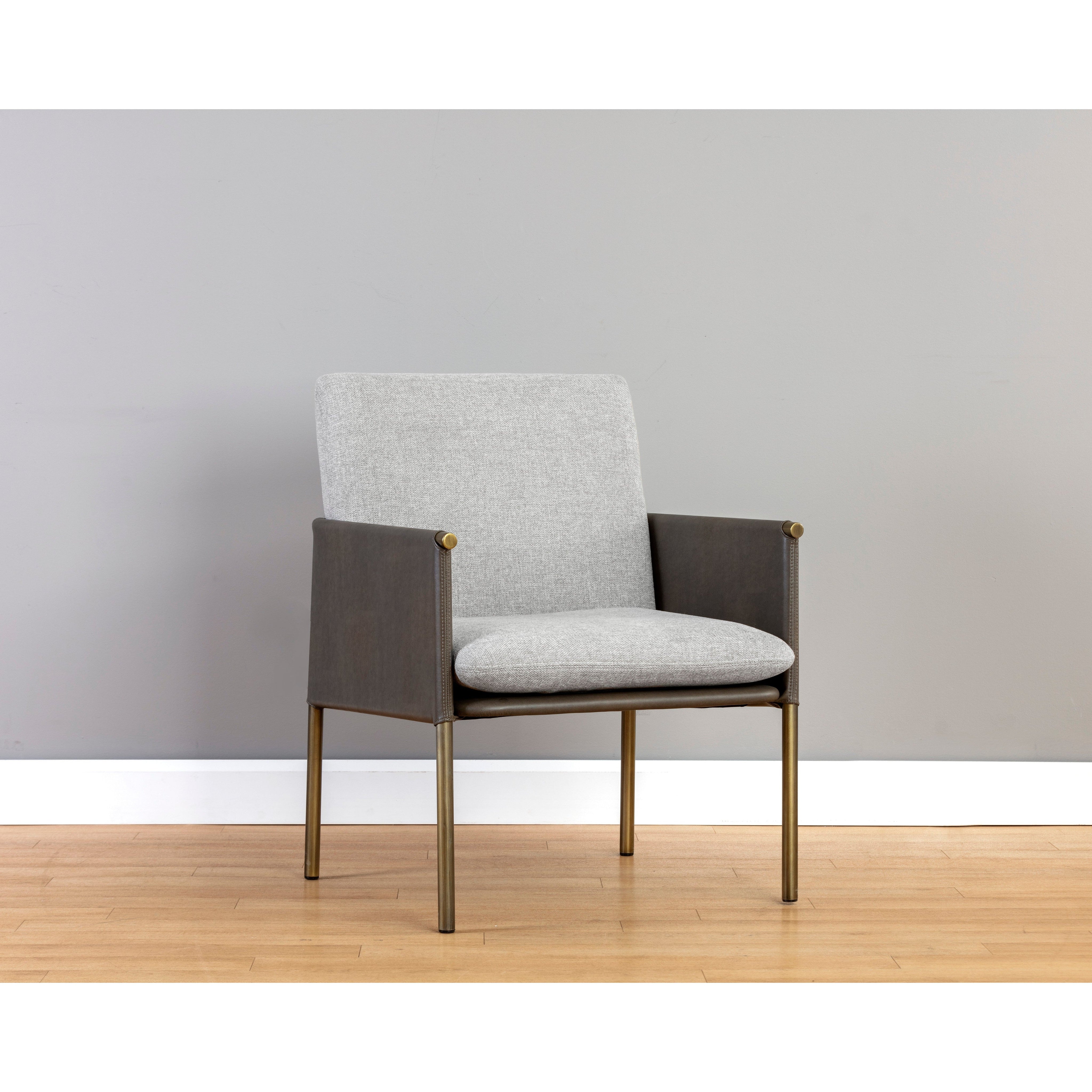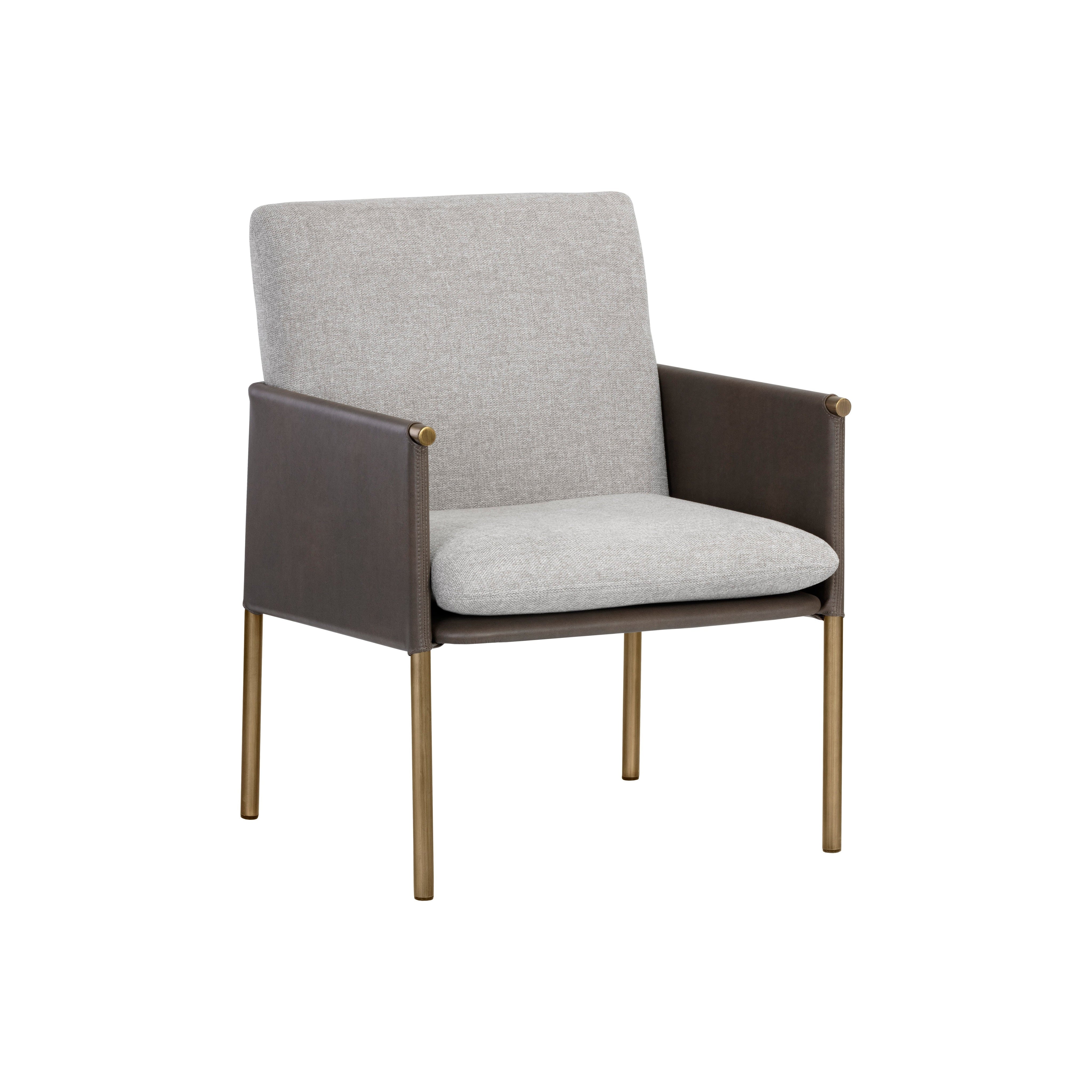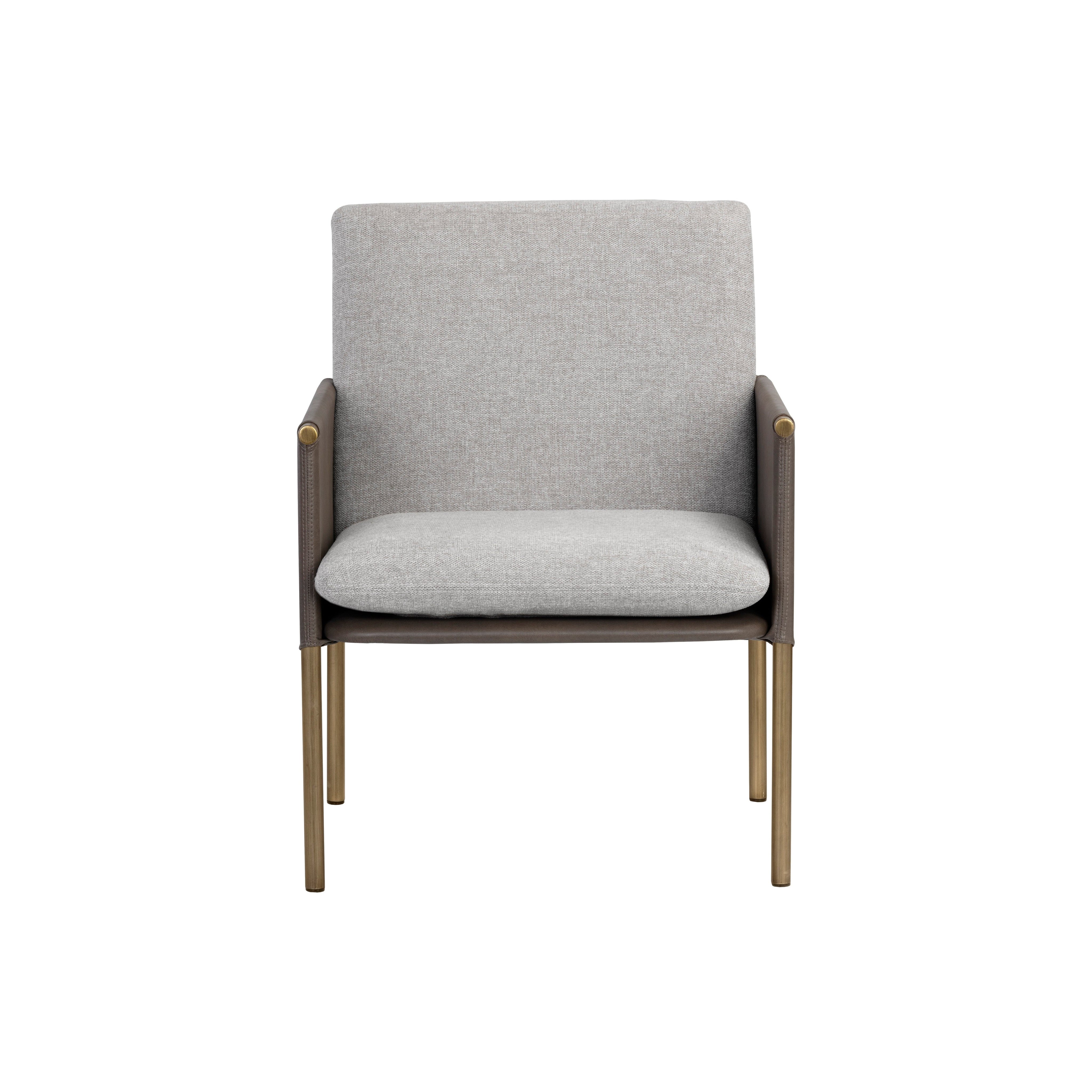 A beautiful upholstered lounge chair crafted with an intriguing mixture of textures and materials. Features a belfast grey fabric seat with a contrasting bravo ash faux leather exterior and antique brass frame. Can be paired with coordinating bench. Handle With Care: This design has been crafted with faux leather. Faux leather is manufactured to reflect the natural characteristics of leather; as such, colour variations, markings wrinkles, grooves, and light scratches are appreciated characteristics. No two pieces will be alike. Visit our Product Care page for more information on how to ensure the lasting beauty of this piece.