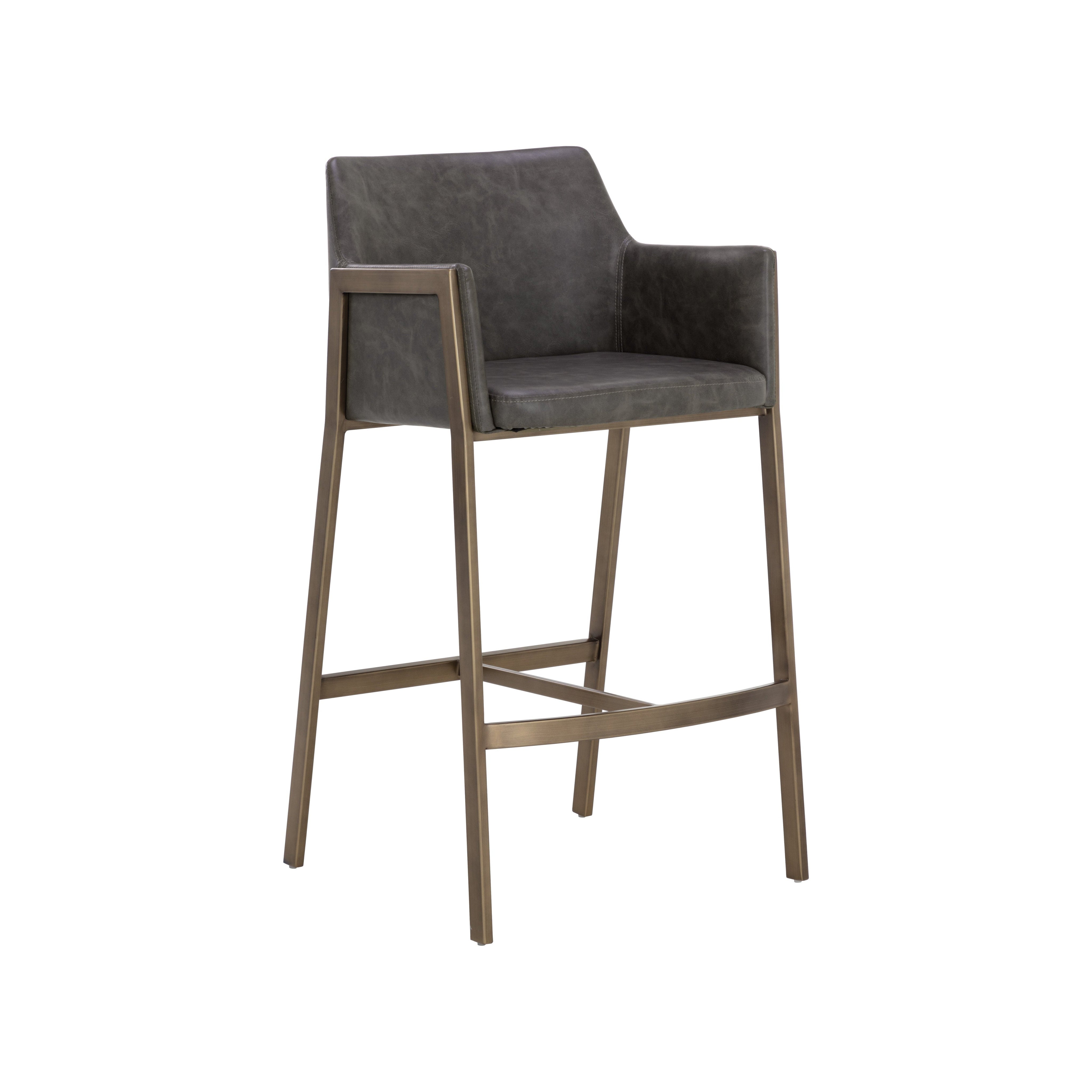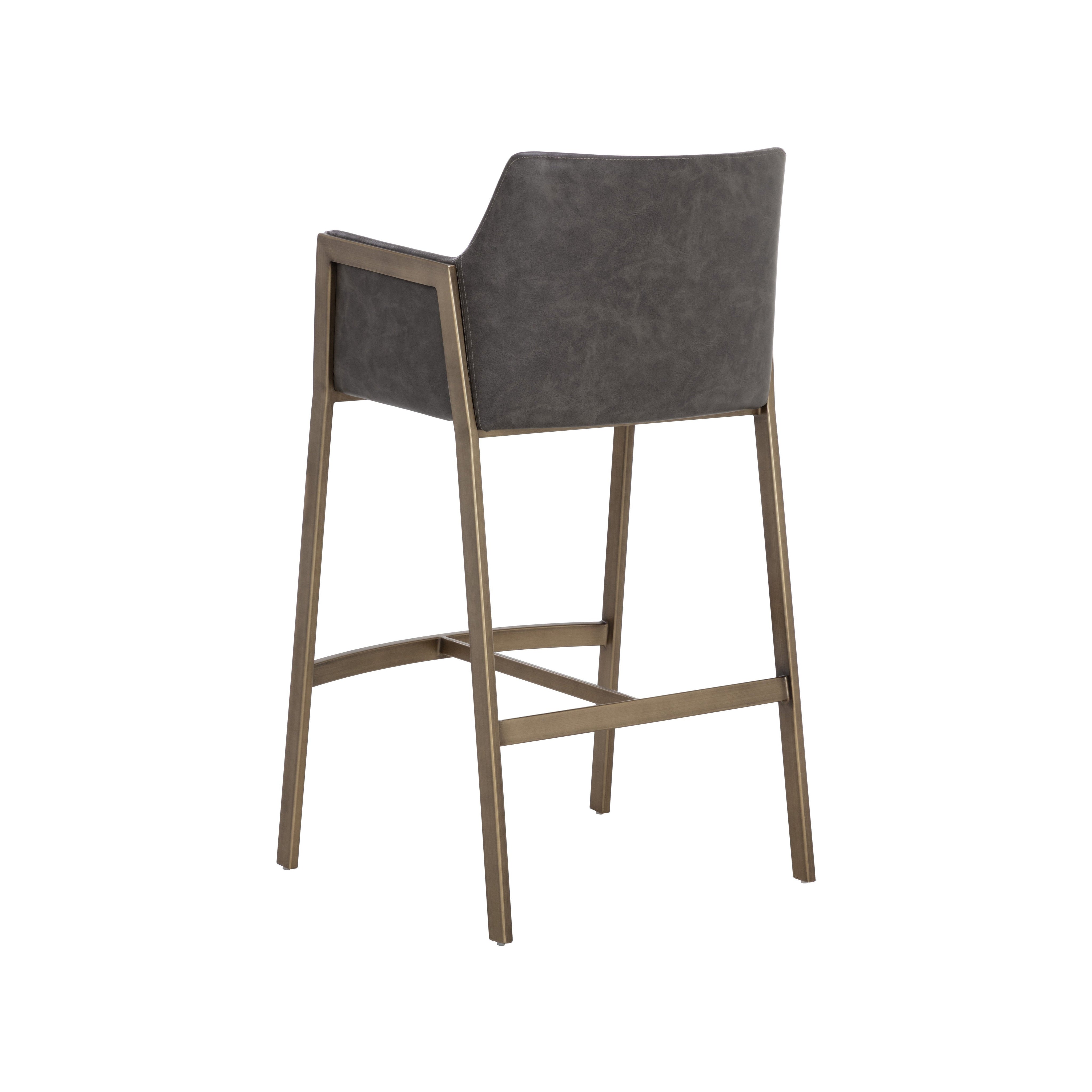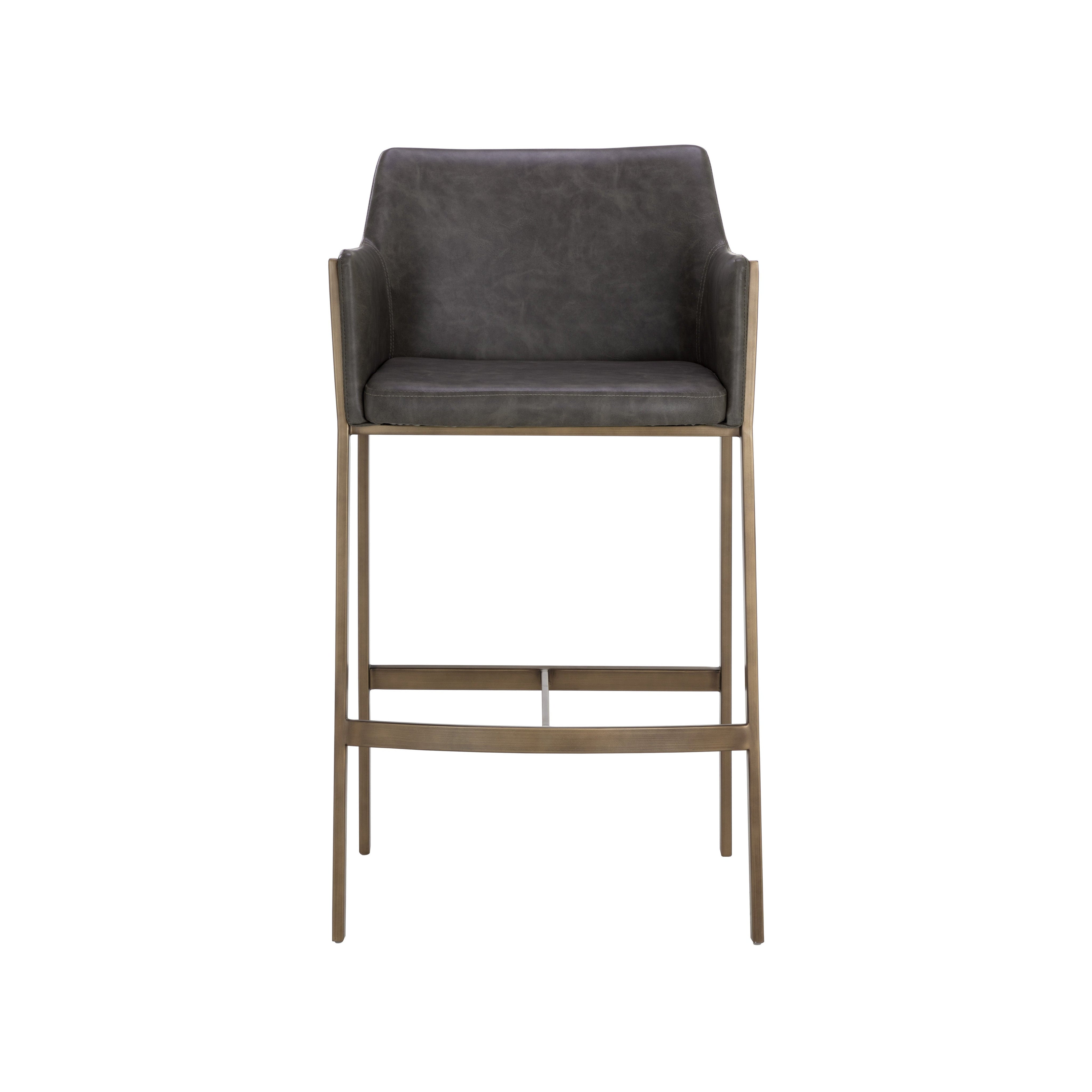 The Bernadette Barstool features a shapely design with a powder-coated antique brass frame. Upholstered in kendall grey faux leather for added style and durability. Handle With Care: This design has been crafted with faux leather. Faux leather is manufactured to reflect the natural characteristics of leather; as such, colour variations, markings wrinkles, grooves, and light scratches are appreciated characteristics. No two pieces will be alike. Visit our Product Care page for more information on how to ensure the lasting beauty of this piece.