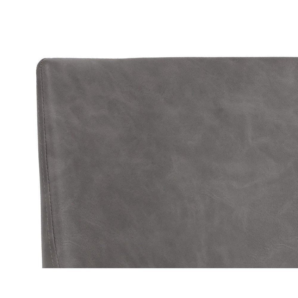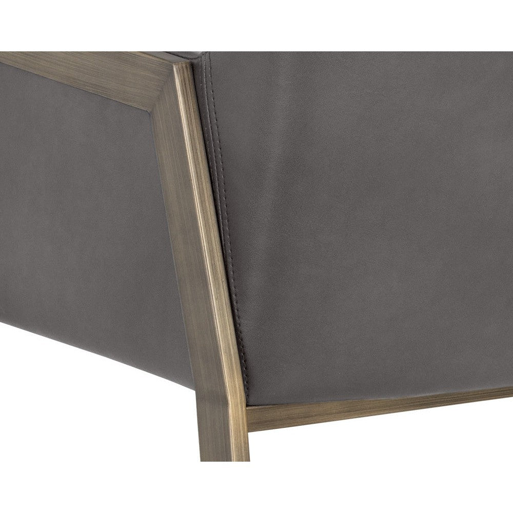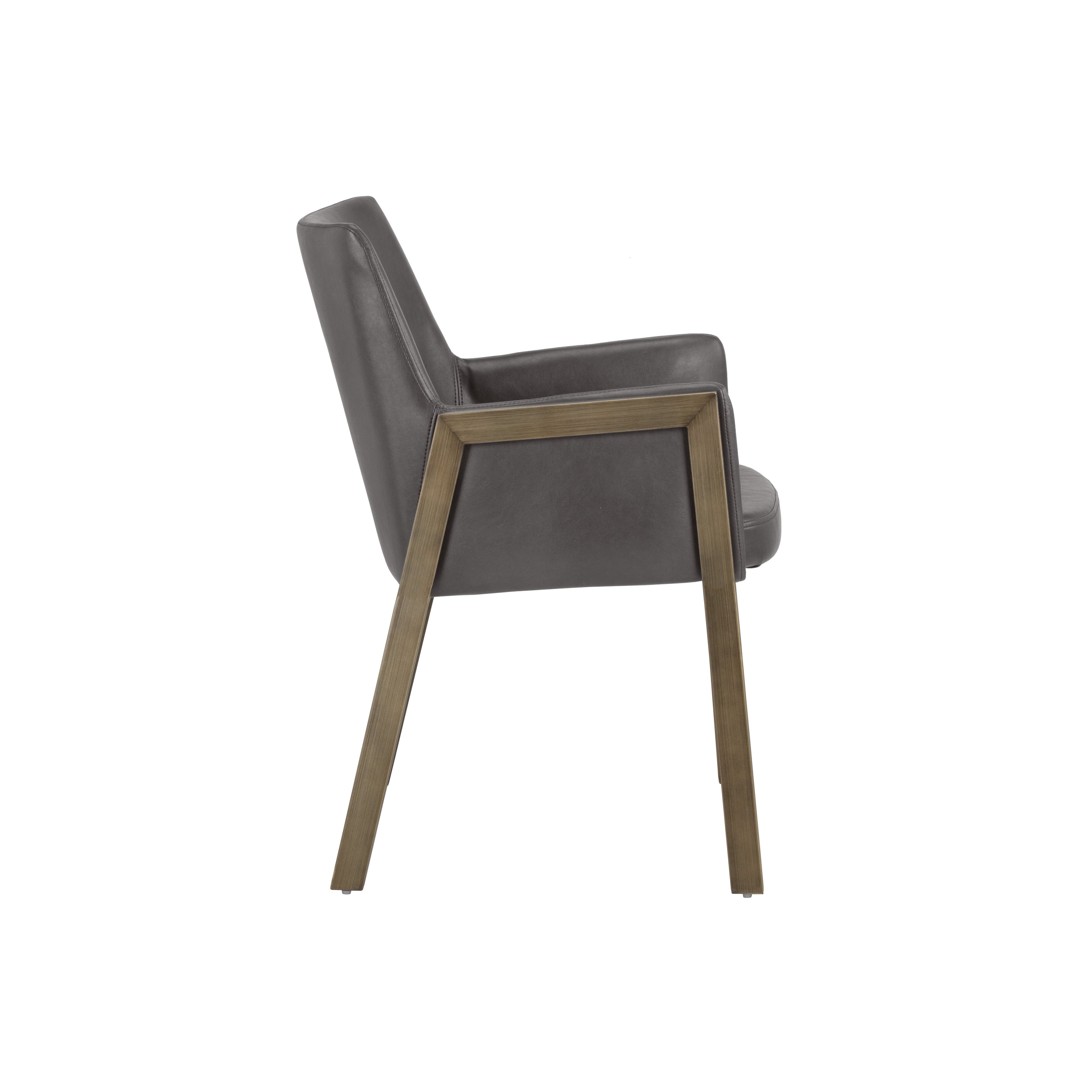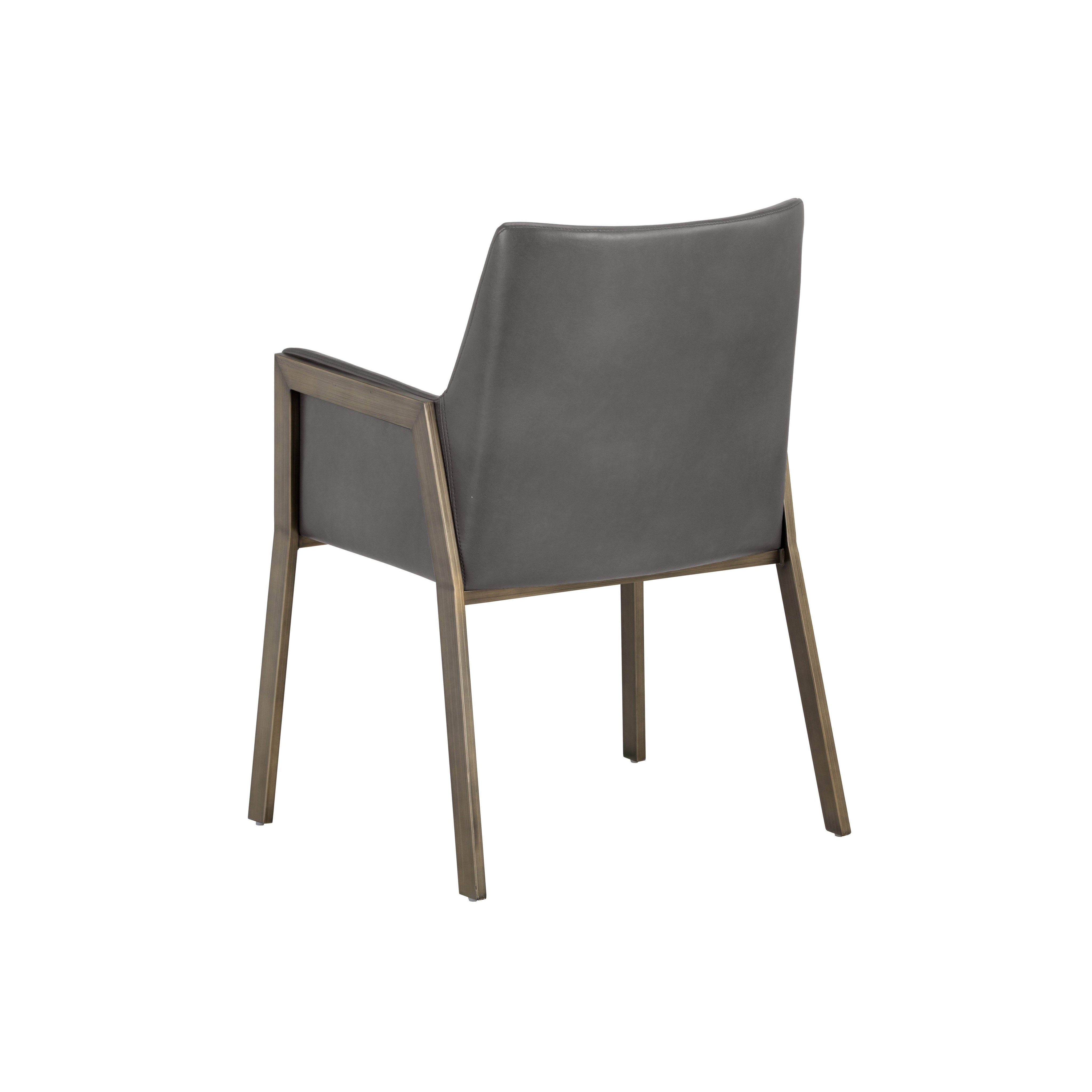 The Bernadette Dining Armchair features a shapely design with an exposed brushed antique brass frame. Upholstered in kendall grey faux leather for added style and durability. Handle With Care: This design has been crafted with faux leather. Faux leather is manufactured to reflect the natural characteristics of leather; as such, colour variations, markings wrinkles, grooves, and light scratches are appreciated characteristics. No two pieces will be alike. Visit our Product Care page for more information on how to ensure the lasting beauty of this piece.
