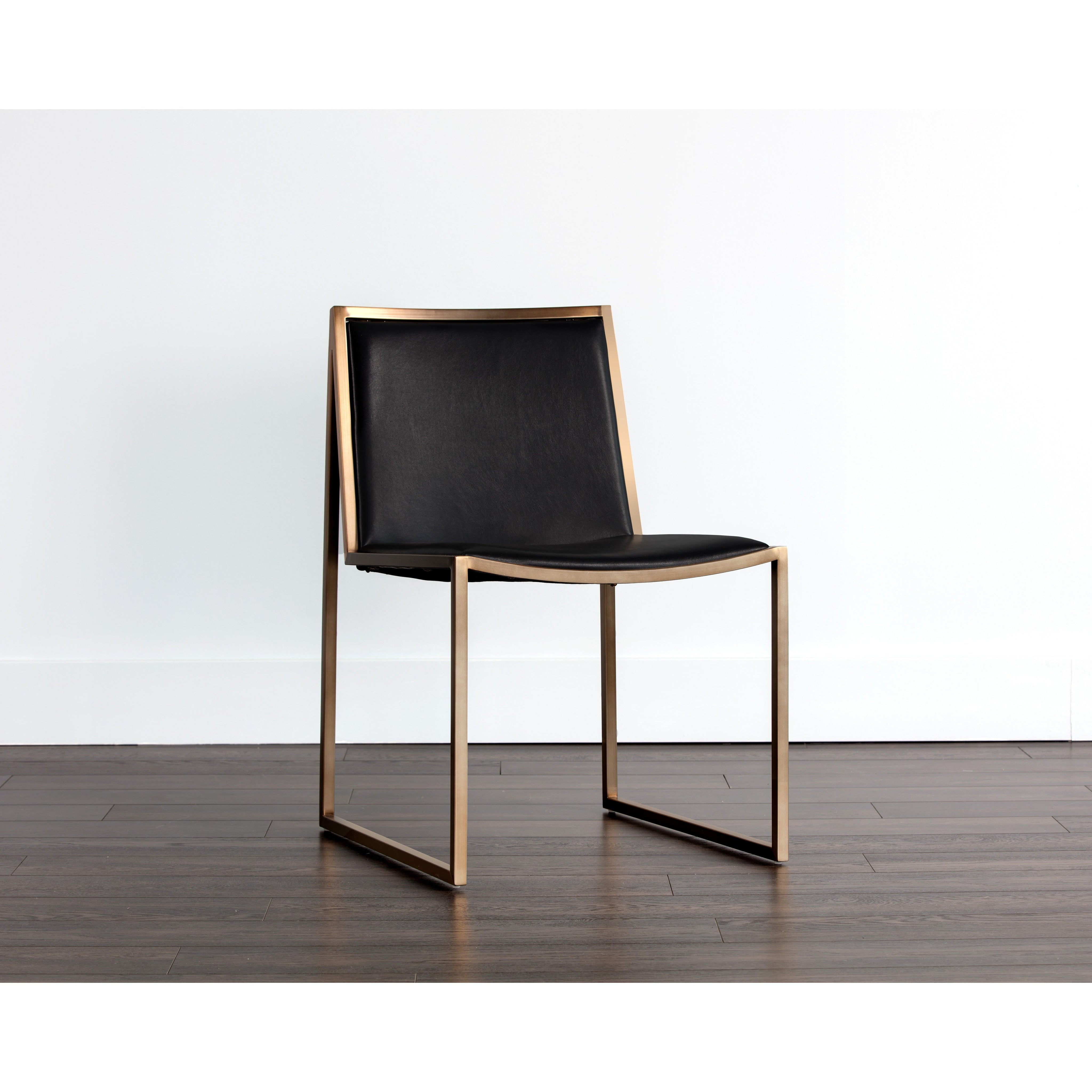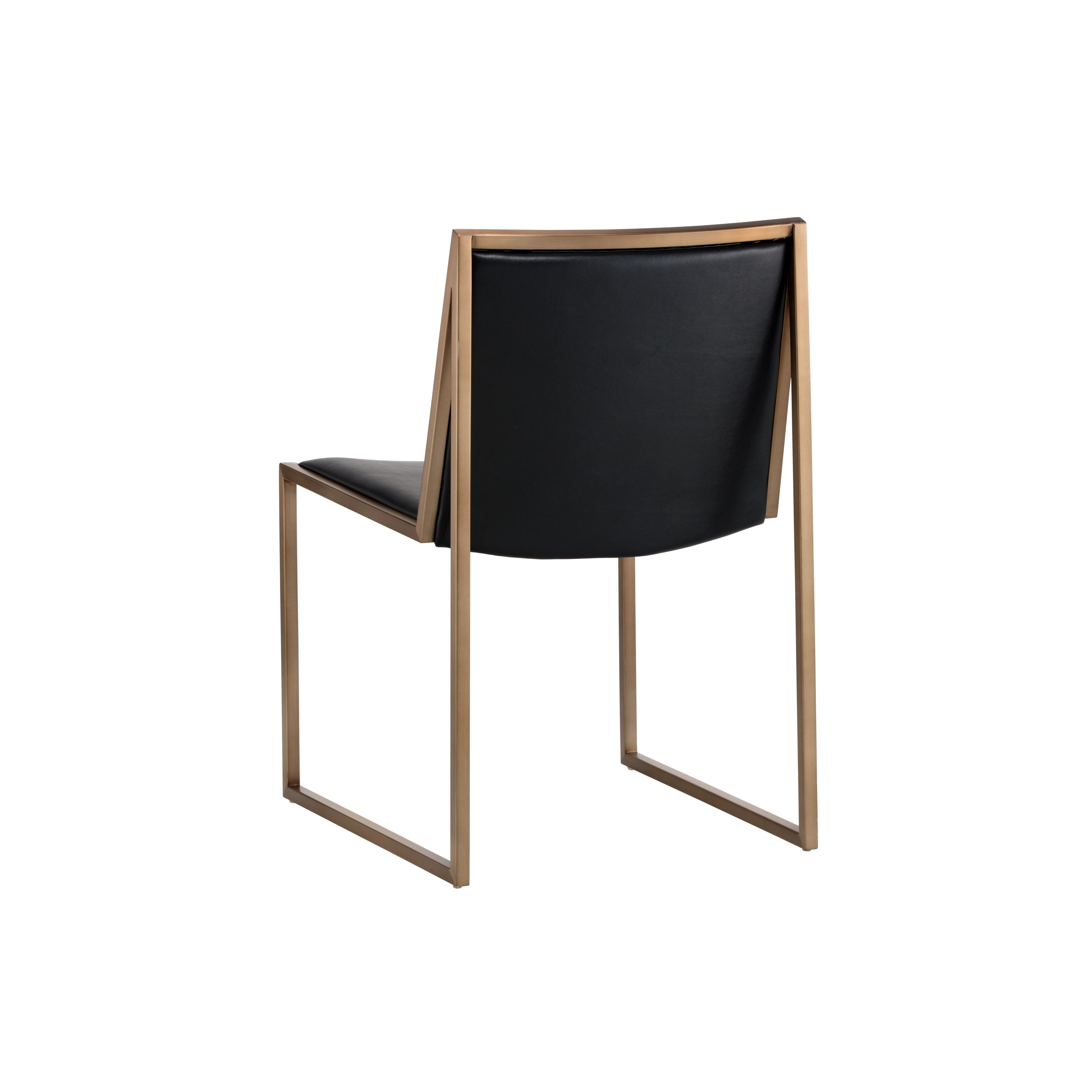 The modern styling of this dining chair will add both glamour and edge to dining spaces. Features a sleek and streamlined antique brass frame with a smooth cantina black bonded leather seat.