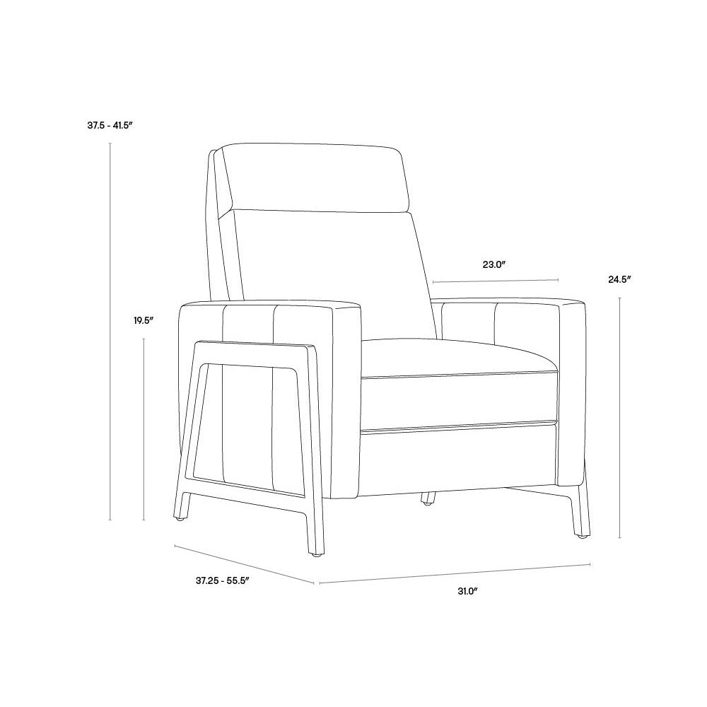 A handsome, modern recliner that will allow guests to sit back and relax. Features a comfortable seat in shalimar tabacco leather with a push back reclining mechanism. For added dimension, this recliner also features an exposed dark brown solid oak wood frame.