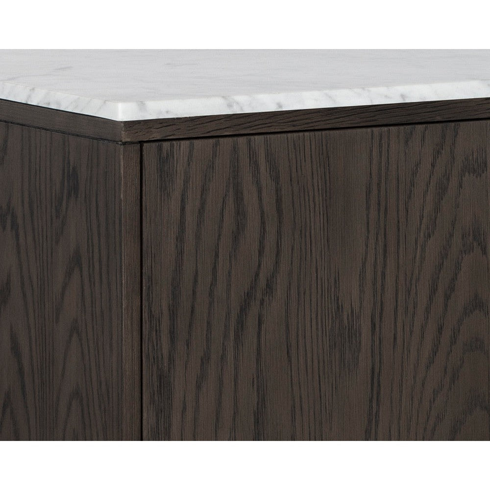Sleek and handsome, this sideboard fuses the best of mid-century and modern design. Made with a solid oak wood frame and features a beautiful white marble top. Completed with a metal base and hardware in an antique brass finish. Anti-tip kit included. As marble is a natural material, unique veining, pitting, fissures, micro-cracks and colour variations are all characteristics that add to the uniqueness and beauty of each piece. As wood is an organic, porous material, these pieces will contain natural variation of texture and may also exhibit fine indentations and cracks. Wood pieces will also display a disparity of colour and grain, and visible knots and burls that add to the character of each piece.