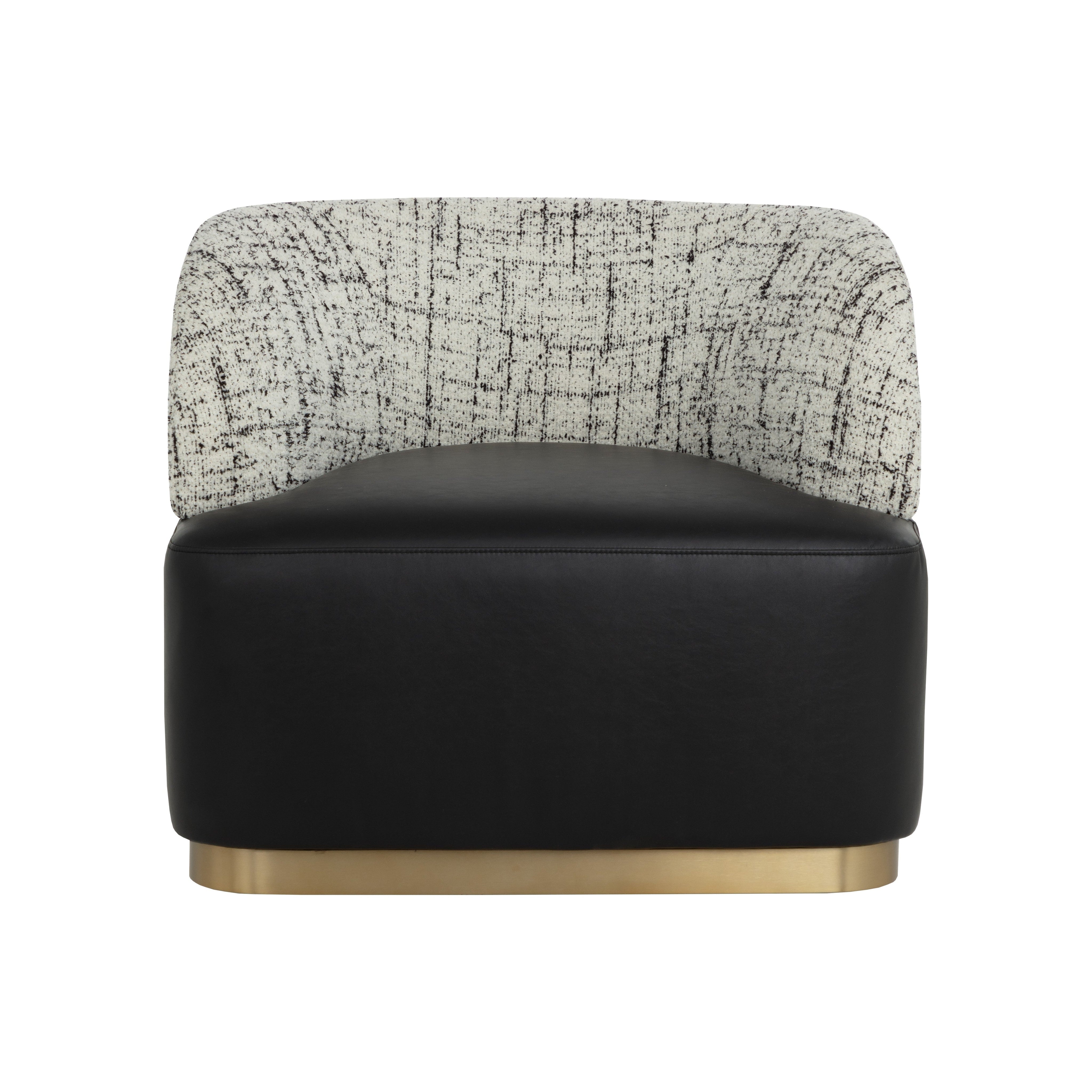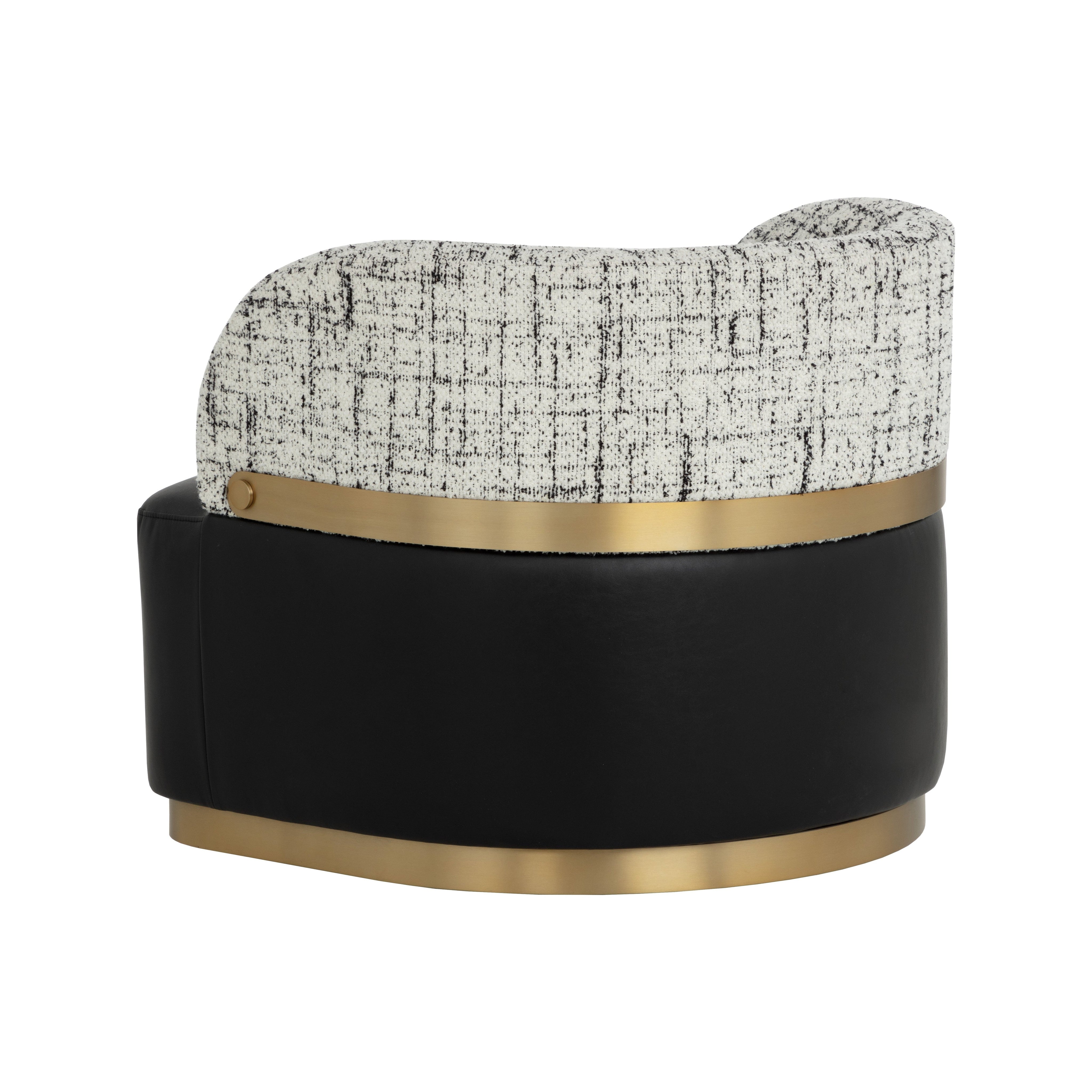 The Brinda Swivel Lounge Chair is a mid-century delight that showcases a mastery of craft and dazzling style. Upholstered in smooth bravo black leather and halton birch fabric, this gorgeous lounge chair features a gold stainless steel accent on the backrest and a matching plinth base.